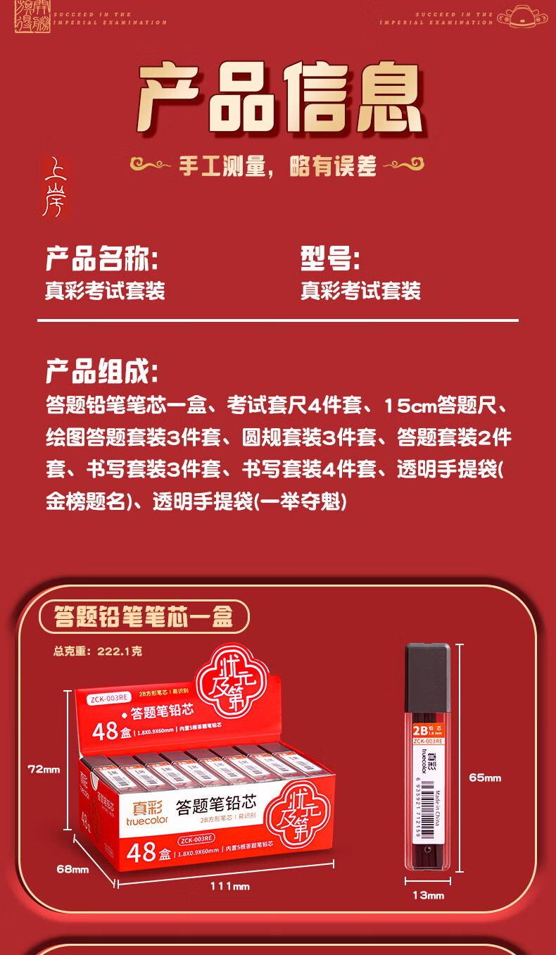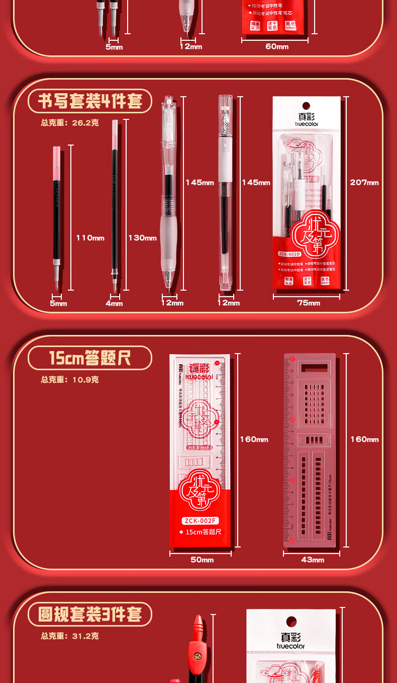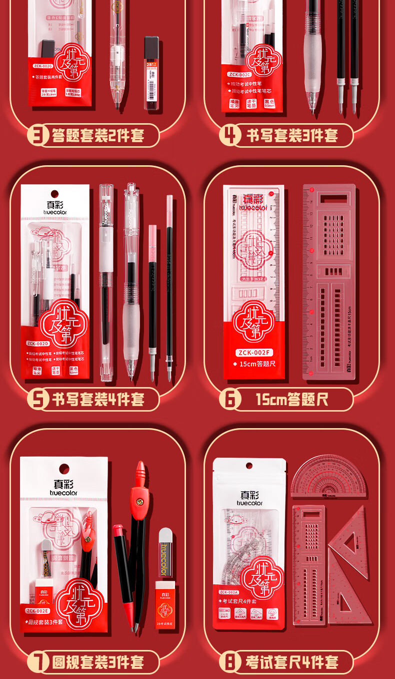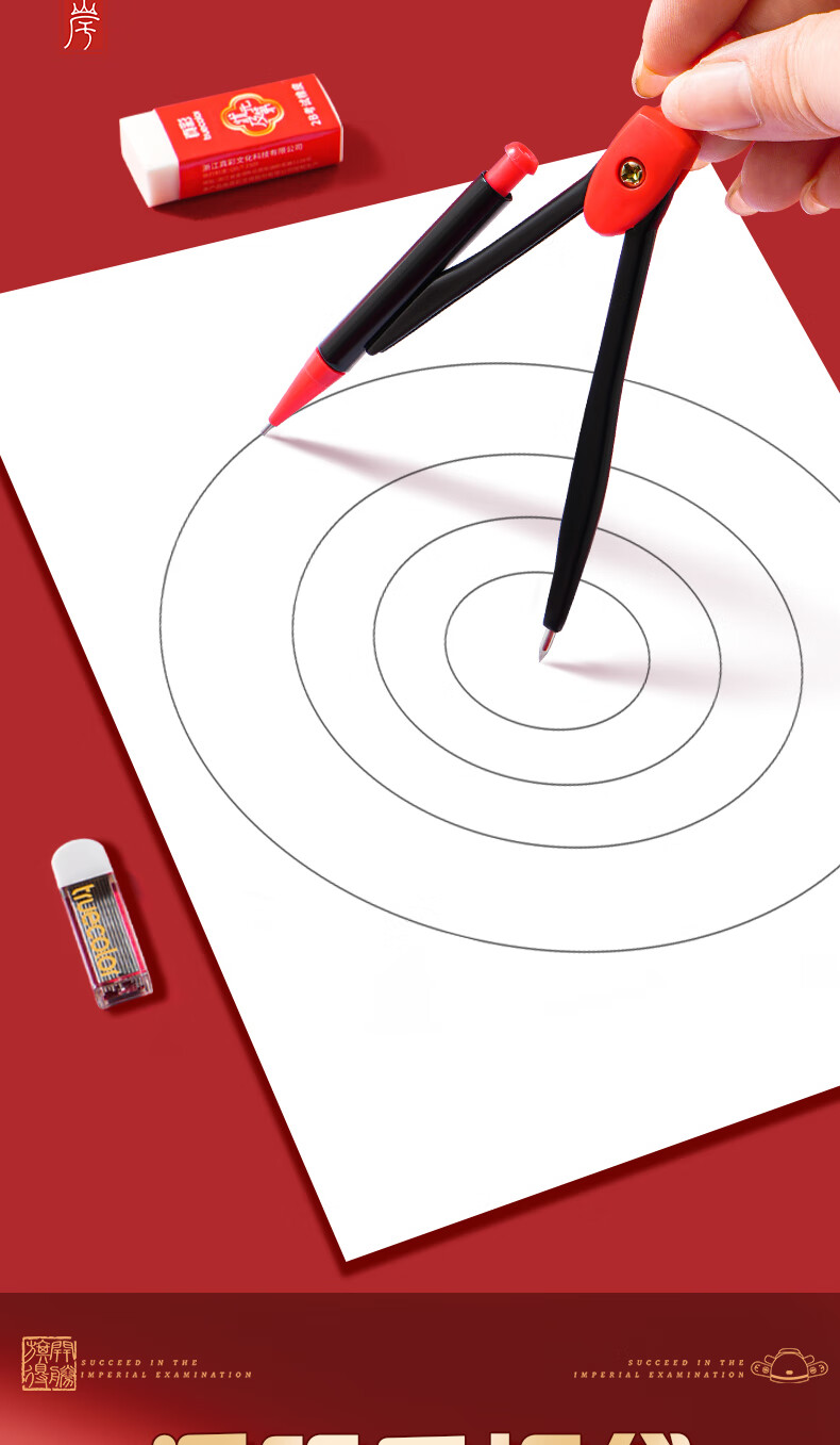 真彩(TRUECOLOR)状元红金属圆规套装 (替芯+2B橡皮)小学生初高中绘图制图工具考试专用画图作图中高考必备文具002E