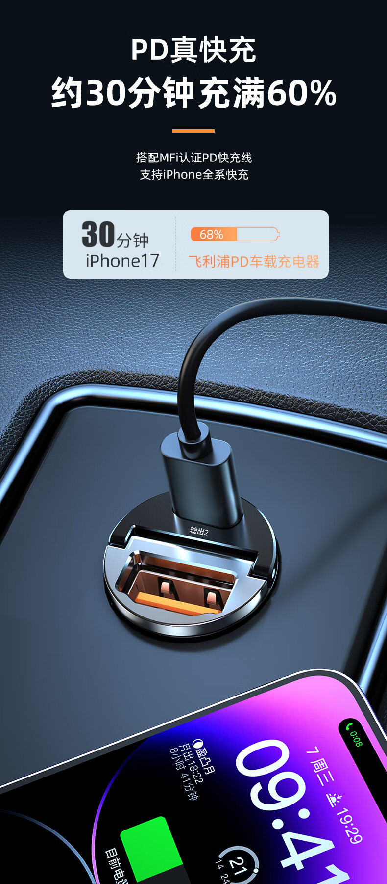 飞利浦(Philips)车载充电器苹果17/16华为超级快充点烟器一拖二车充PD隐形充电器汽车充电转换头4316黑