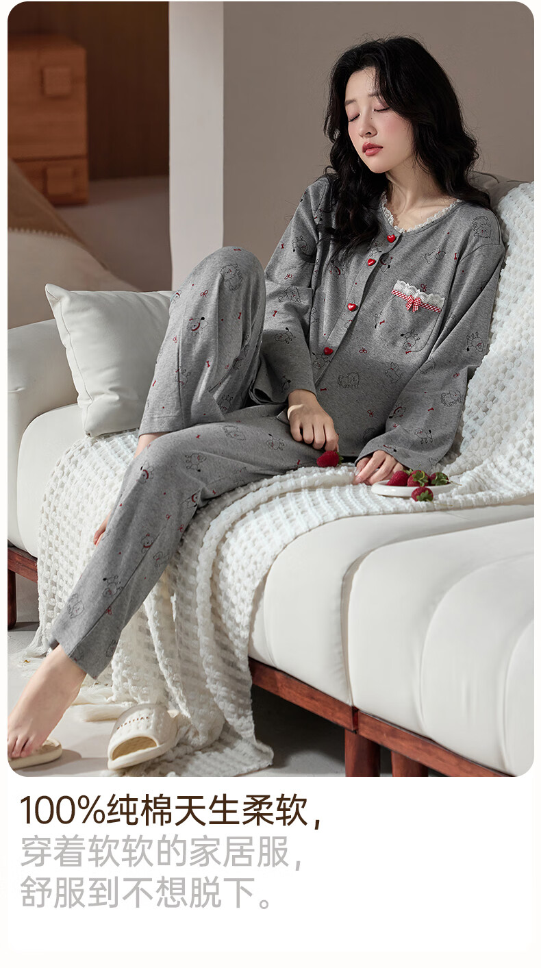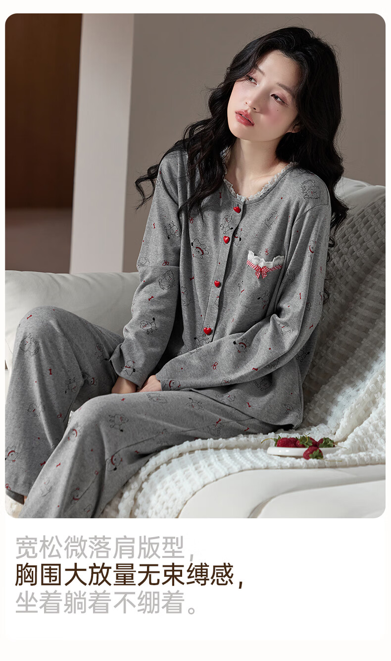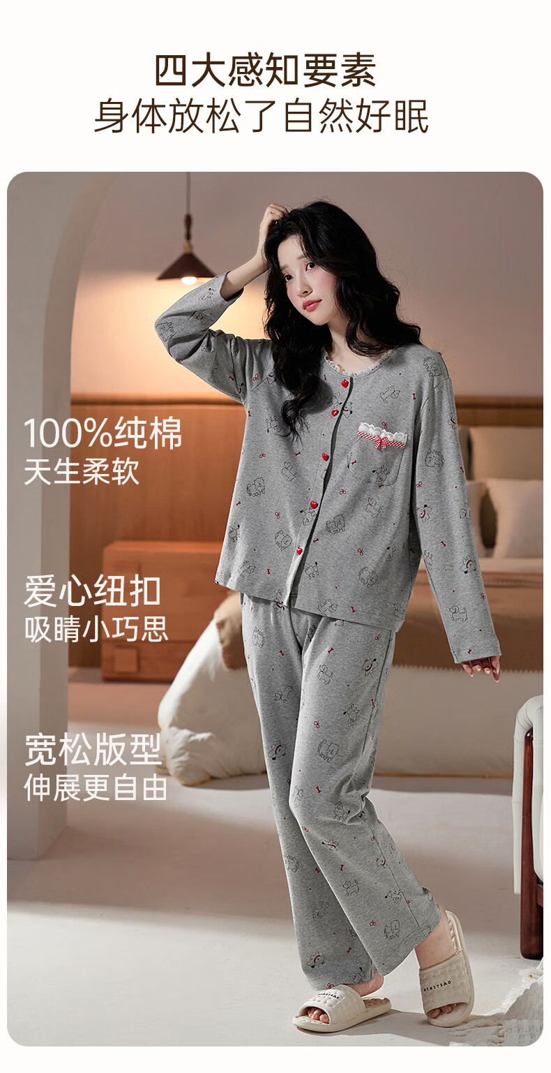 玛伦萨100%纯棉睡衣女春秋季2025新款可外穿长袖长裤圆领大码女士家居服 花灰 L