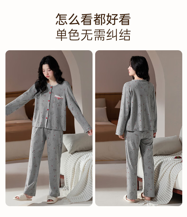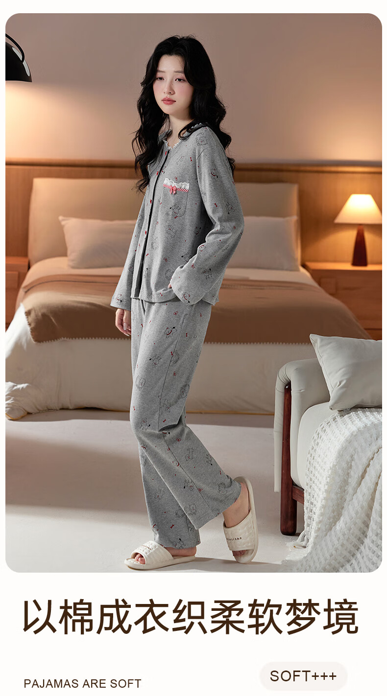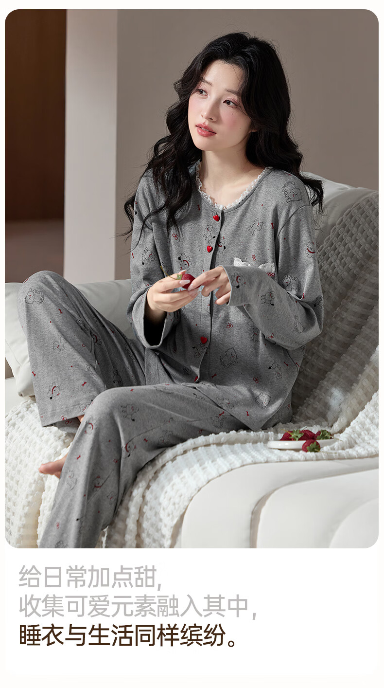 玛伦萨100%纯棉睡衣女春秋季2025新款可外穿长袖长裤圆领大码女士家居服 花灰 L