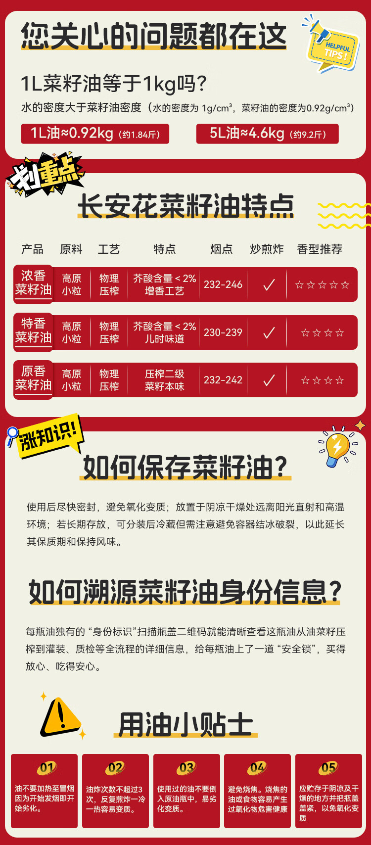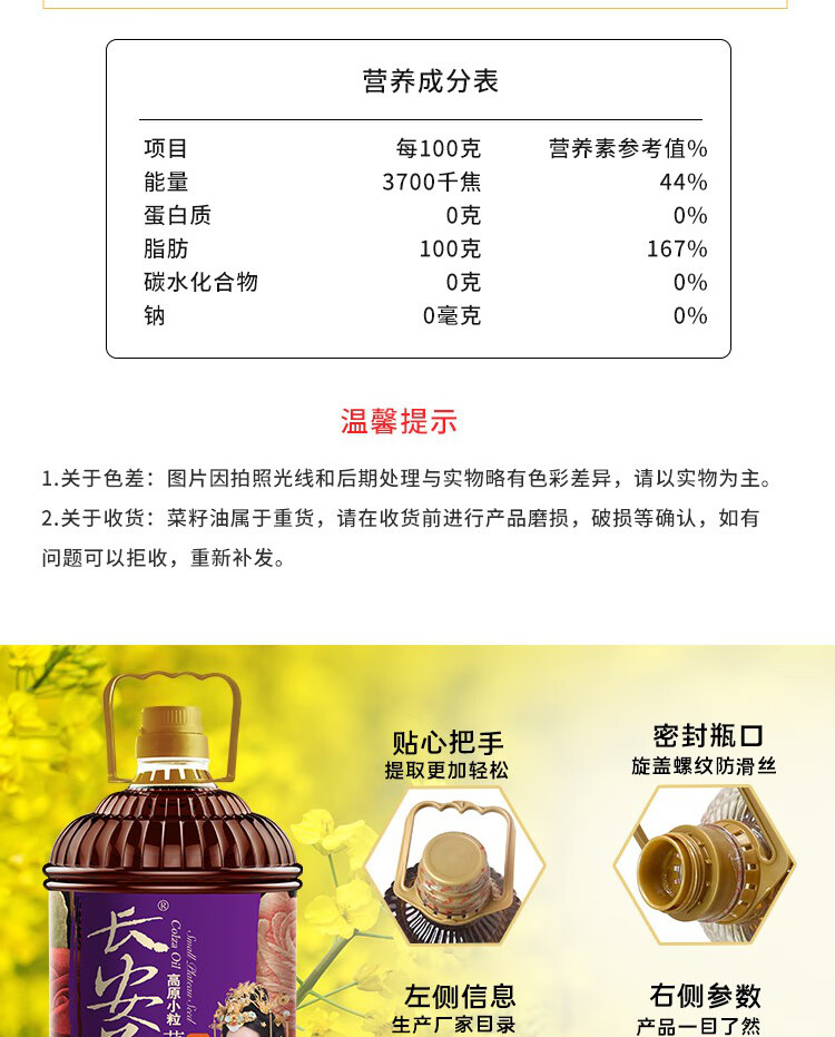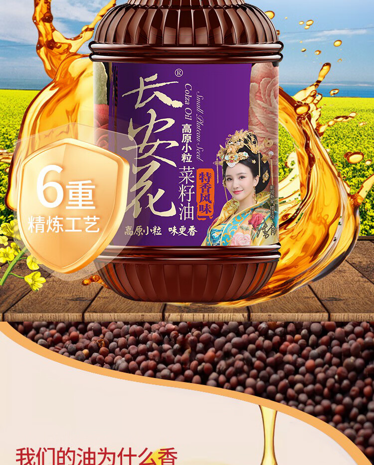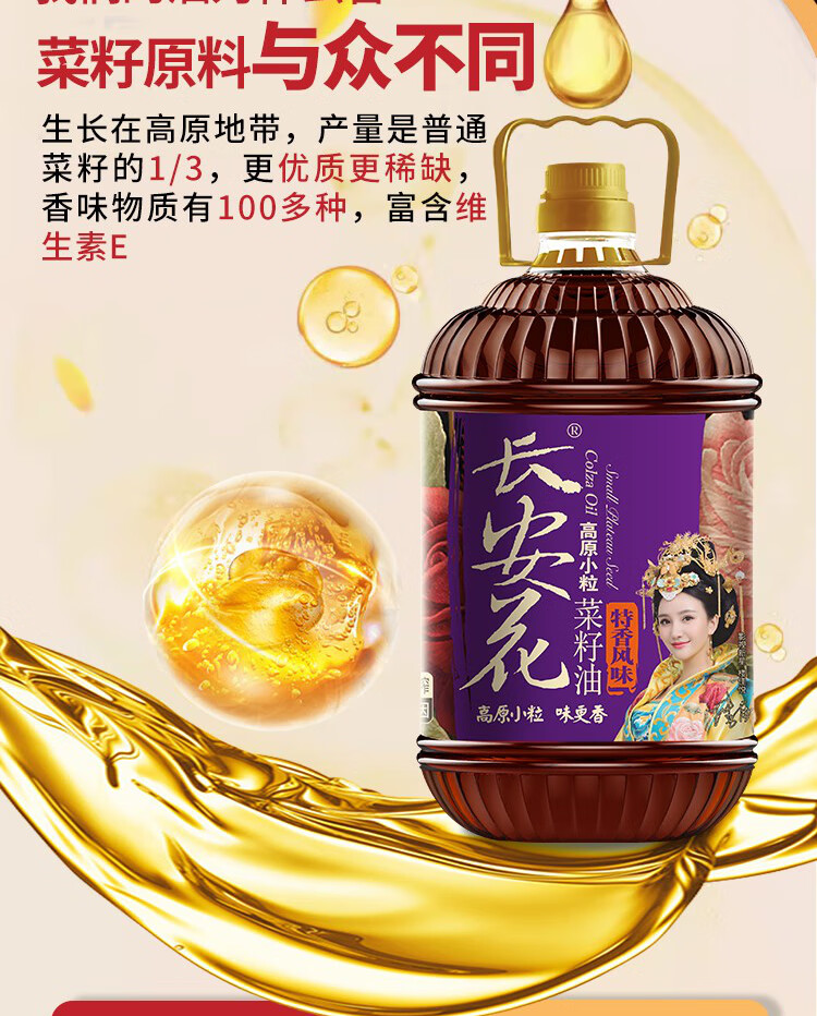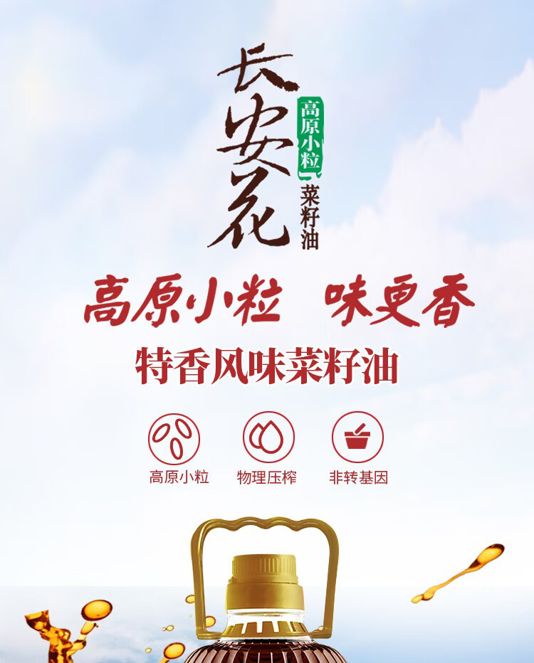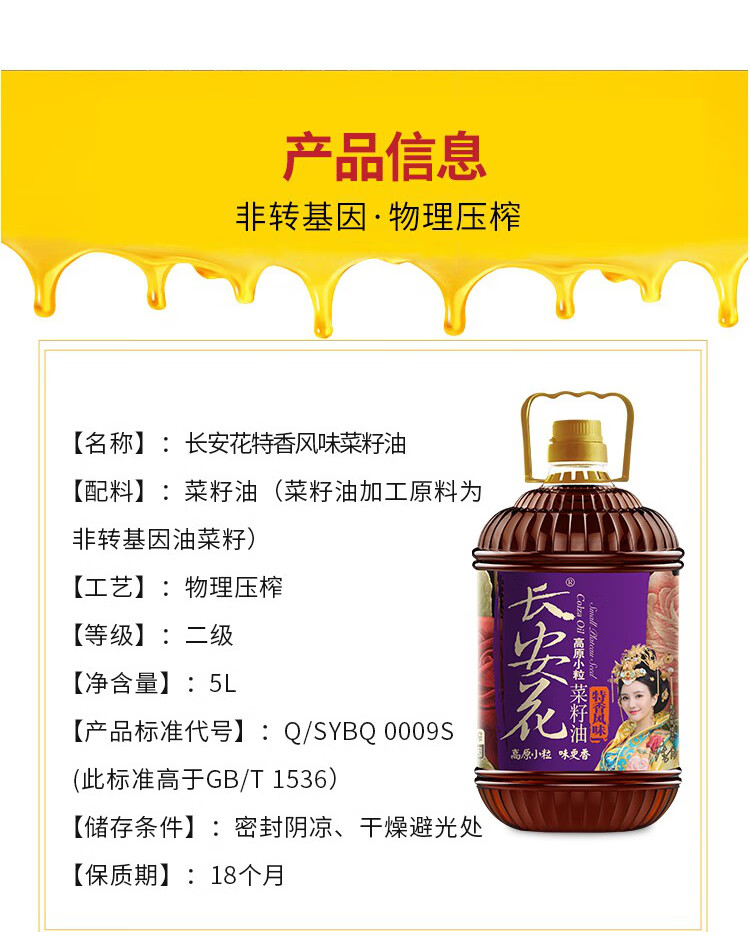 长安花 特香菜籽油5L 食用油 物理压榨 高原小粒 非转基因 陕西风味