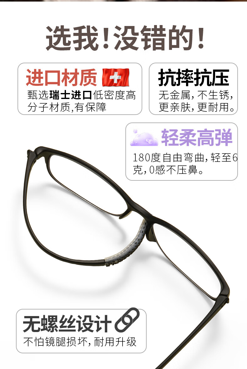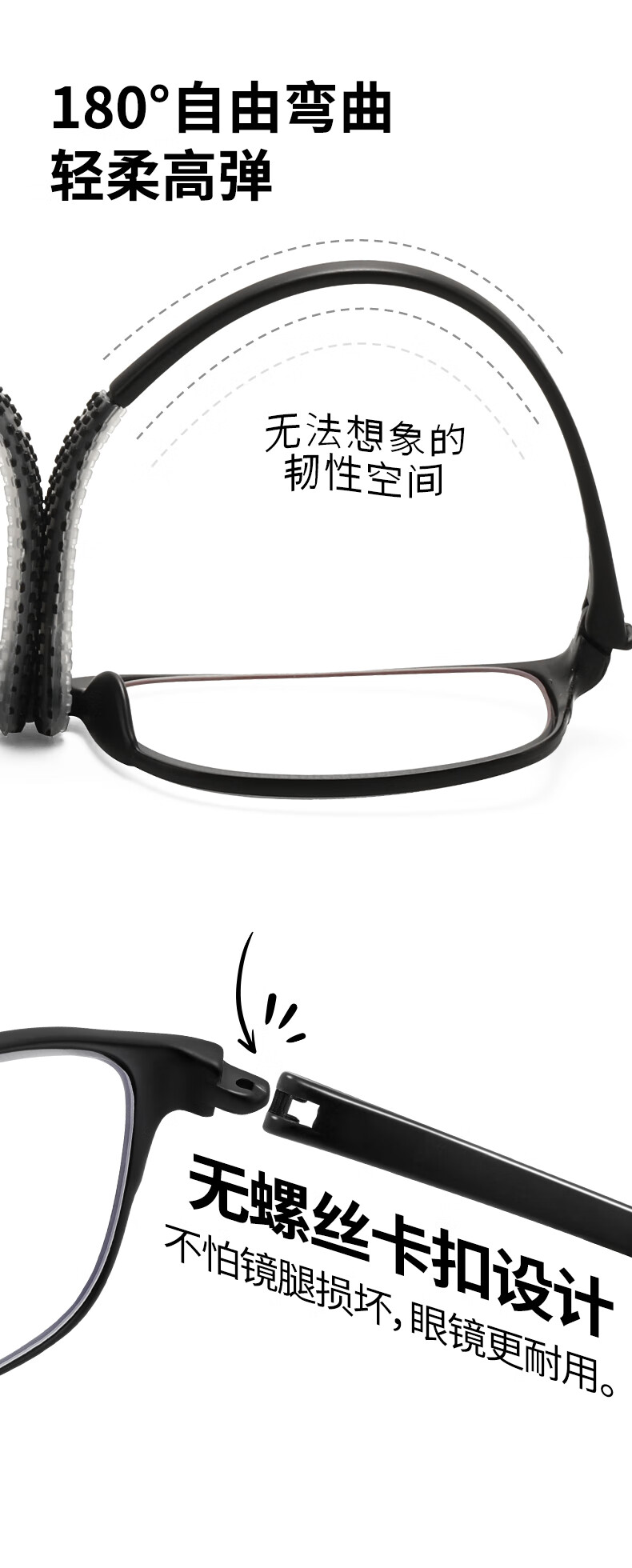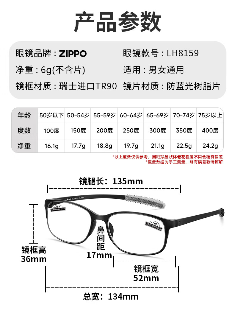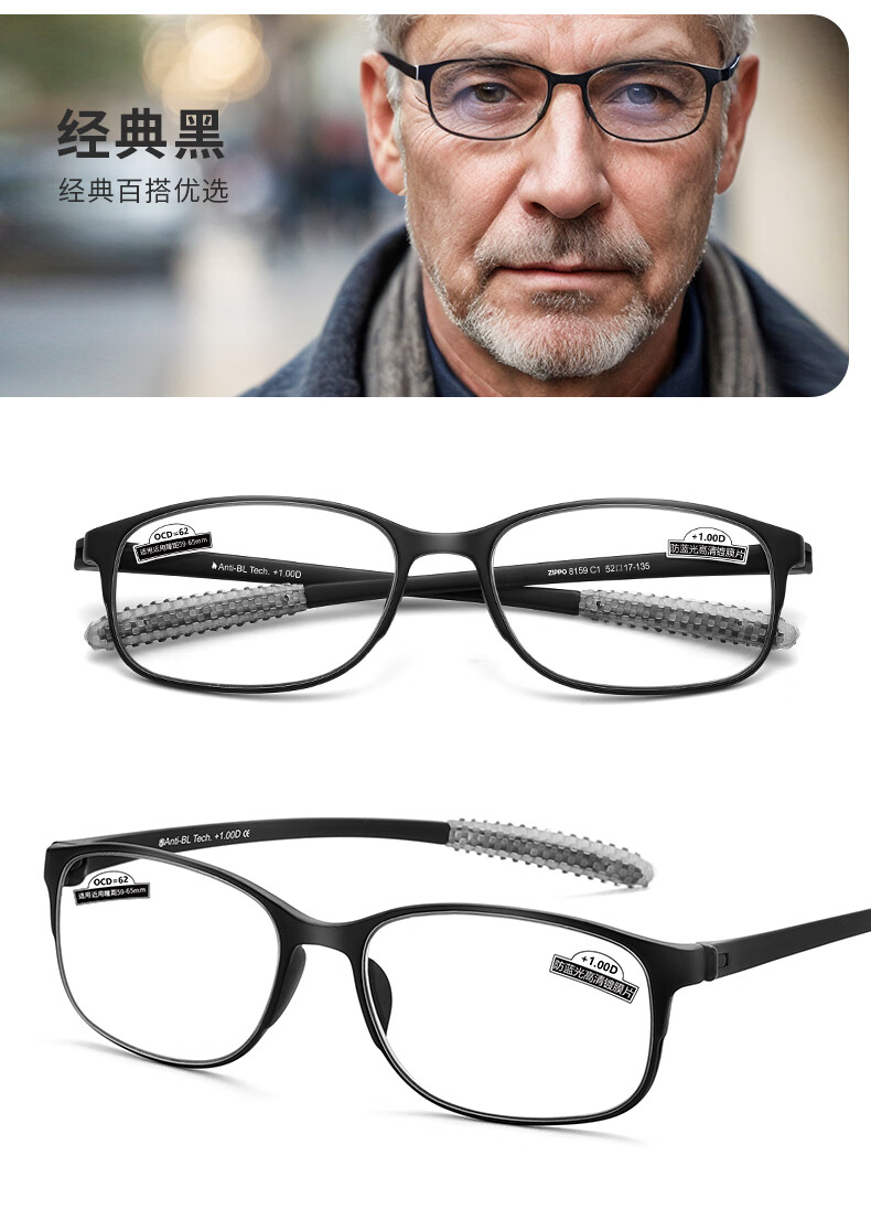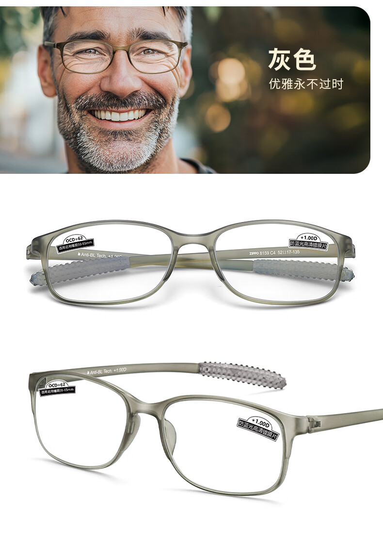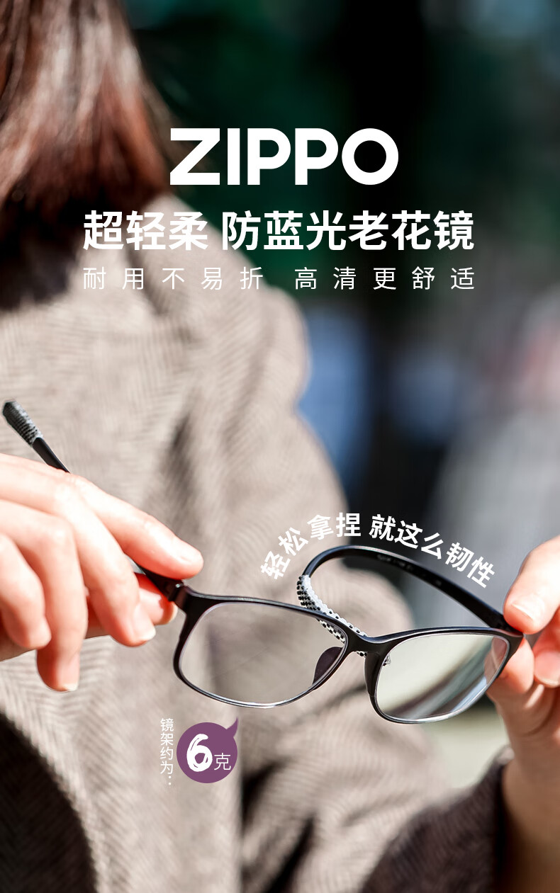 ZIPPO美国大框柔韧老花镜超轻进口材料不易折防蓝光眼镜男女 200度