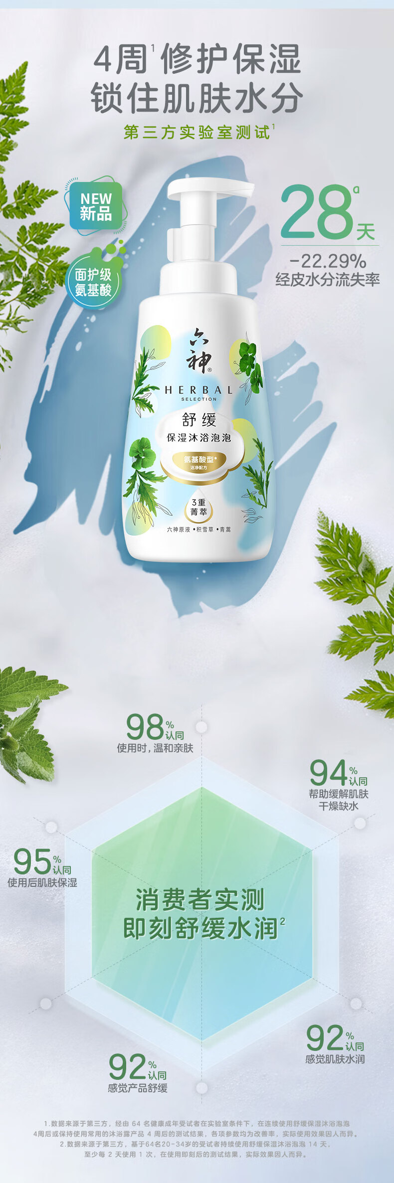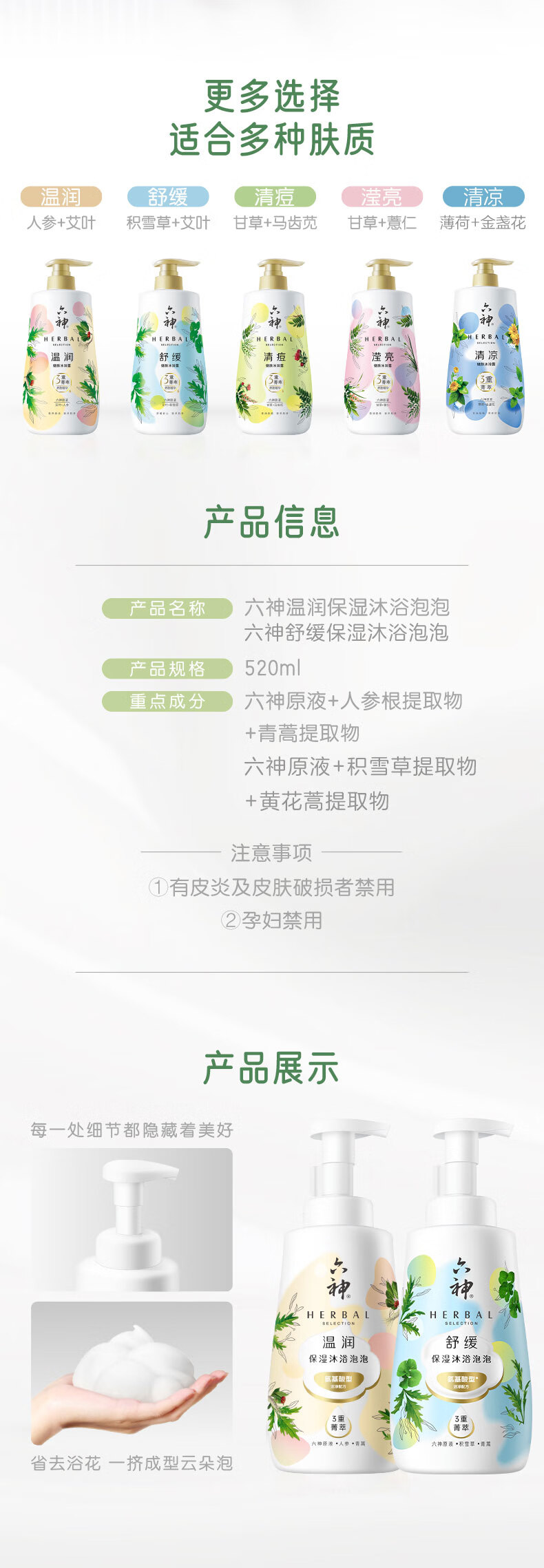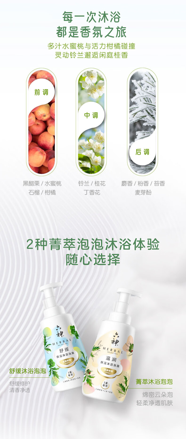 六神菁萃舒缓保湿泡泡香氛沐浴露520ml男女士氨基酸舒缓修护 清香净透
