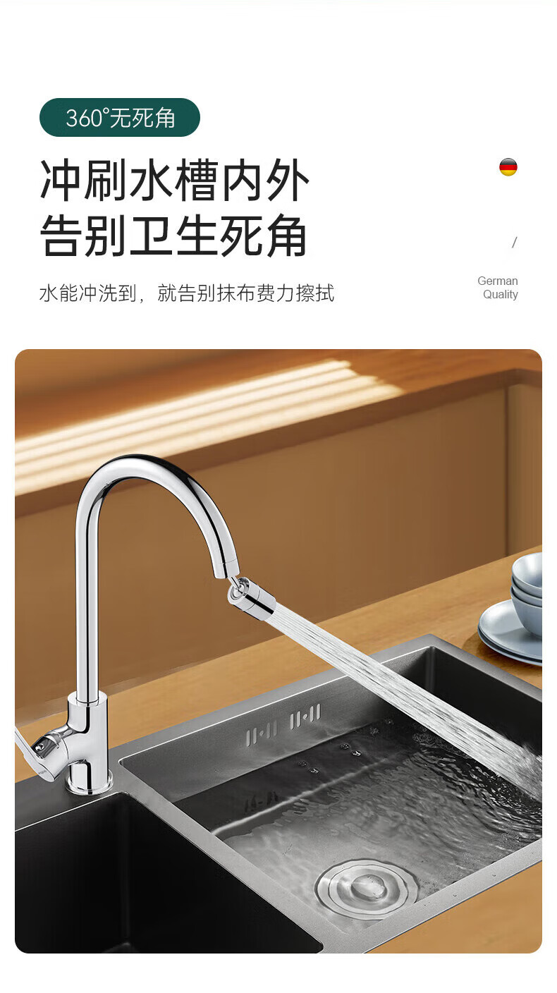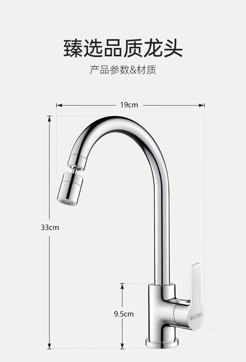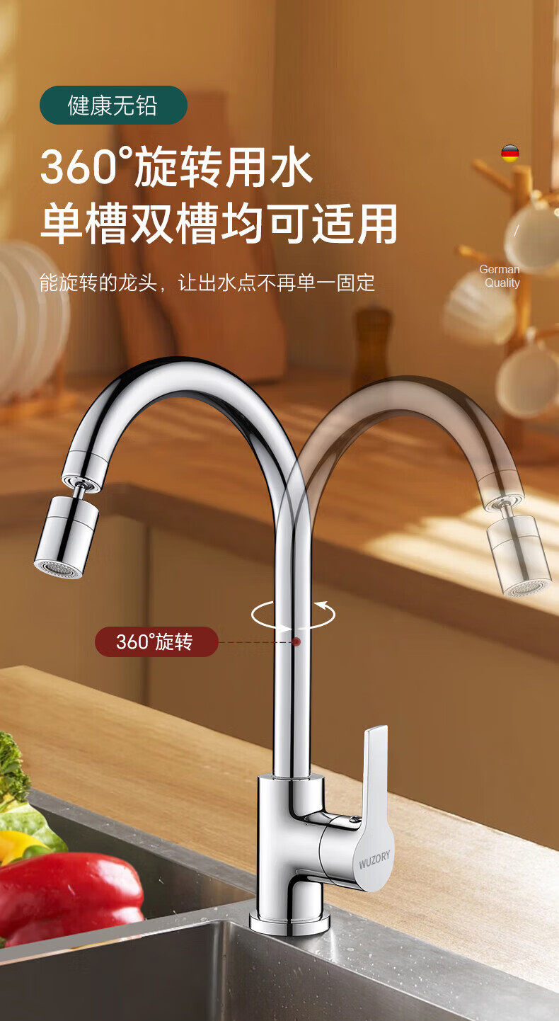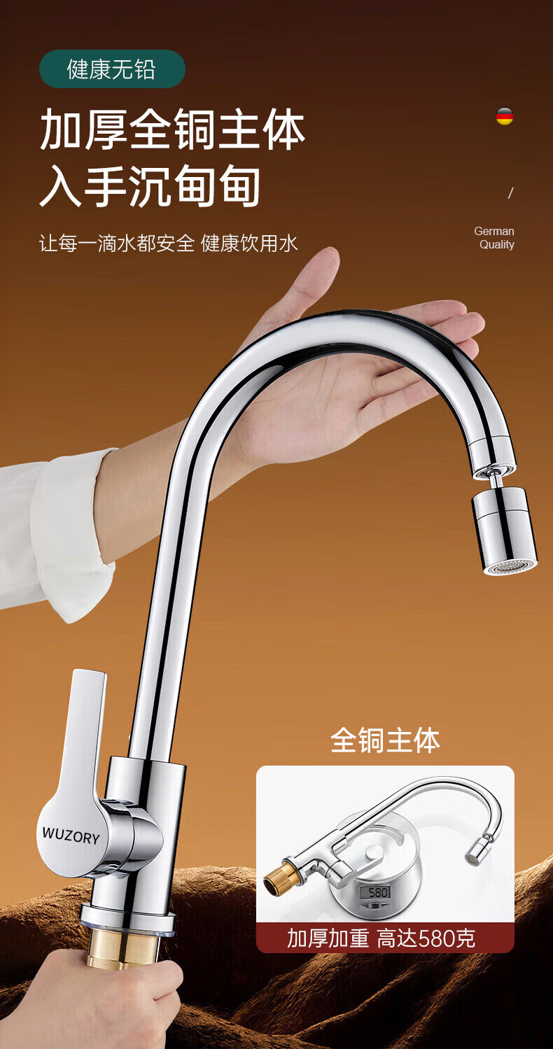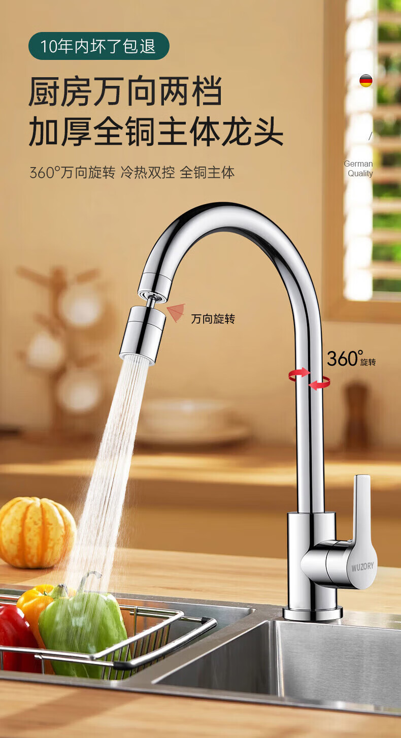 WUZORY【德国】全铜厨房水龙头冷热水二合一360°旋转防溅洗菜盆水龙头 【全铜主体】两档水龙头 全铜加厚丨配80CM防爆进水管*2