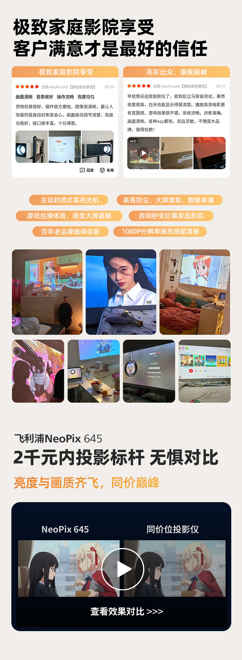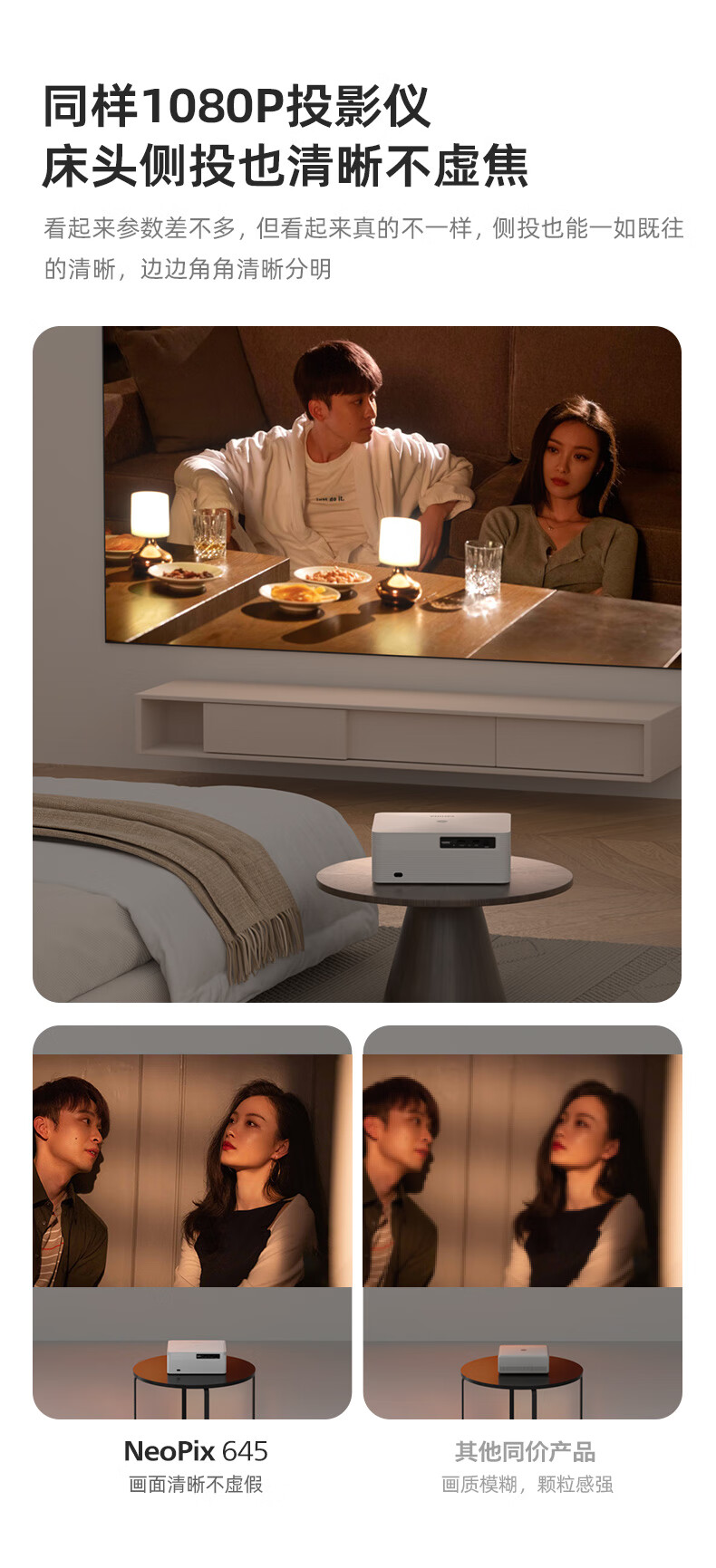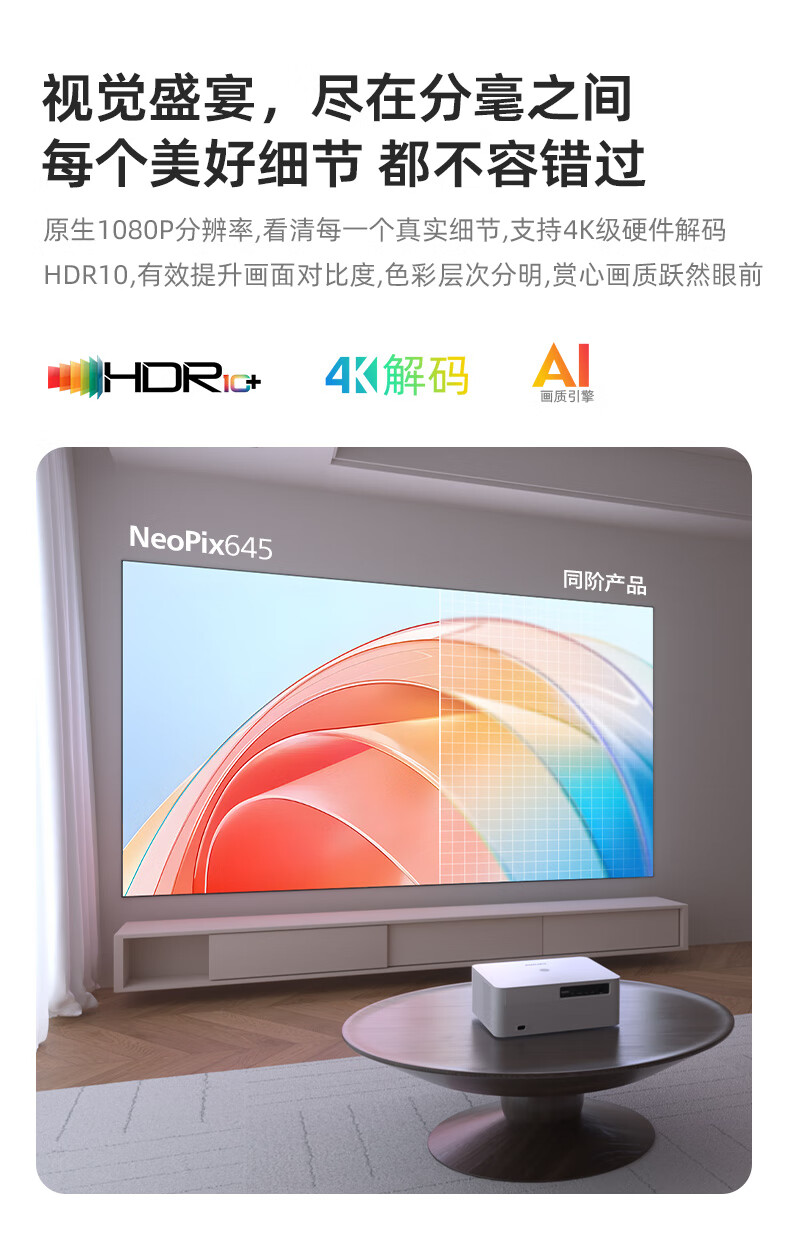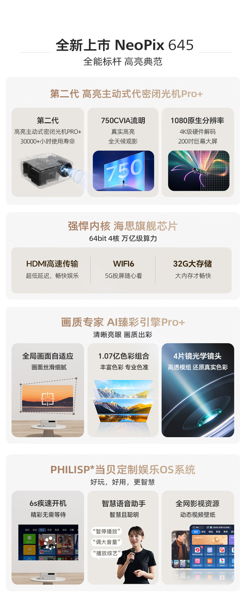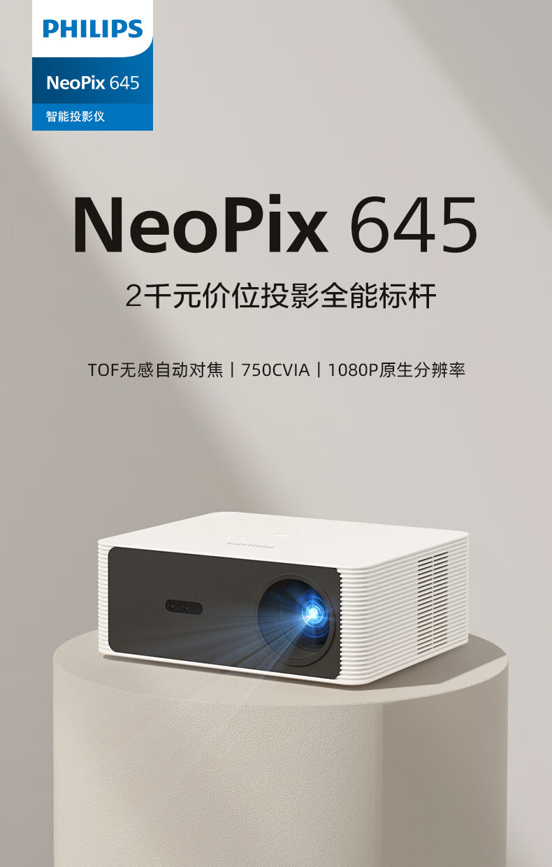 飞利浦(PHILIPS)NeoPix 645投影仪家用 智能家庭影院电视办公培训手机投影机 (TOF无感自动对焦 1080P 超清高亮)