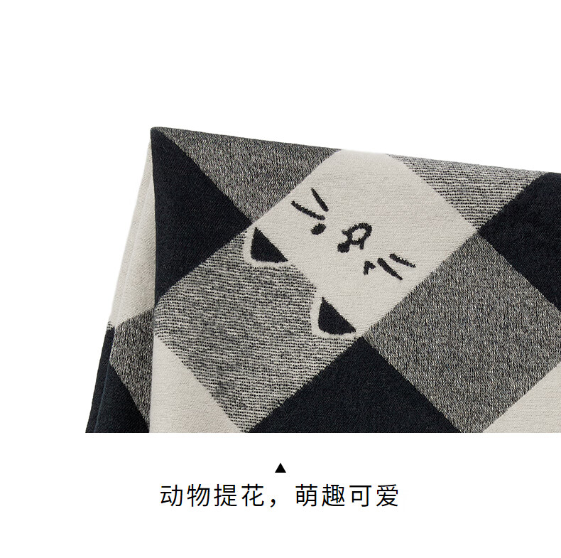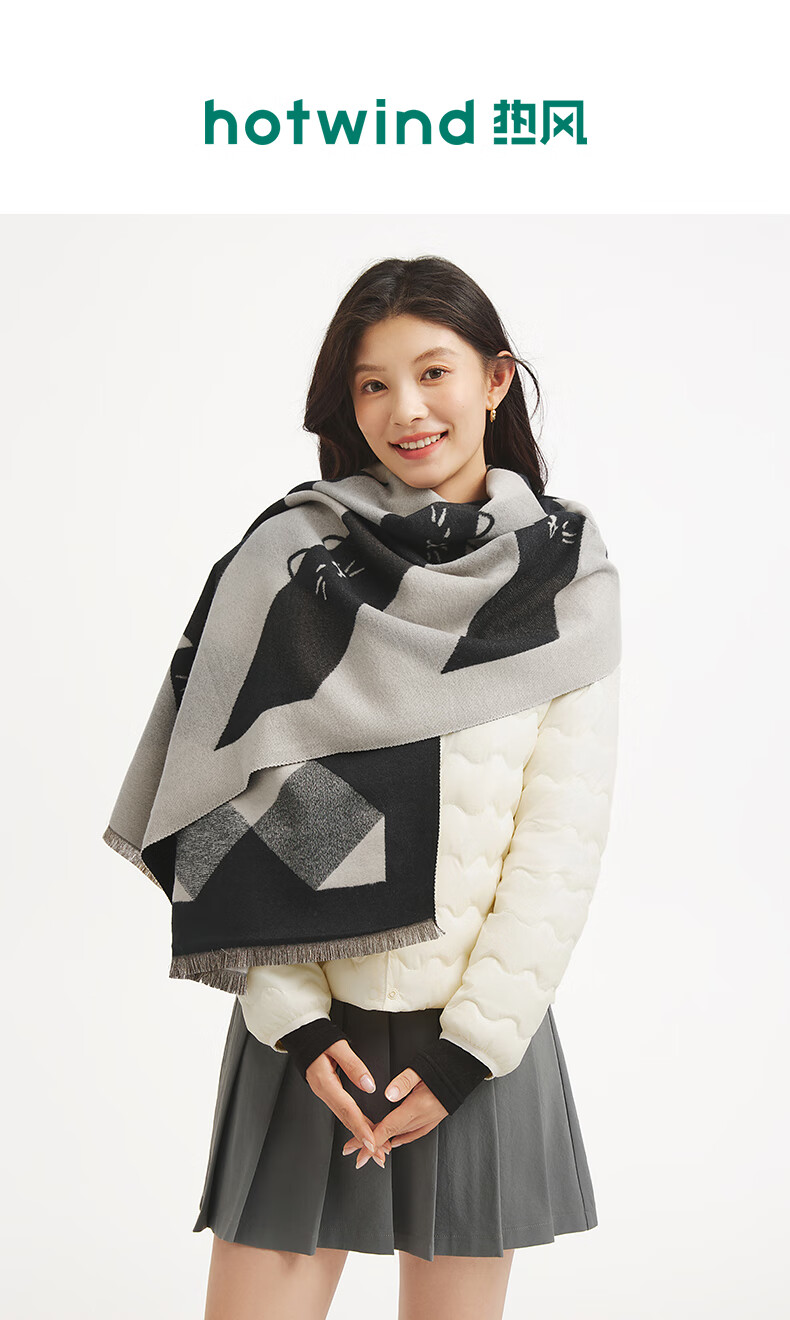 热风(Hotwind)【商场同款】女士围巾2025年冬季新款格纹小猫梭织气质保暖披肩 88米黑 67*180cm