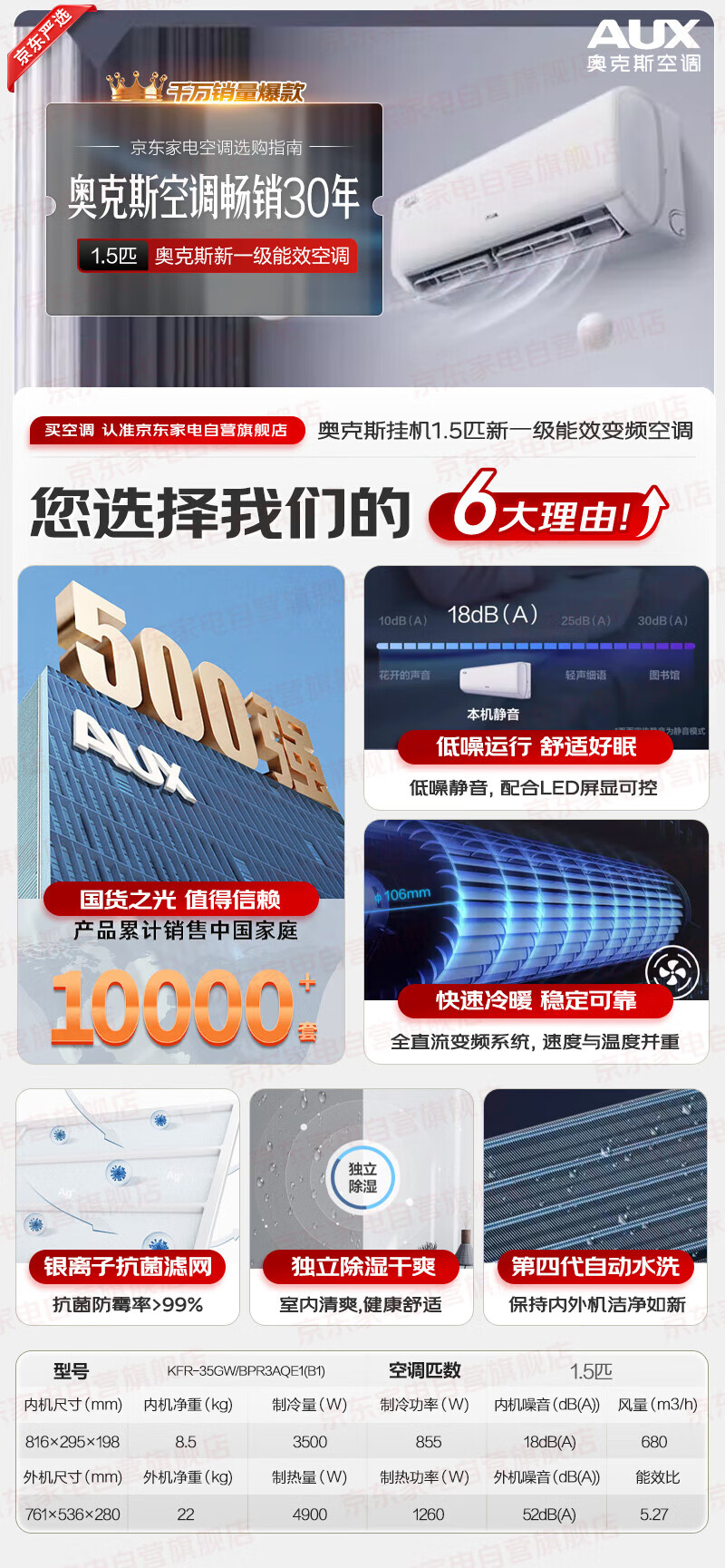 奥克斯(AUX)空调大1.5匹一级能效 京裕II 省电挂机卧室防直吹KFR-35GW/BpR3AQE1(B1)倾静省电侠同款