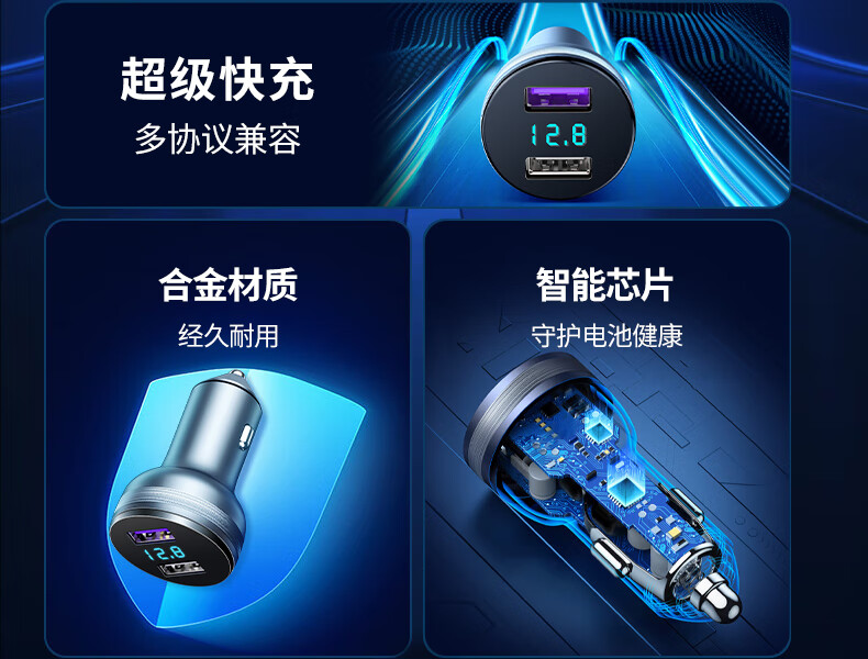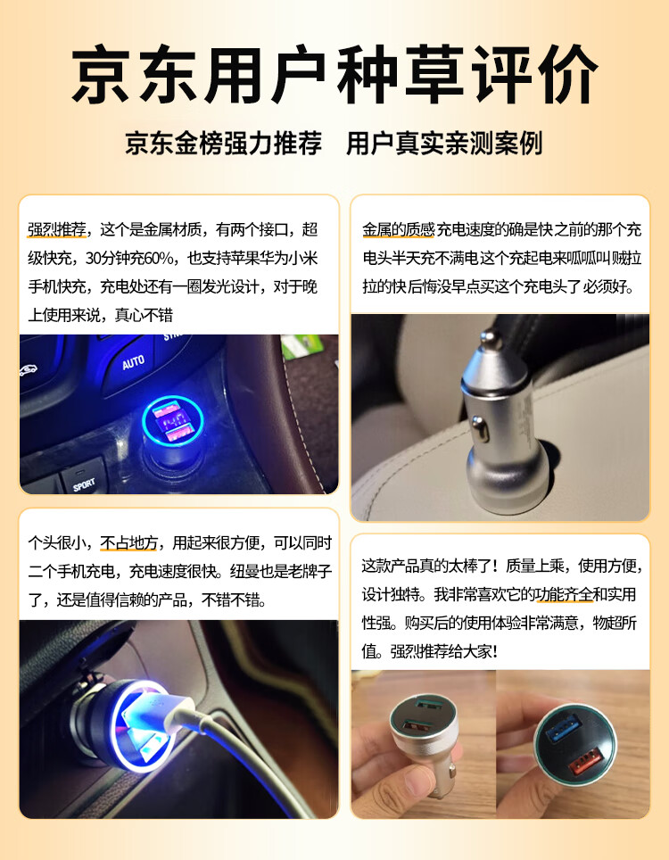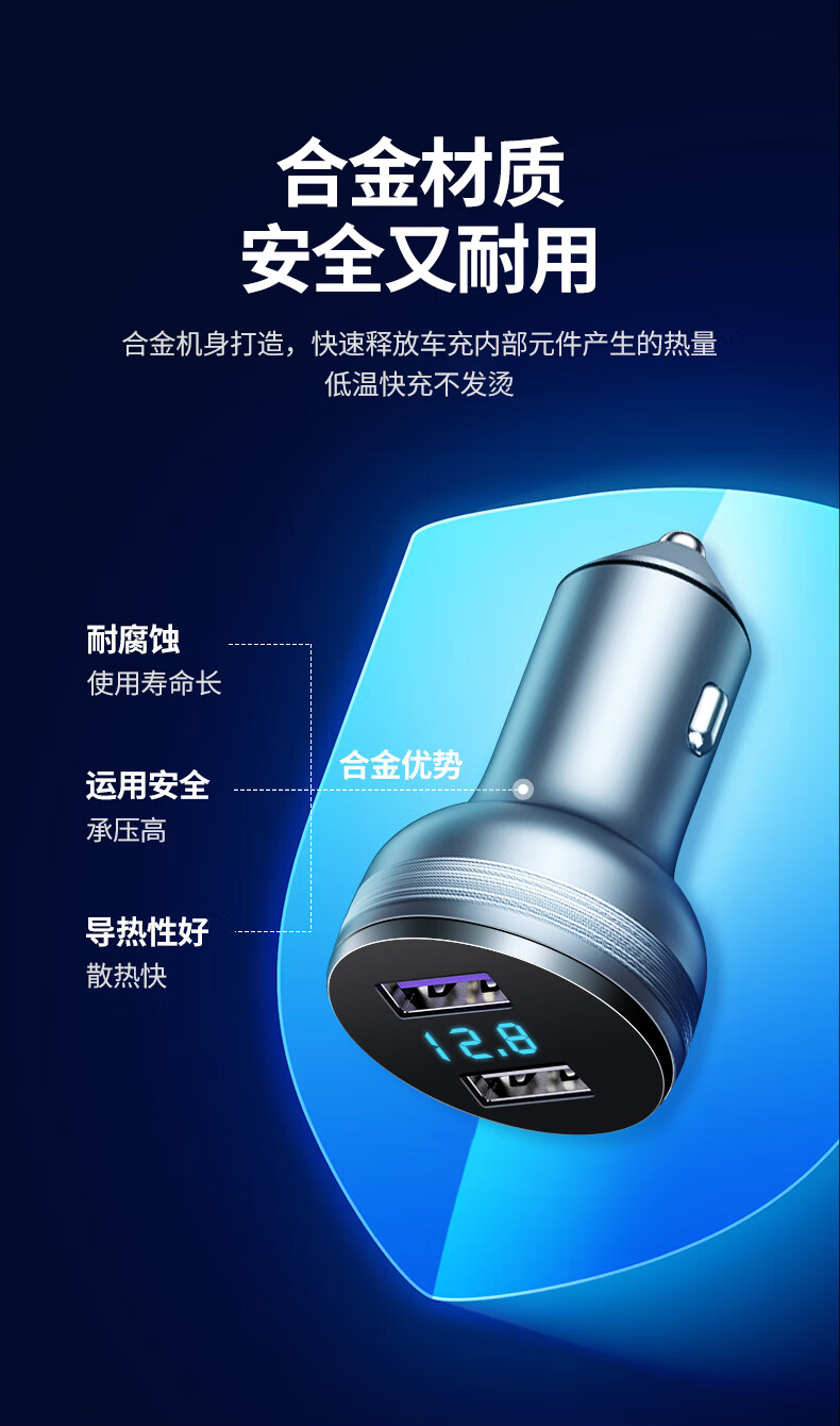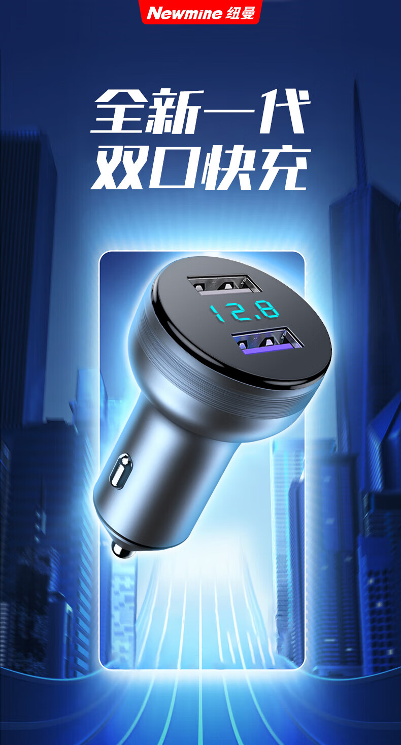 纽曼(Newmine)车载充电器点烟器一拖二双USB金属车充电压显示检测快充SX001-008