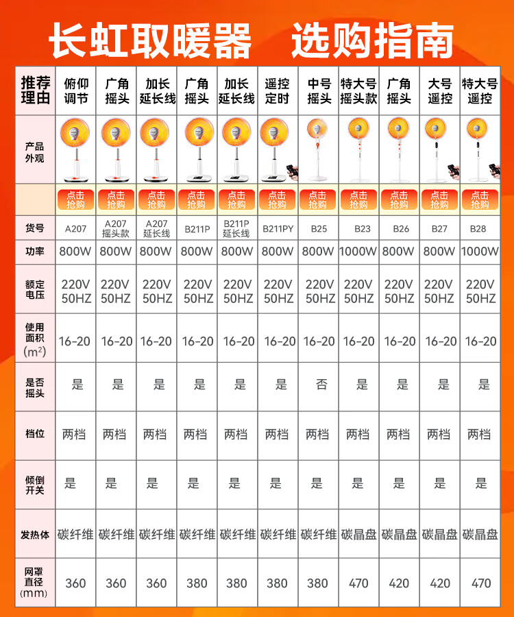 长虹(CHANGHONG)取暖器/小太阳/电暖器/电暖气/取暖电器/电热扇/电暖炉小型/烤火炉/快热炉 速热可摇头 台立两用【俯仰调节+网罩360mm】 1