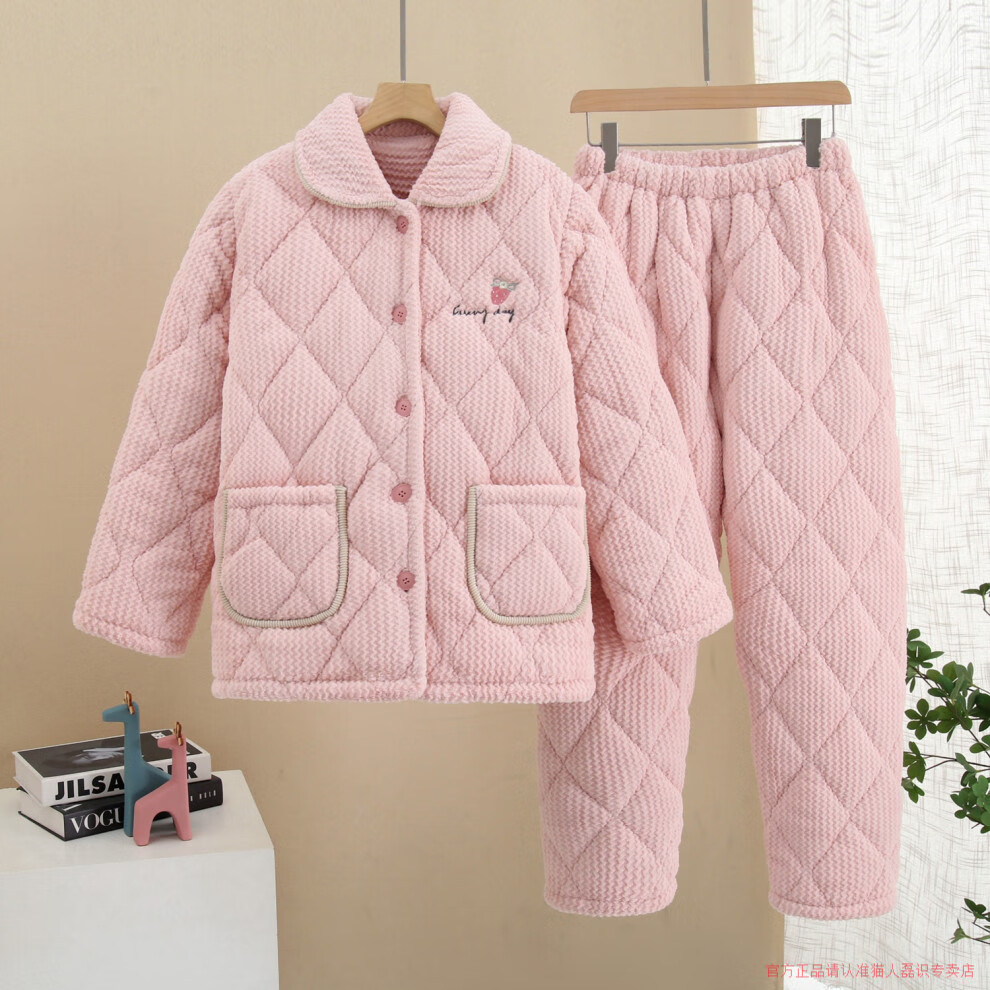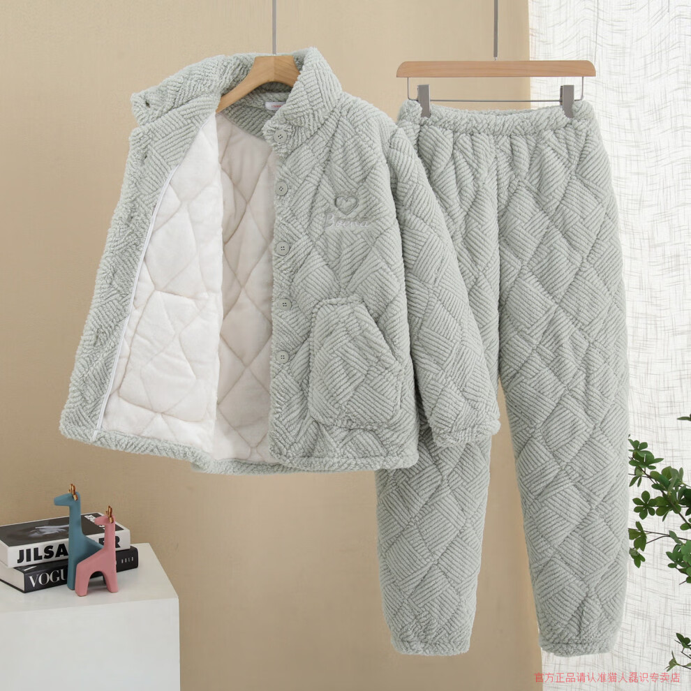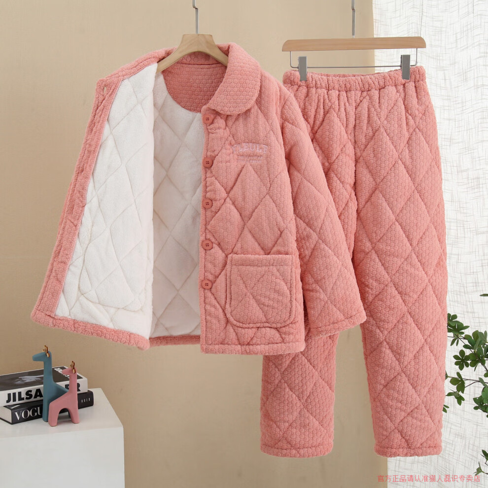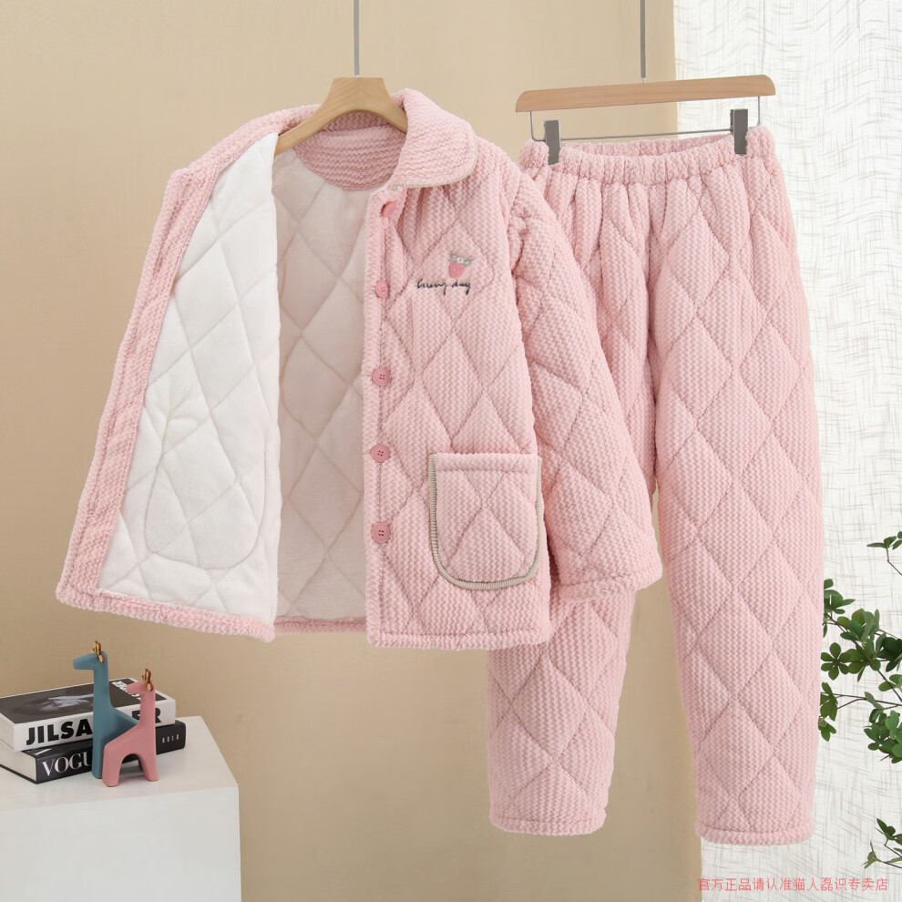 猫人(MiiOW)睡衣女秋冬季加厚加绒珊瑚绒夹棉三层保暖可外穿法兰绒家居服套装 一套过冬 杏仁黄纽扣 L 女适合80-105斤左右