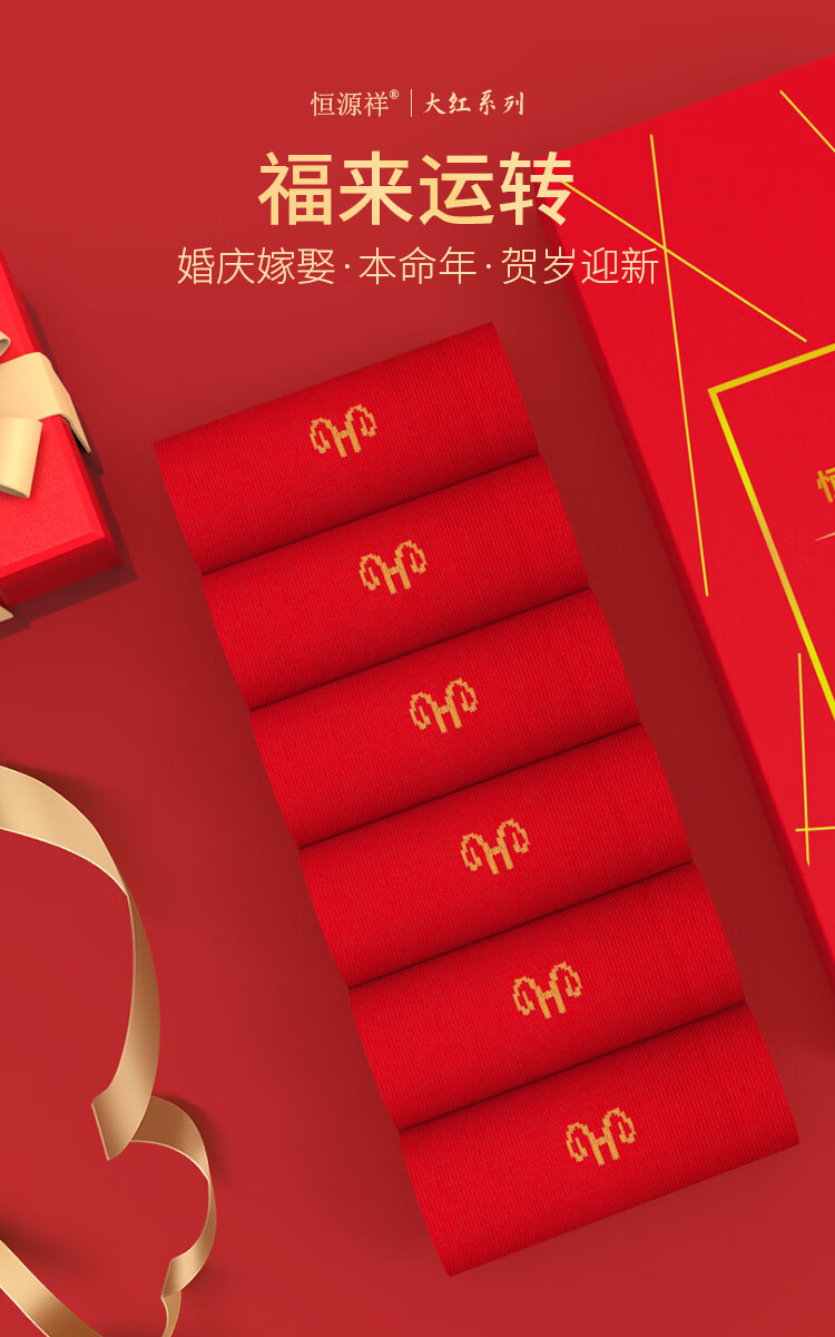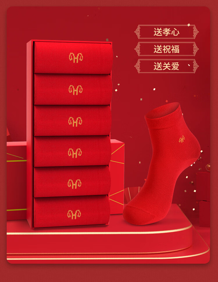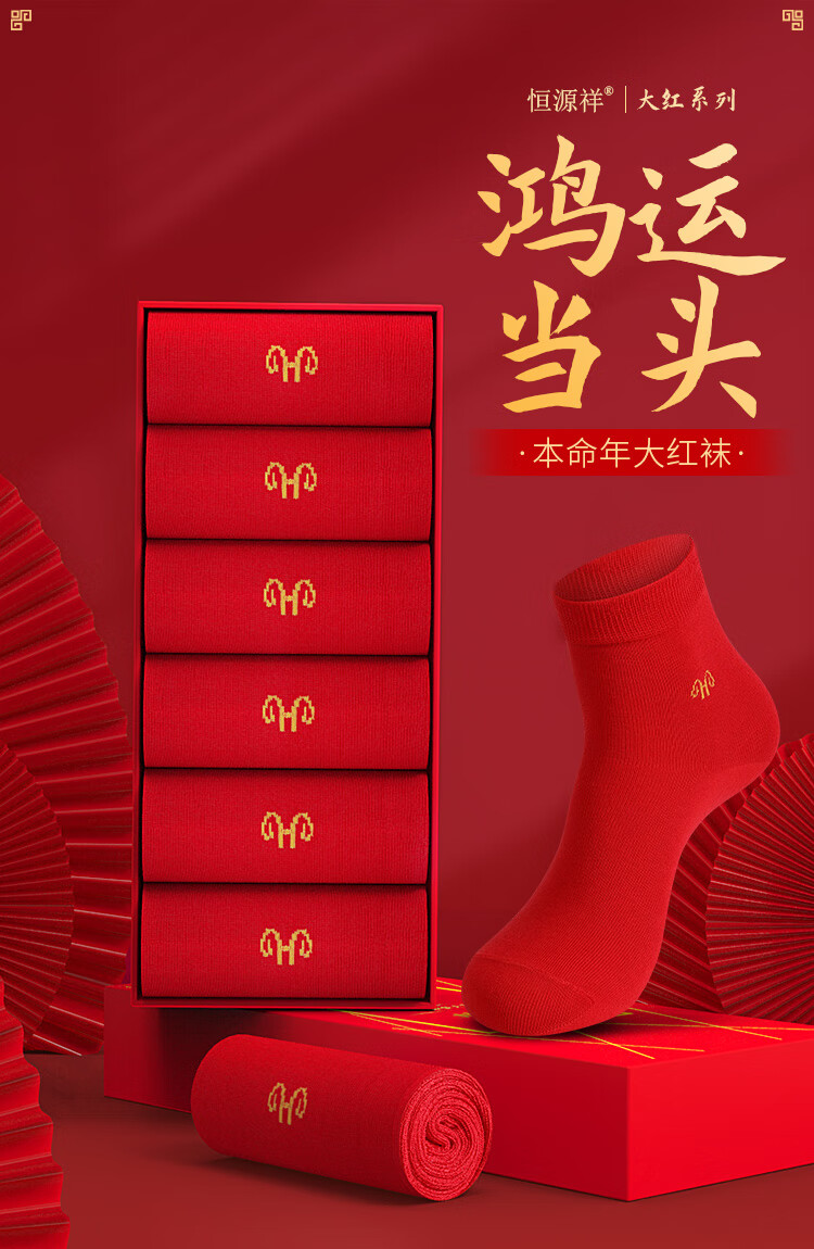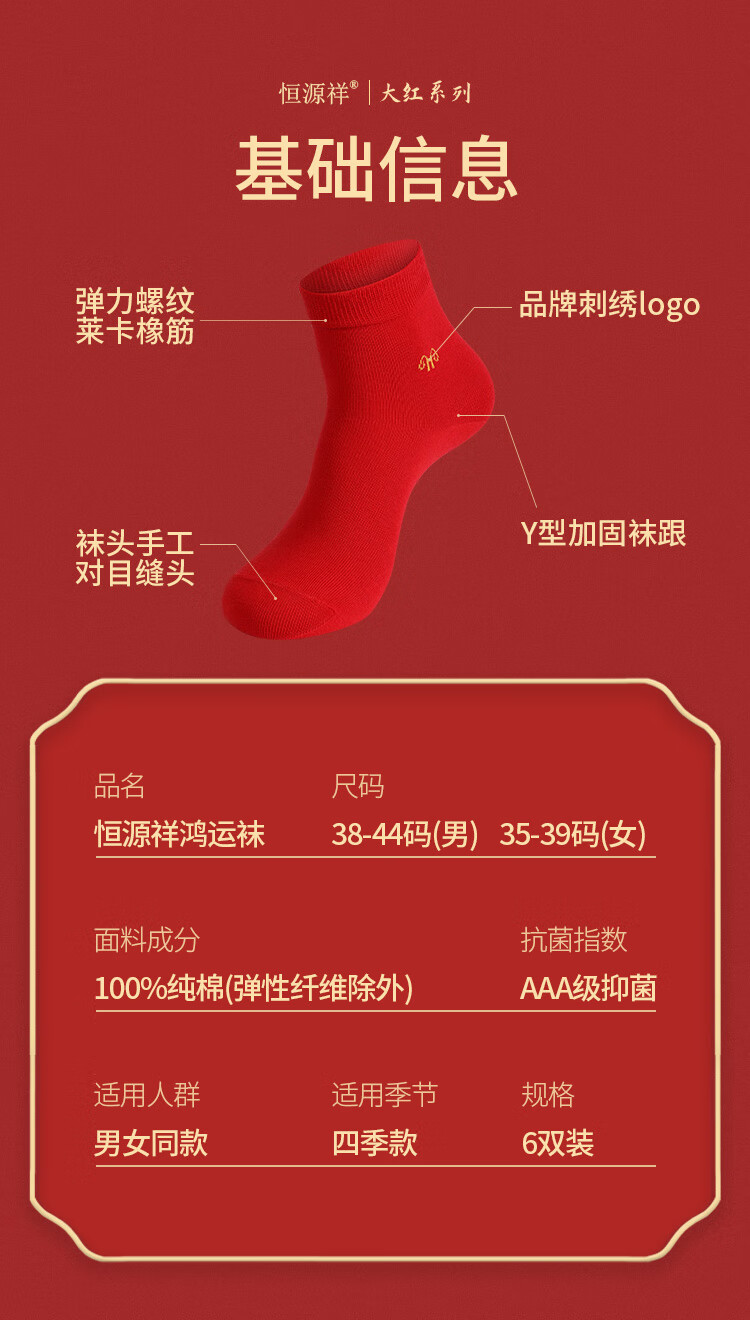 恒源祥本命年大红袜子男女同款纯棉鸿运新年袜子中筒结婚喜庆舒适棉袜 情侣款【纯棉大红3男3女】 6双