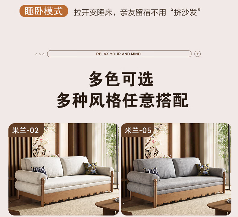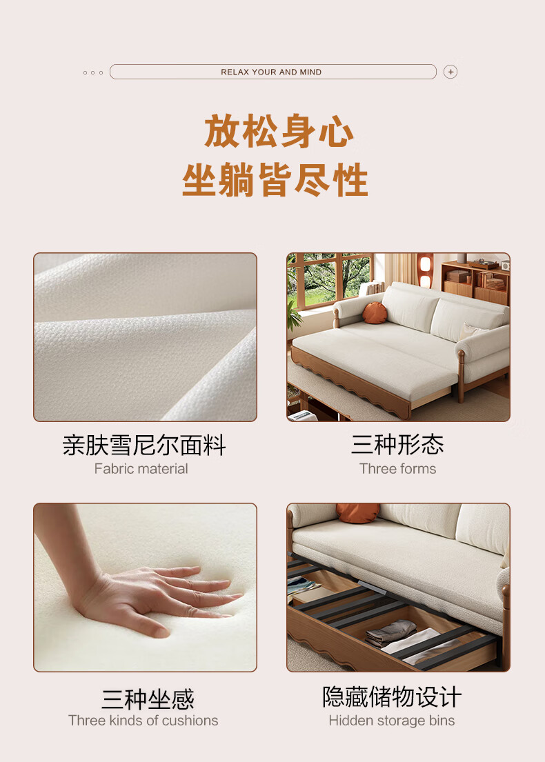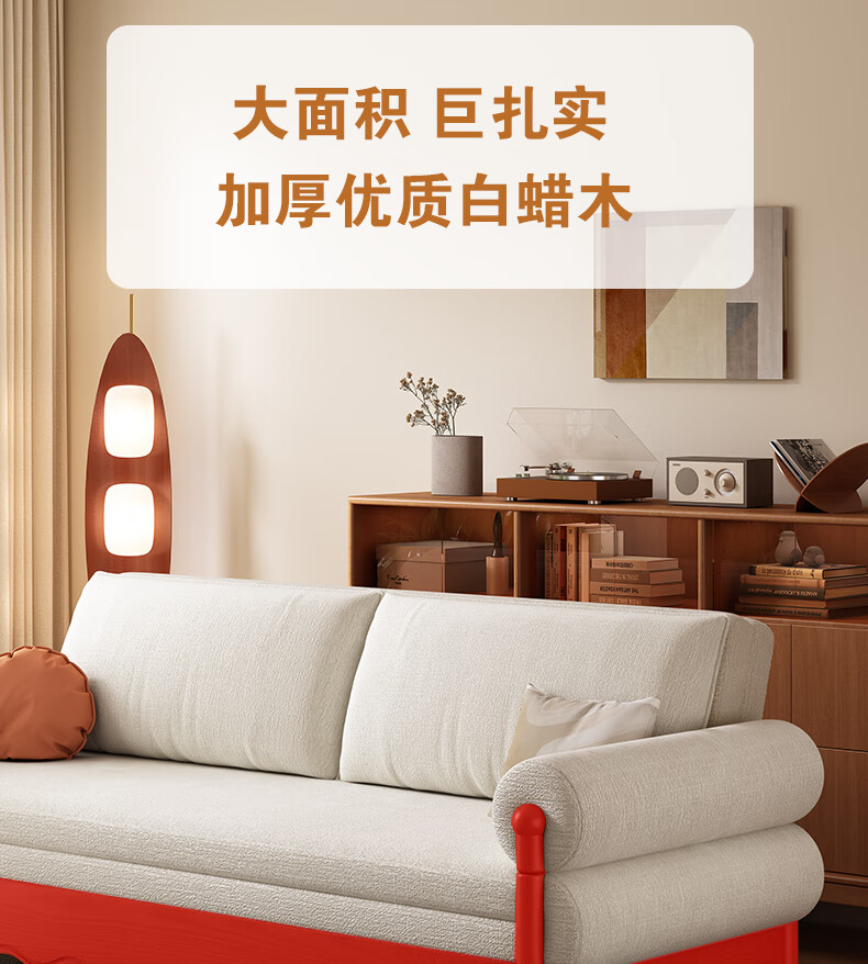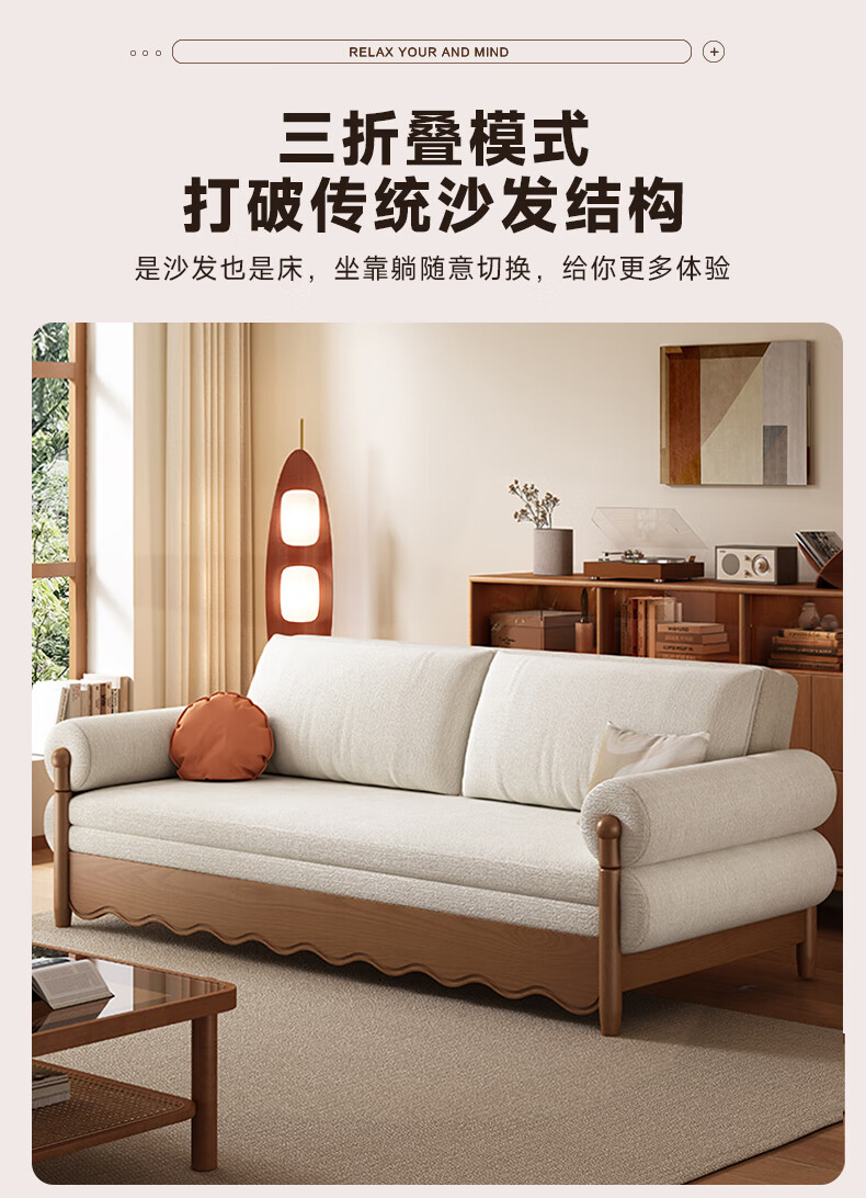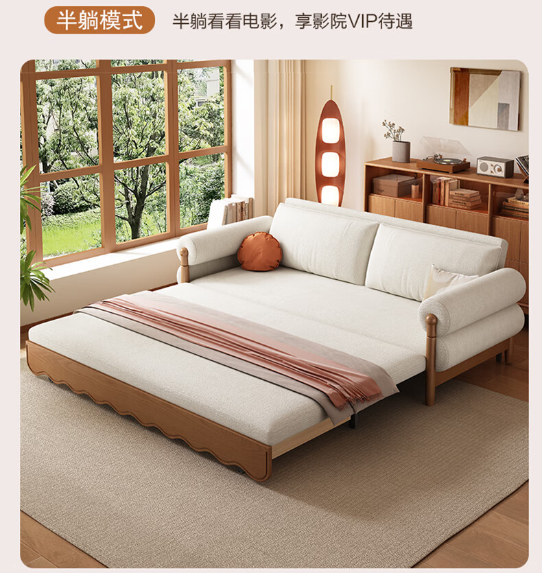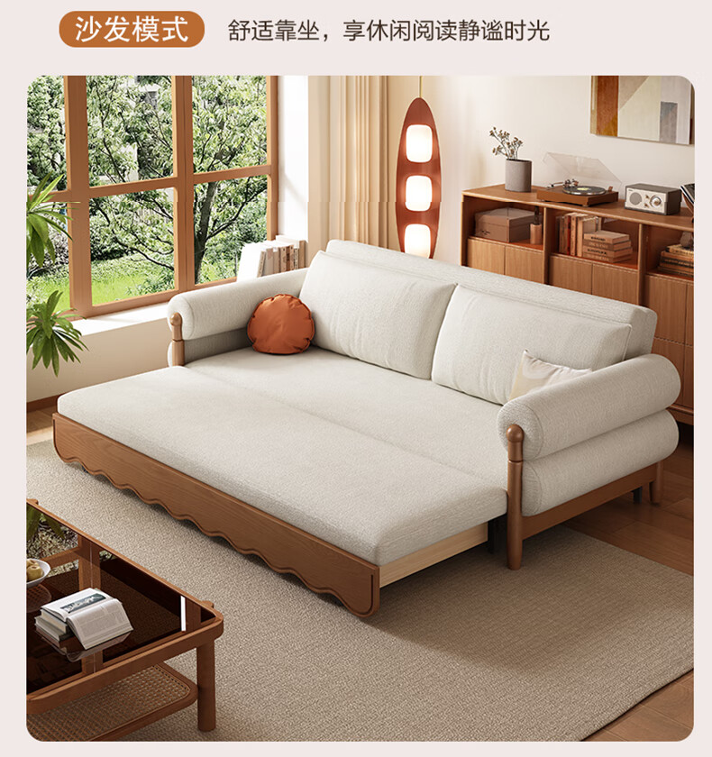 莘联多功能新款中古风实木沙发床两用小户型客厅高端可折叠雪尼尔沙发 外径:1.28m(无储物)白蜡木沙发床 环保椰棕款(加厚雪尼尔)