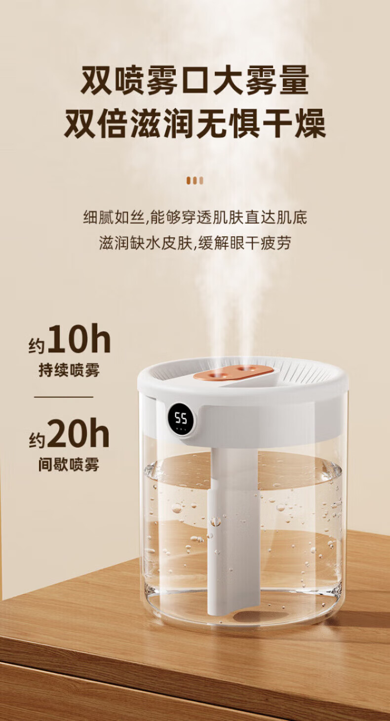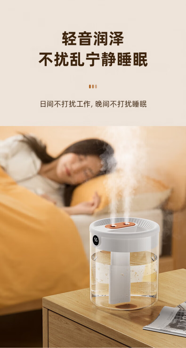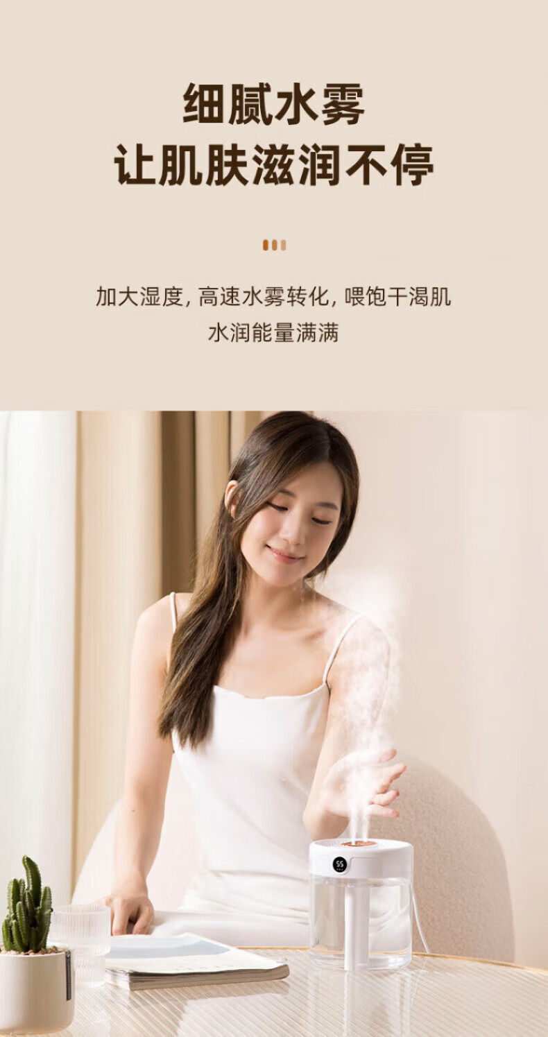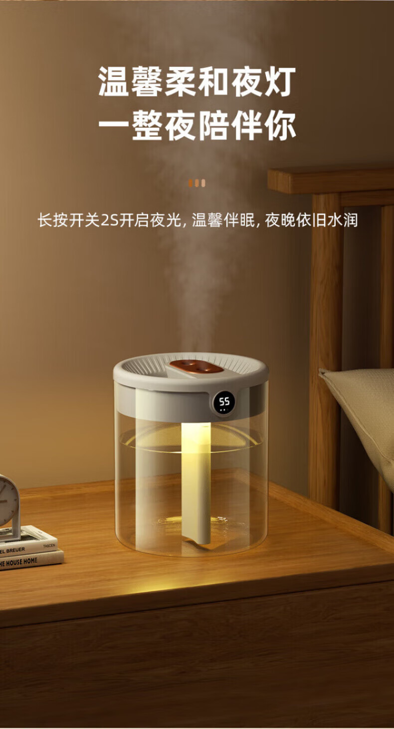 WCZ【德国】新款加湿器家用卧室静音双喷加湿器usb大容量家用卧室办公室小夜灯数显加湿器 米色三喷+净化保湿模式+小夜灯 充电无线 纳米细雾 轻音加湿
