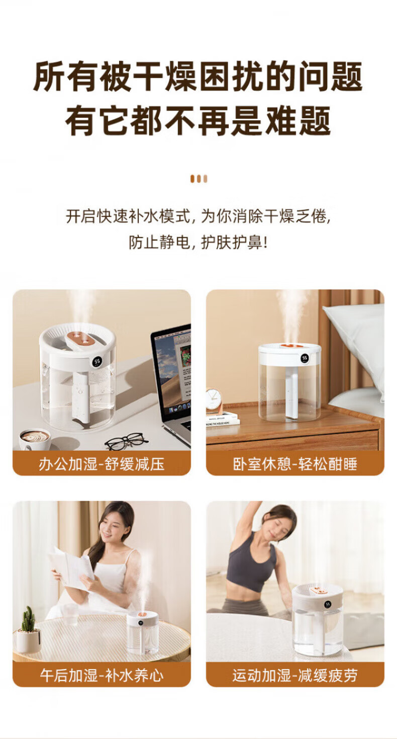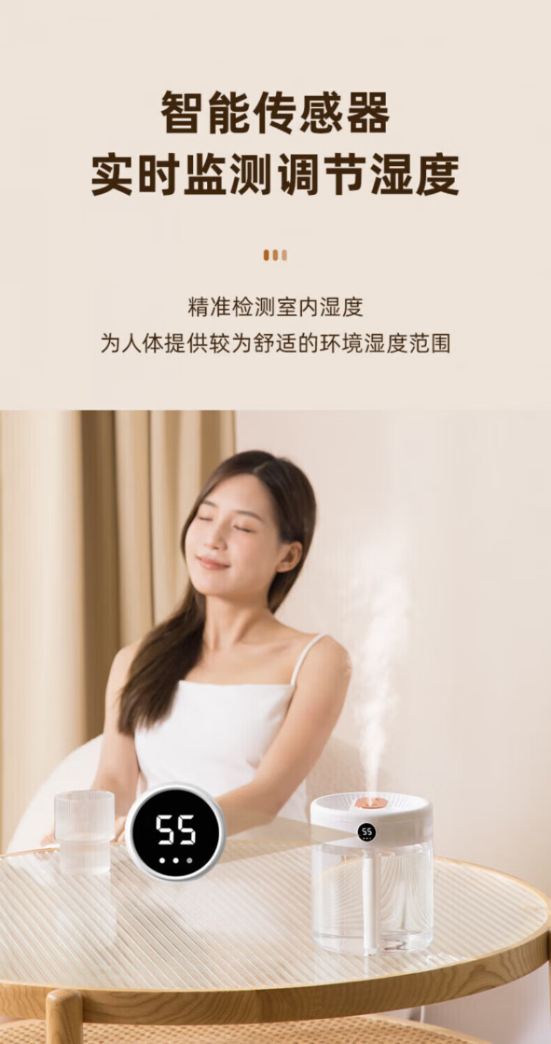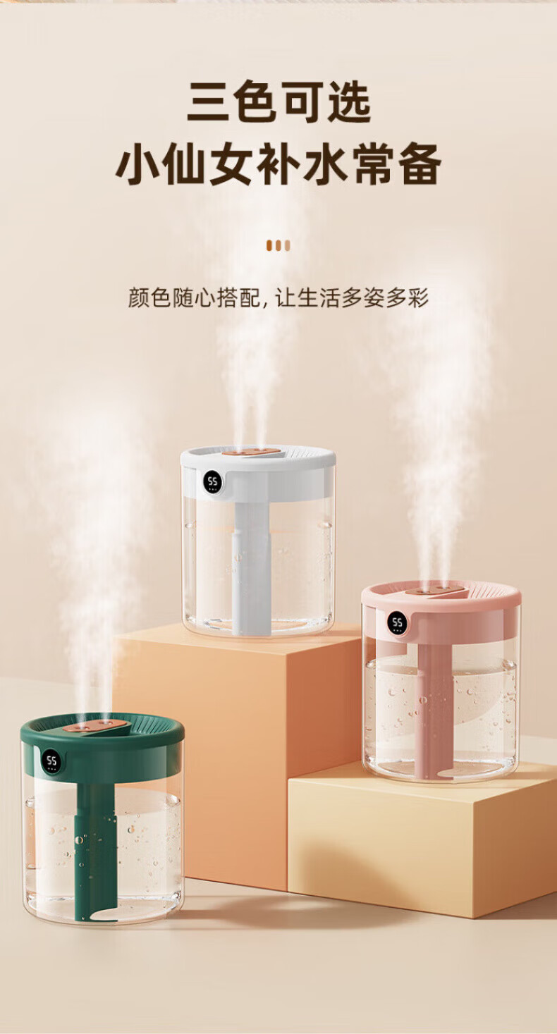 WCZ【德国】新款加湿器家用卧室静音双喷加湿器usb大容量家用卧室办公室小夜灯数显加湿器 米色三喷+净化保湿模式+小夜灯 充电无线 纳米细雾 轻音加湿