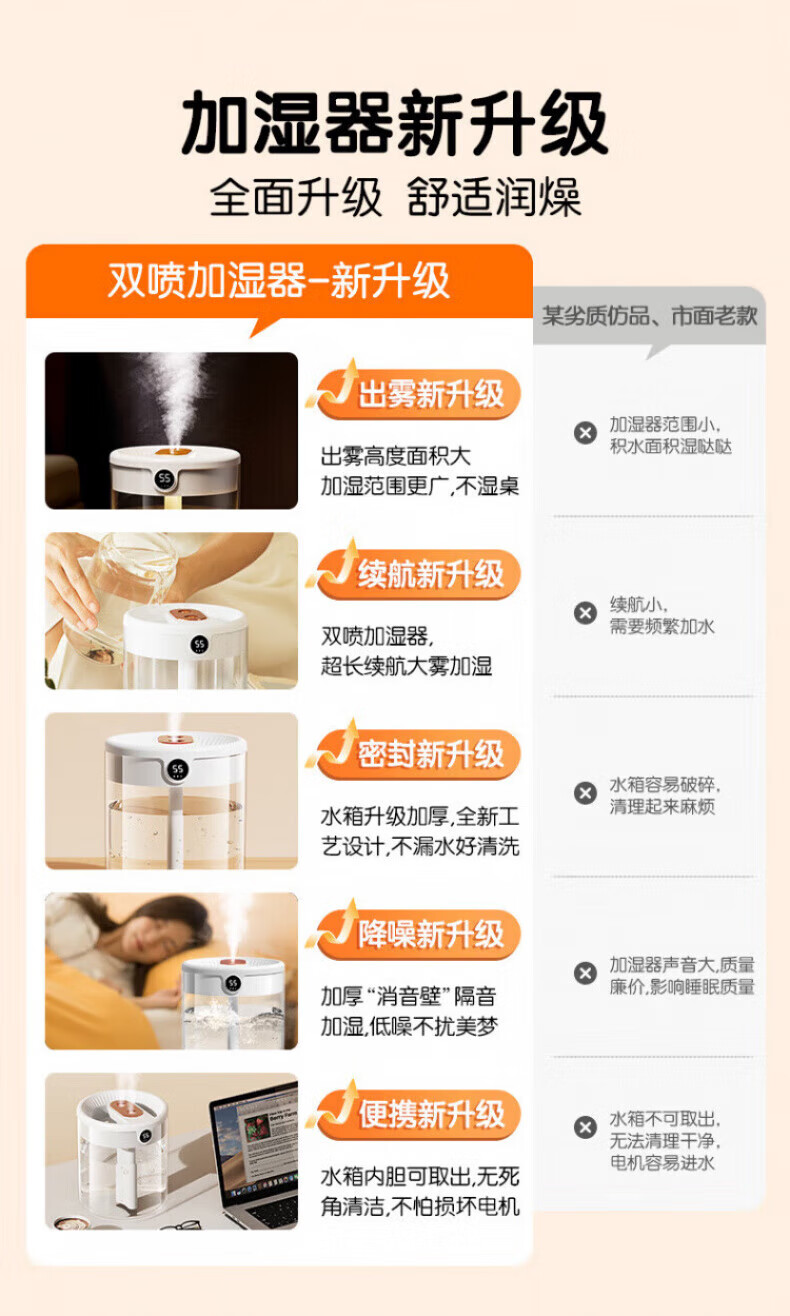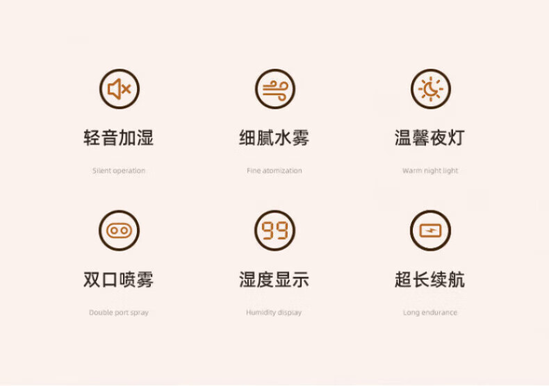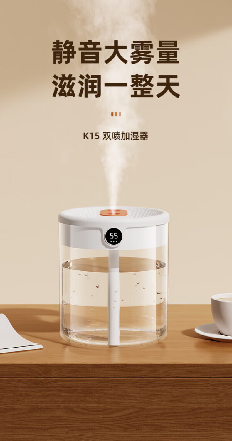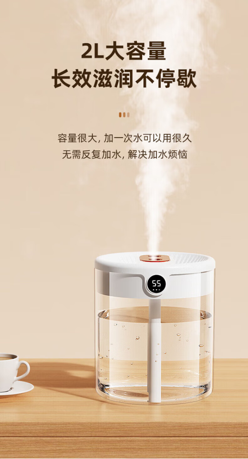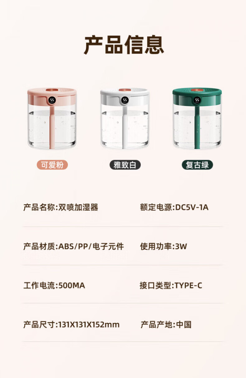 WCZ【德国】新款加湿器家用卧室静音双喷加湿器usb大容量家用卧室办公室小夜灯数显加湿器 米色三喷+净化保湿模式+小夜灯 充电无线 纳米细雾 轻音加湿