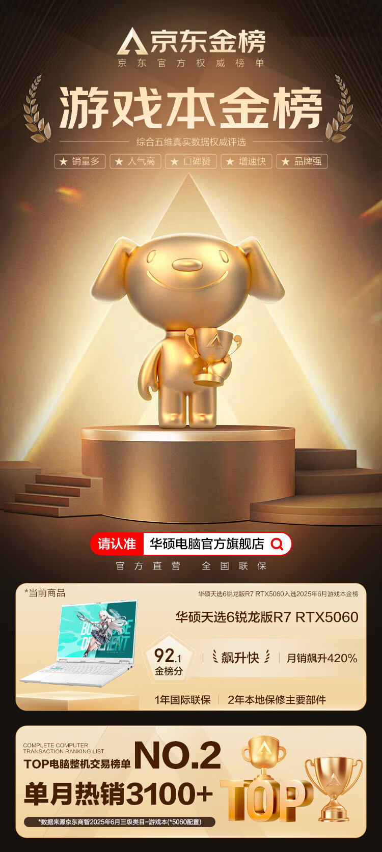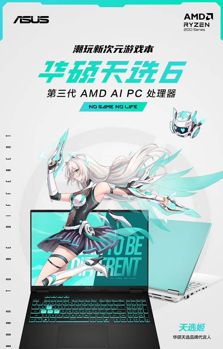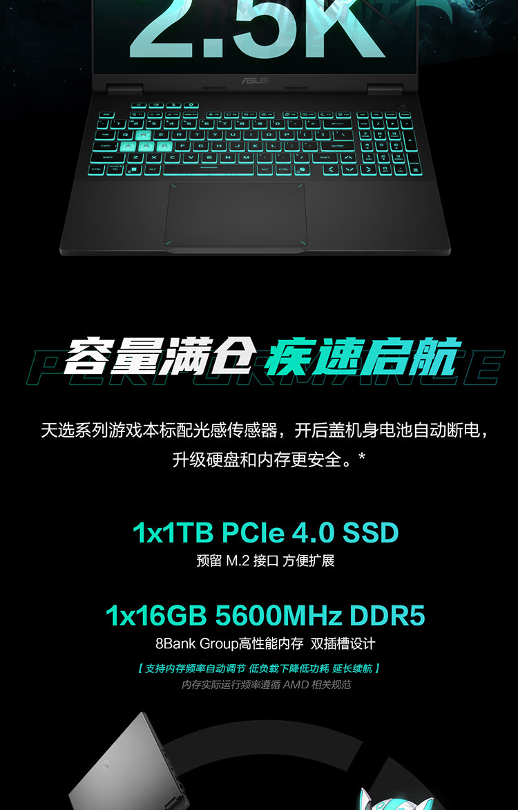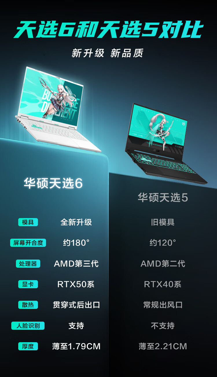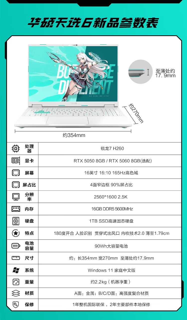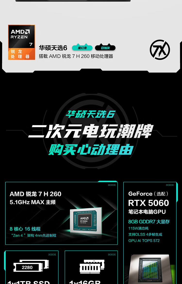 华硕天选6 国家补贴20% 16英寸游戏本 笔记本电脑 锐龙7 H260/RTX5060/魔幻青 16G内存/1T高速固态硬盘 2.5K 16:10高刷高亮高色域电竞屏