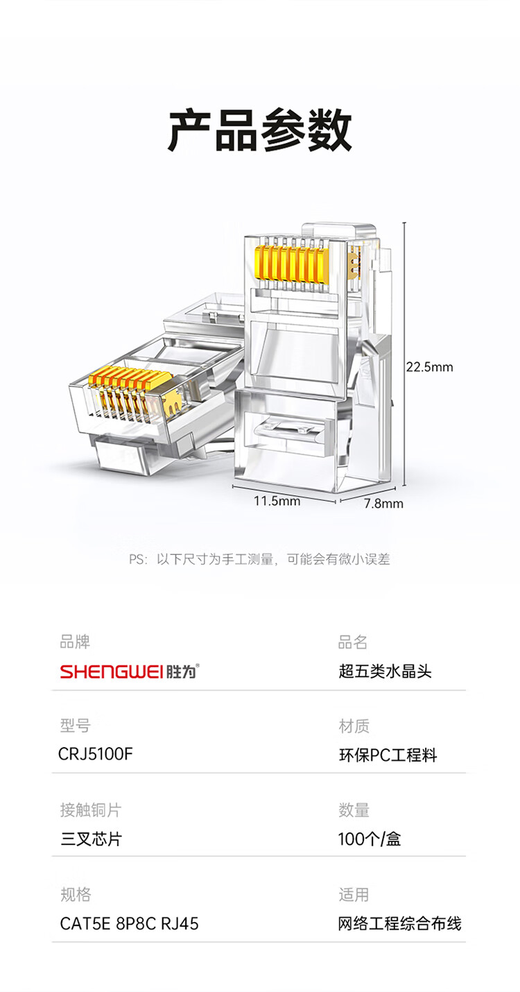 胜为(shengwei)超五类网线水晶头 工程网络连接器 RJ45电脑网络连接头 100个/盒 CRJ5100F