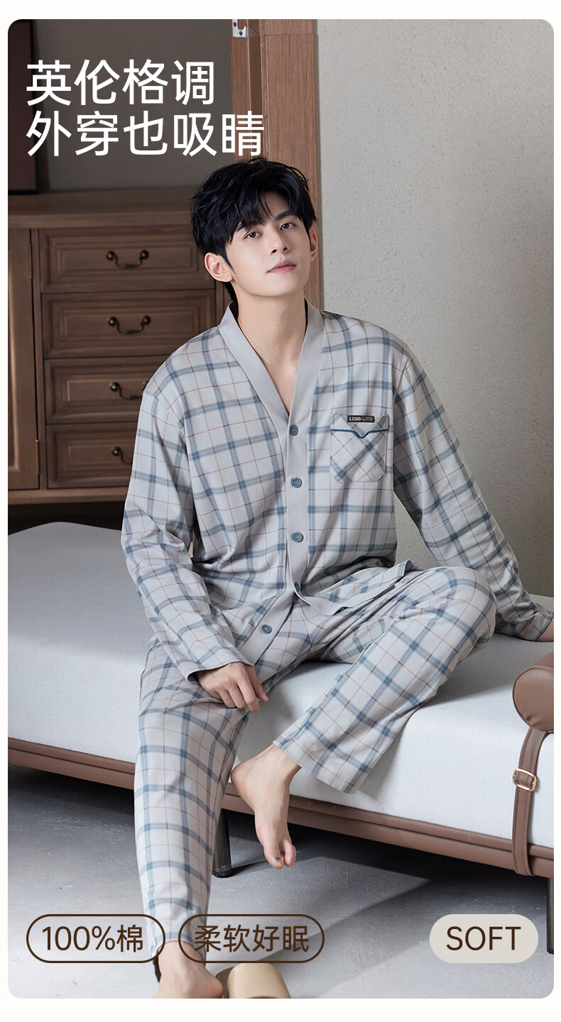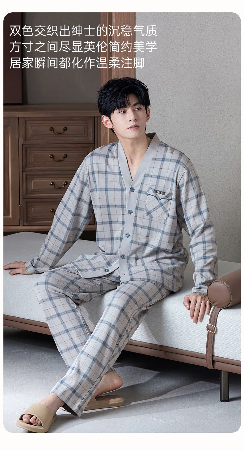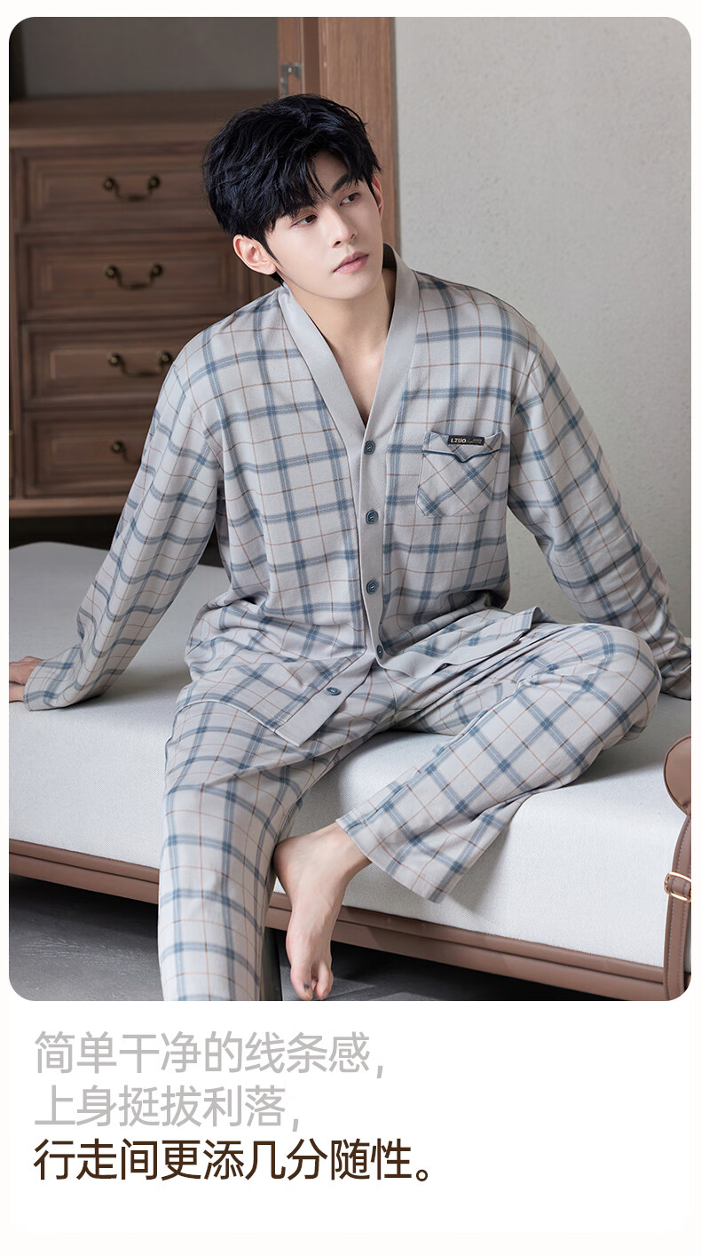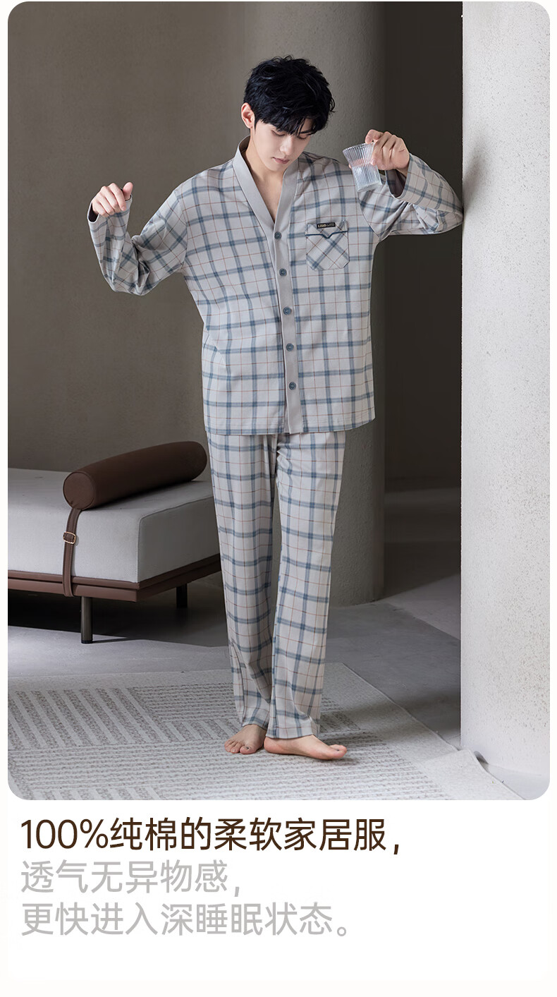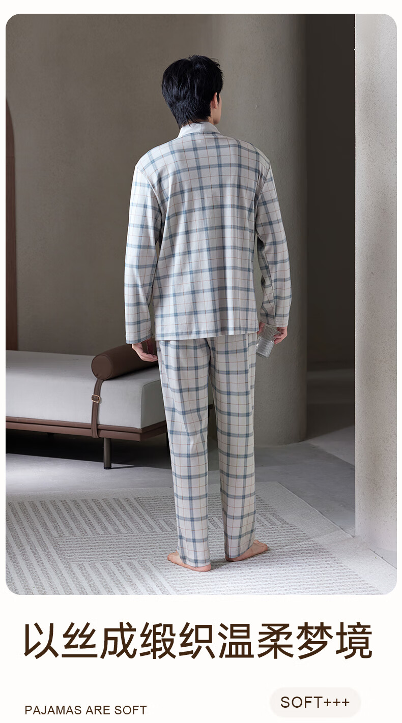 玛伦萨睡衣男纯棉春秋季2025年新款可外穿格子长袖长裤男士家居服套装 浅灰 XL