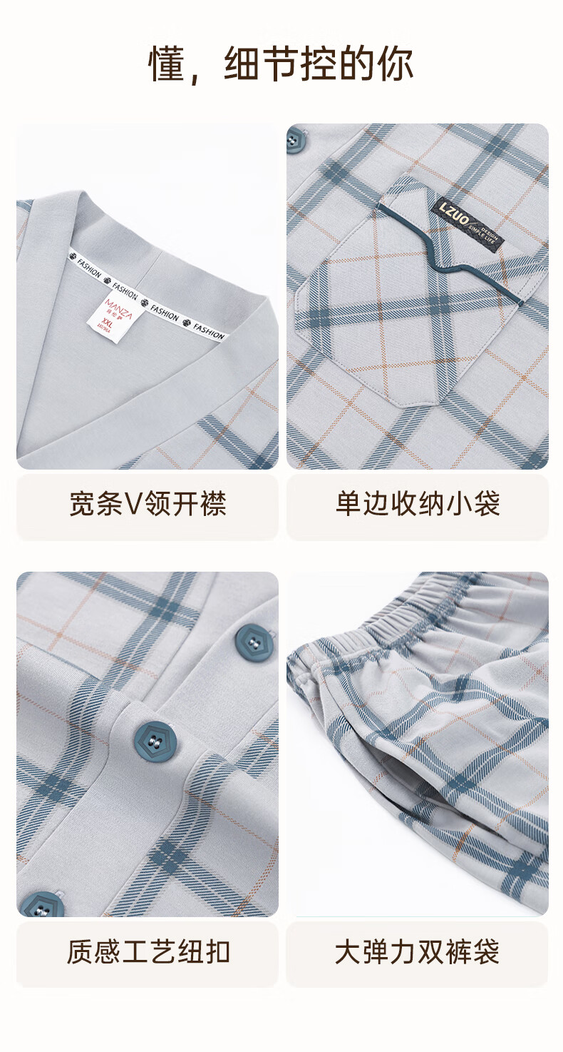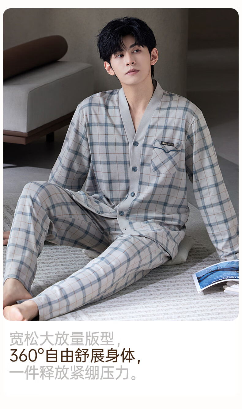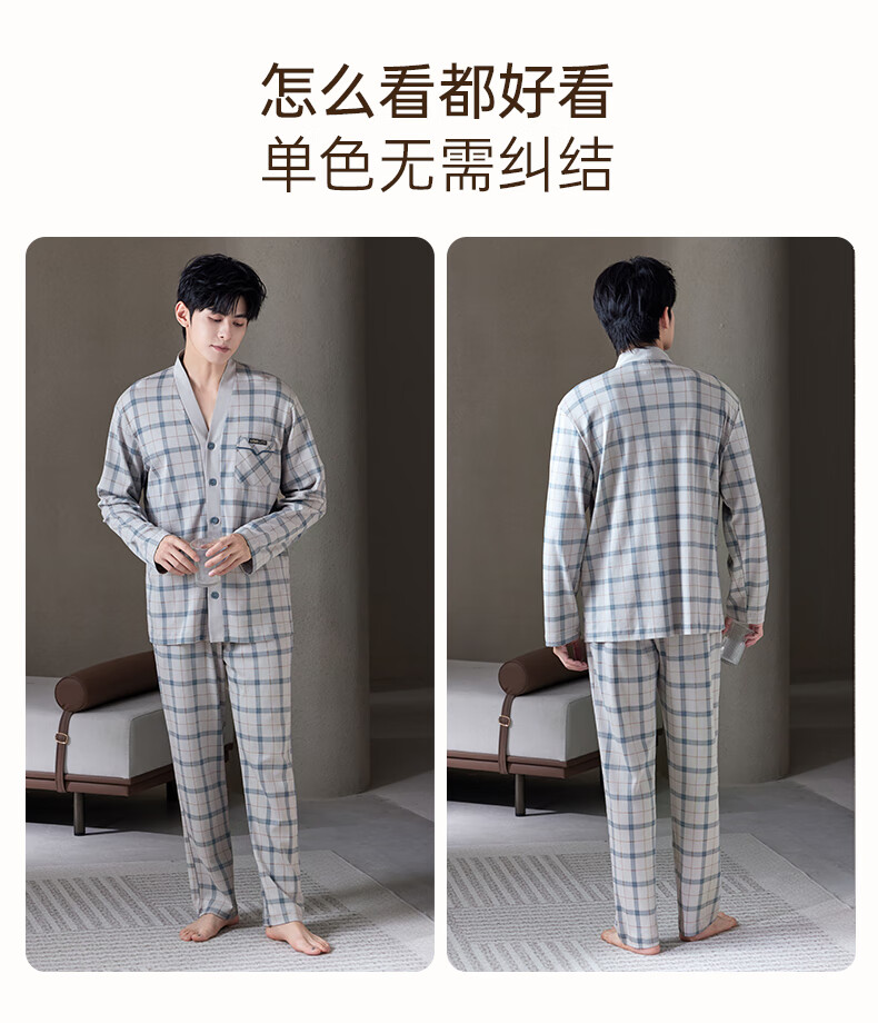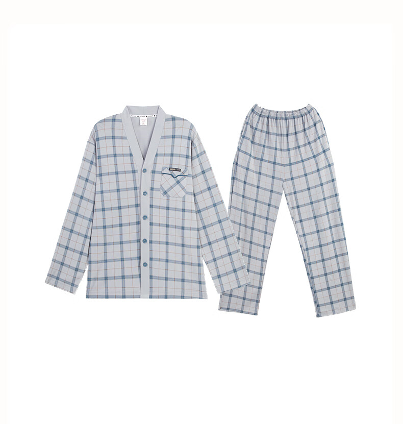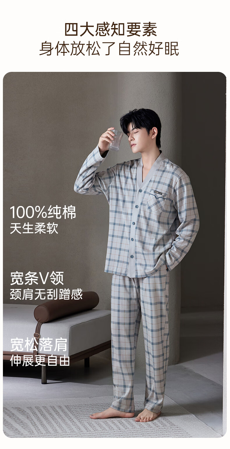 玛伦萨睡衣男纯棉春秋季2025年新款可外穿格子长袖长裤男士家居服套装 浅灰 XL
