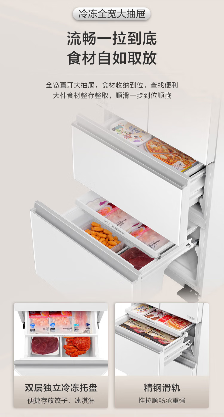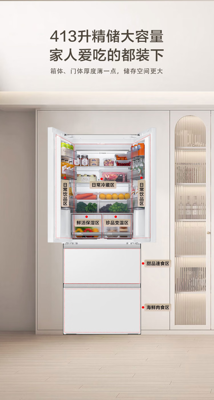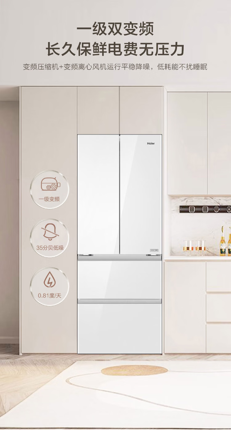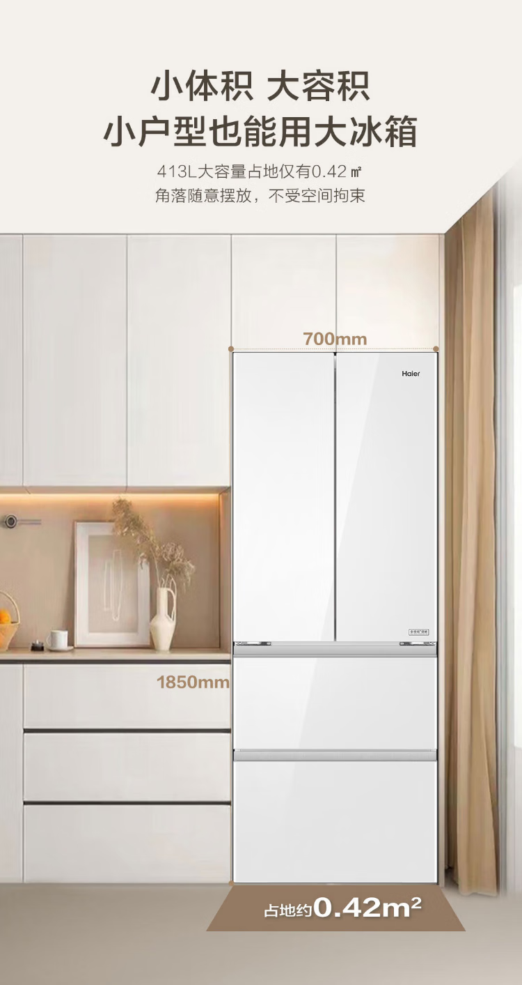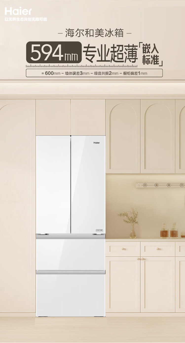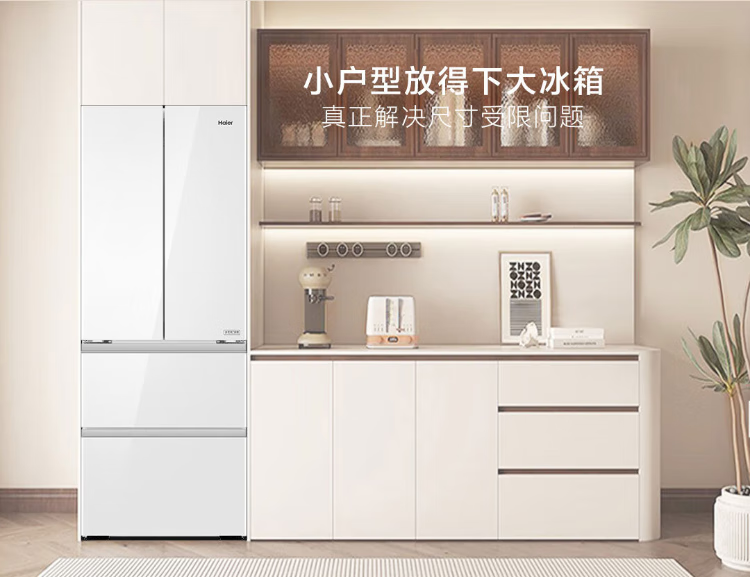 海尔(Haier)零嵌入冰箱413升法式多开门全空间保鲜和美系列家用彩晶玻璃风冷无霜一级能效EPP超净WGHFD1BSJU1 元力白