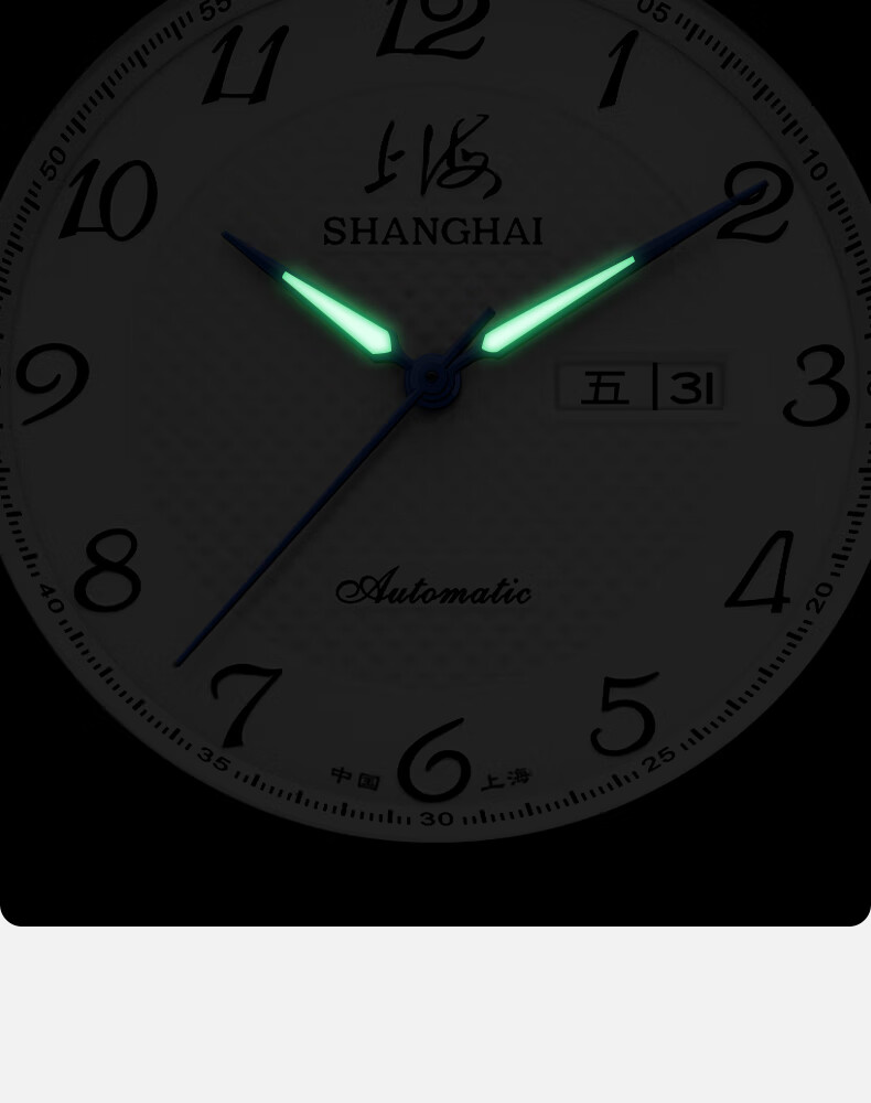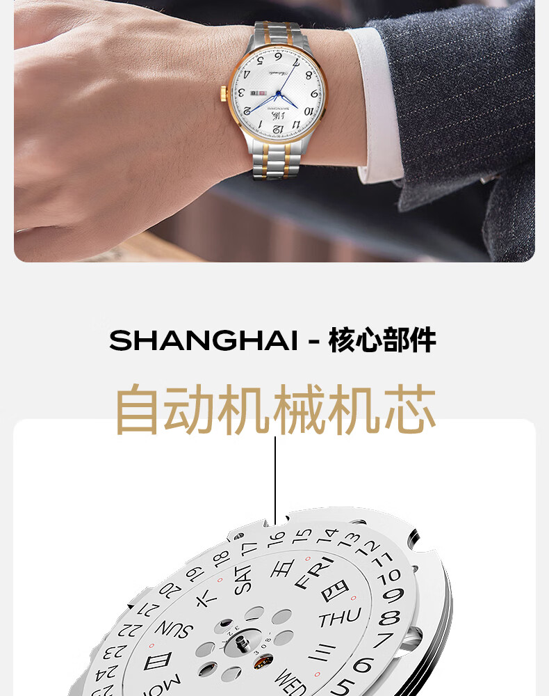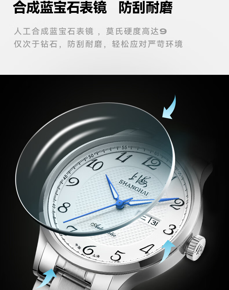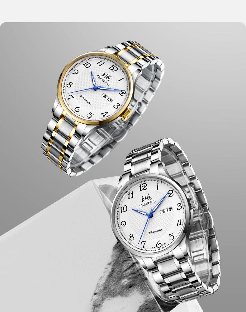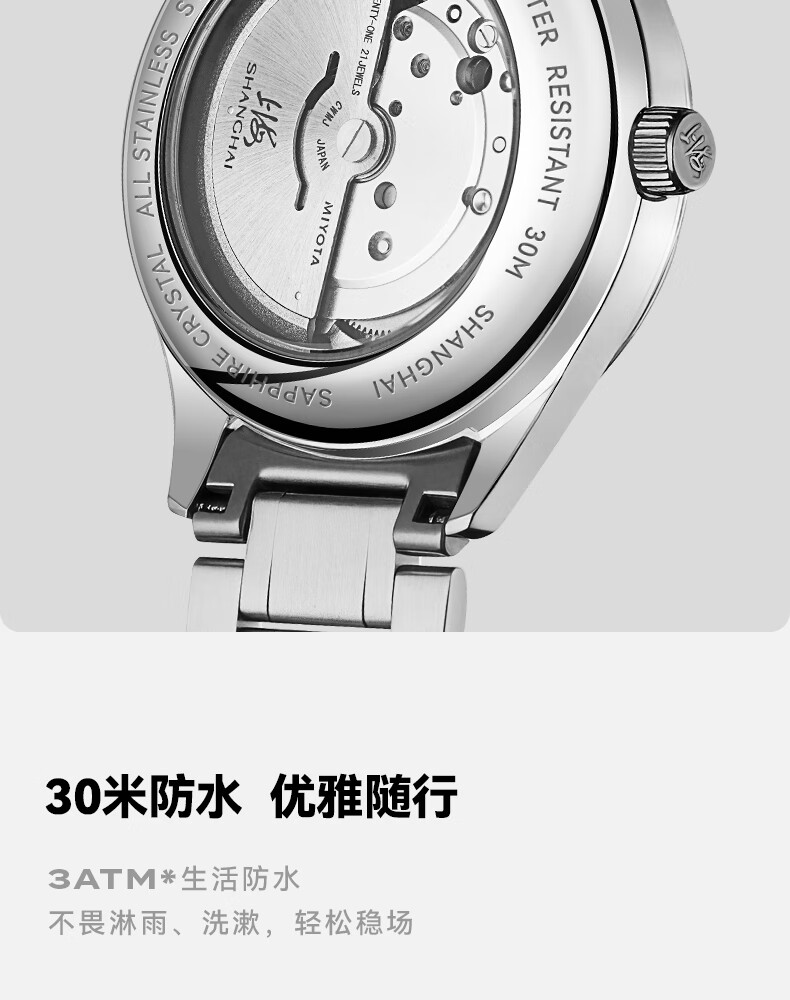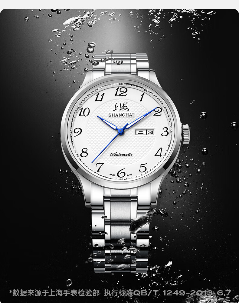 上海(SHANGHAI)手表礼物 国民系列 经典自动机械腕表透底钢带男表 S629B白双历