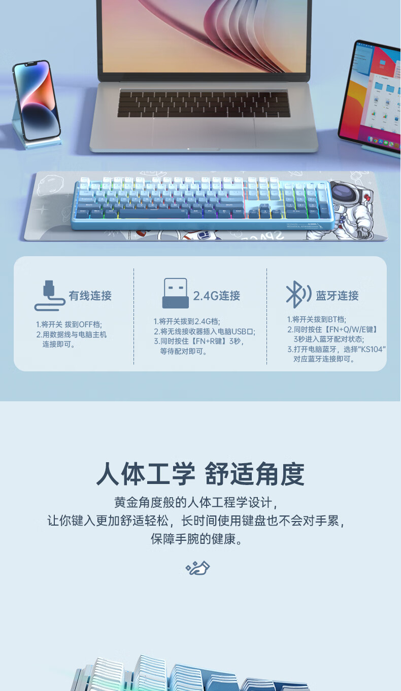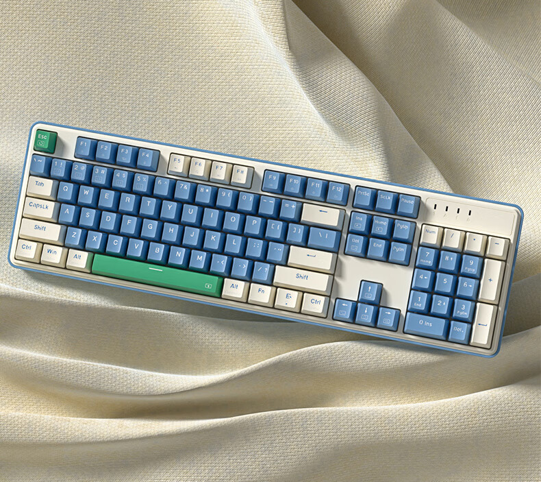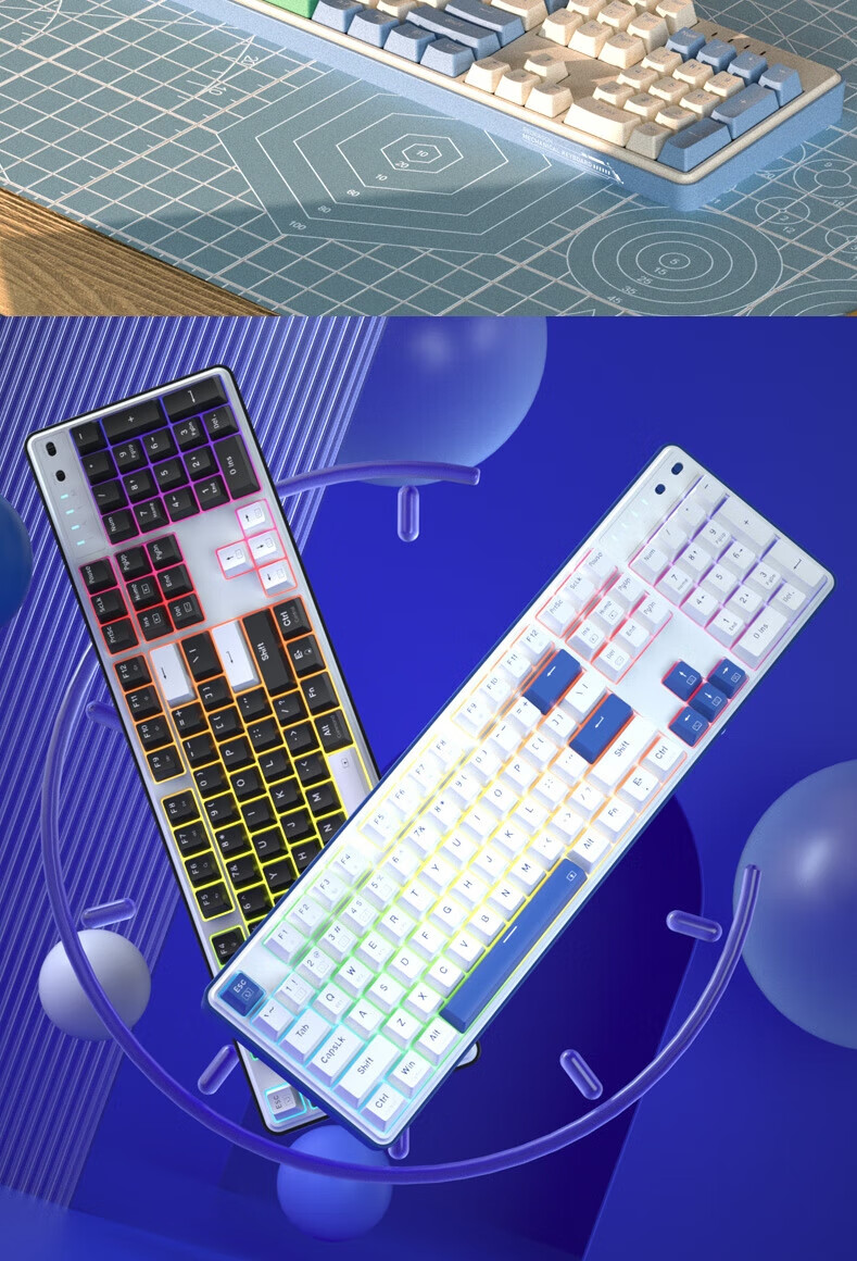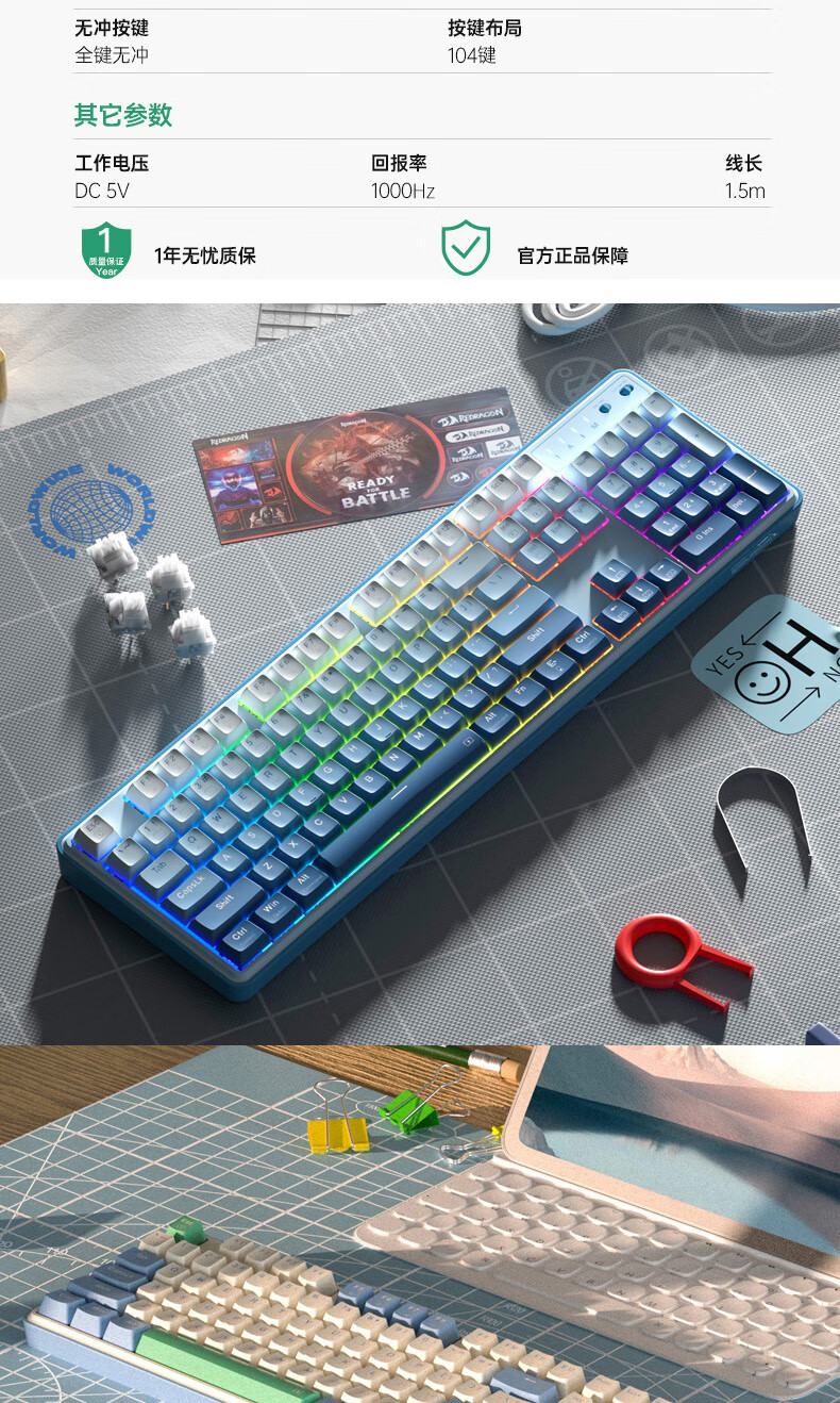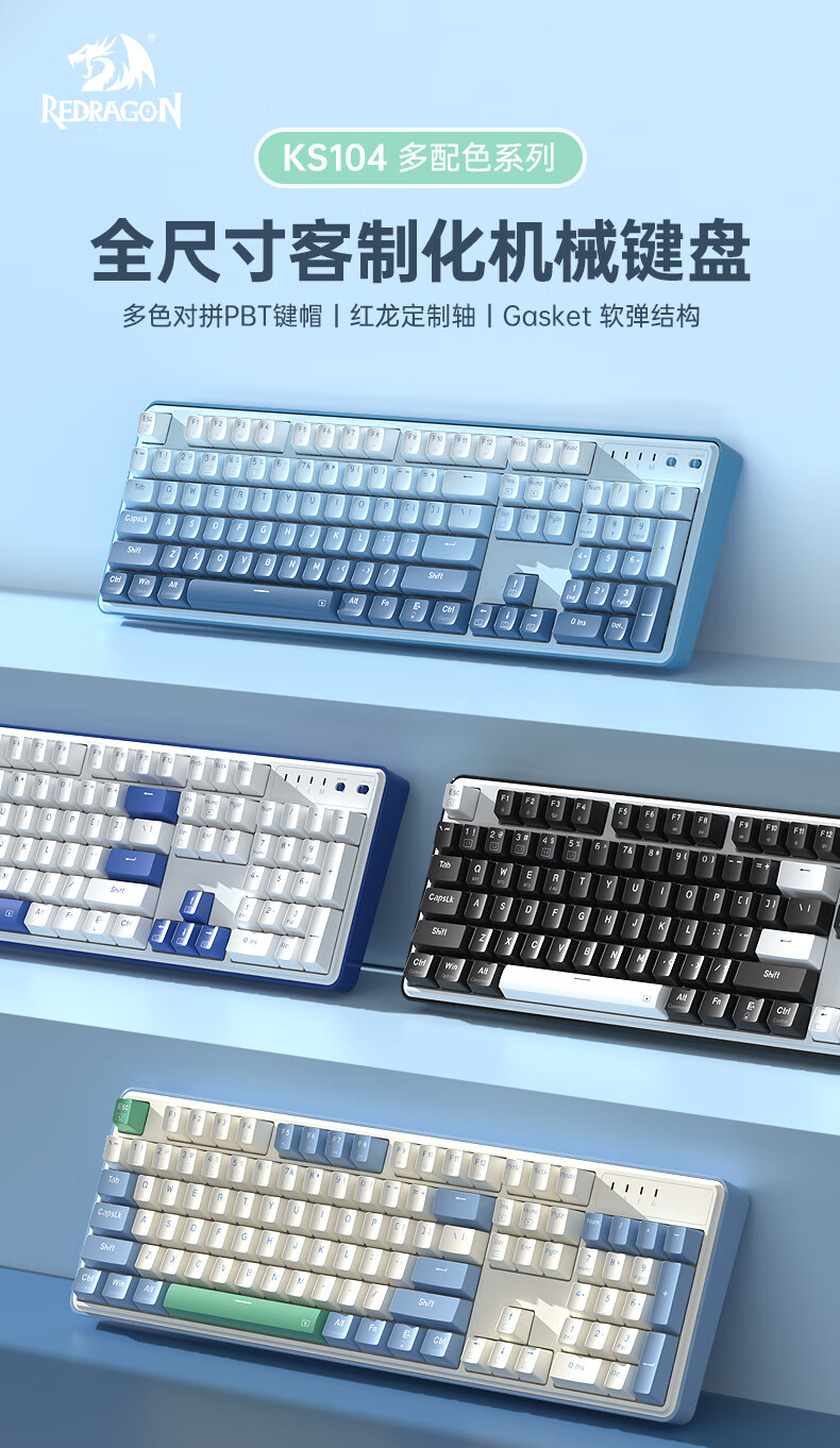 红龙(REDRAGON)KS104-B 机械键盘 有线键盘 全键热插拔PBT键帽全键无冲104键游戏办公键盘 白蓝-青木轴