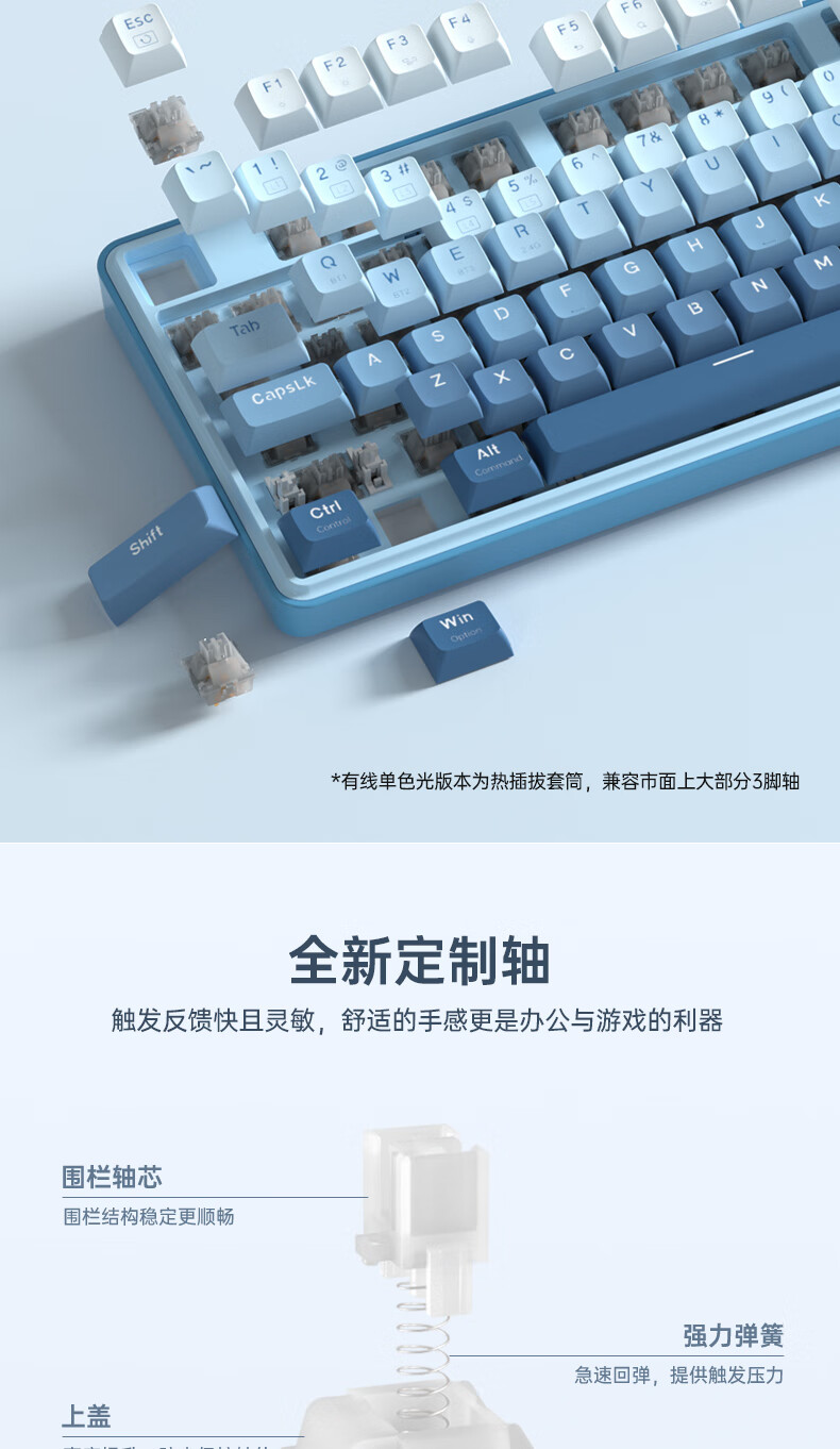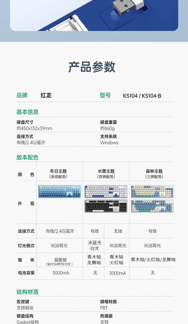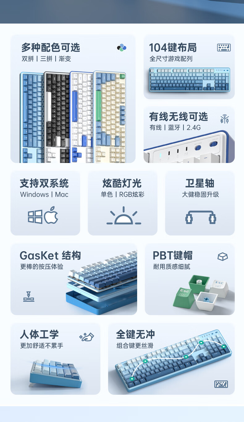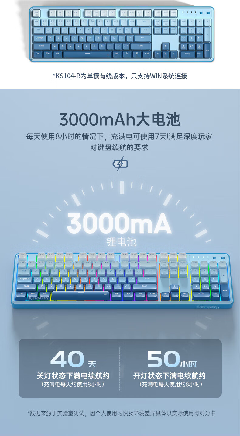 红龙(REDRAGON)KS104-B 机械键盘 有线键盘 全键热插拔PBT键帽全键无冲104键游戏办公键盘 白蓝-青木轴