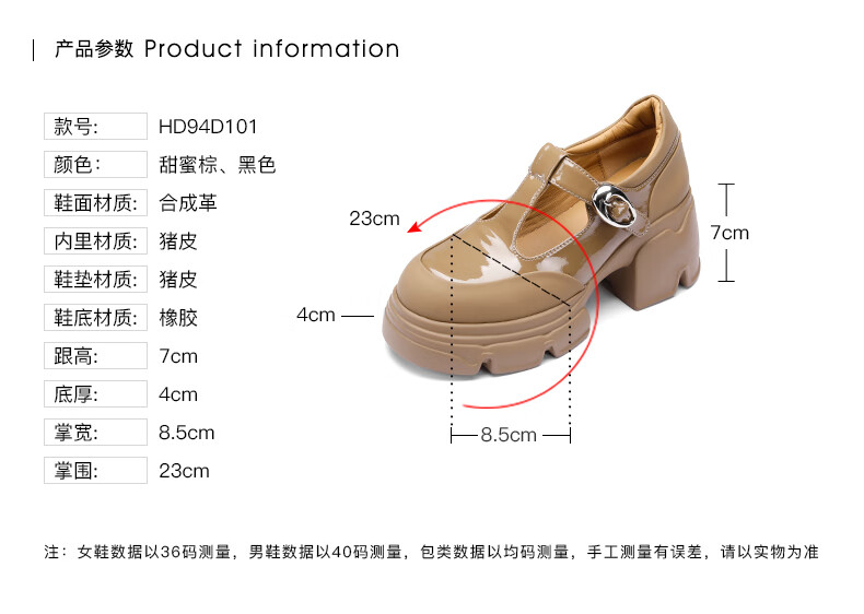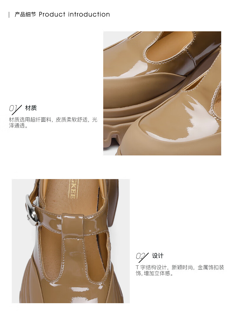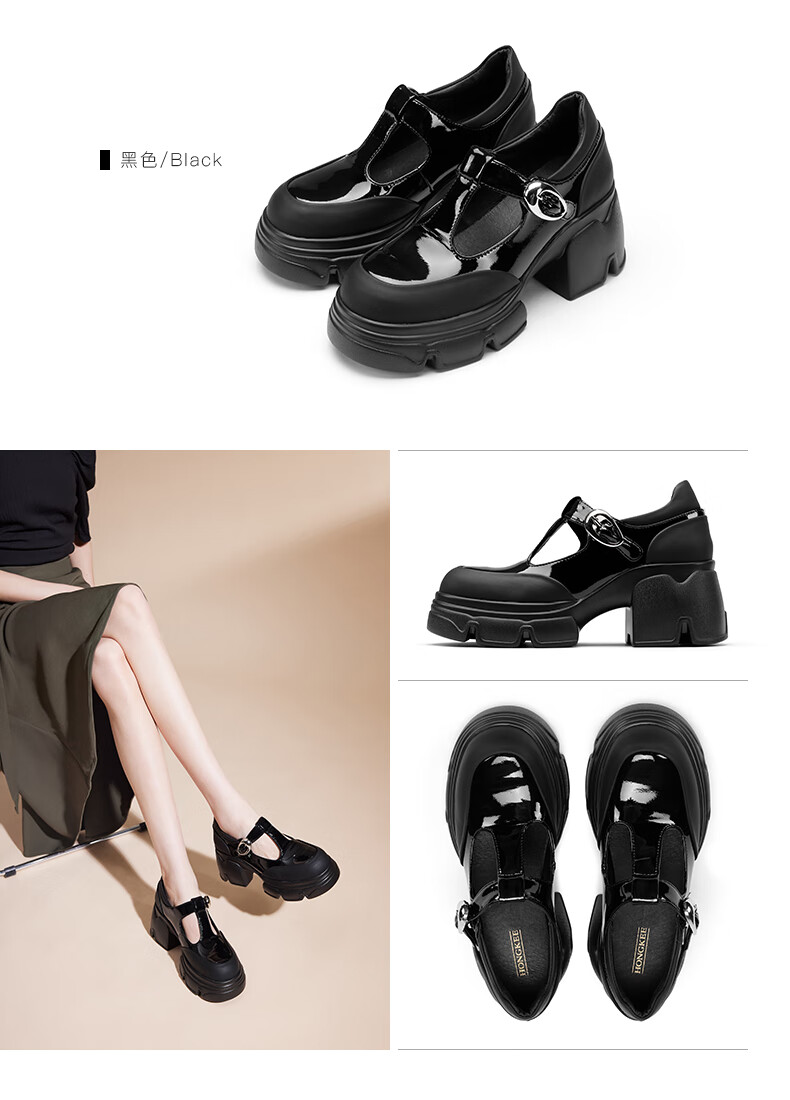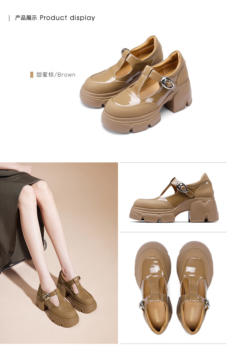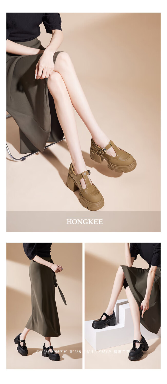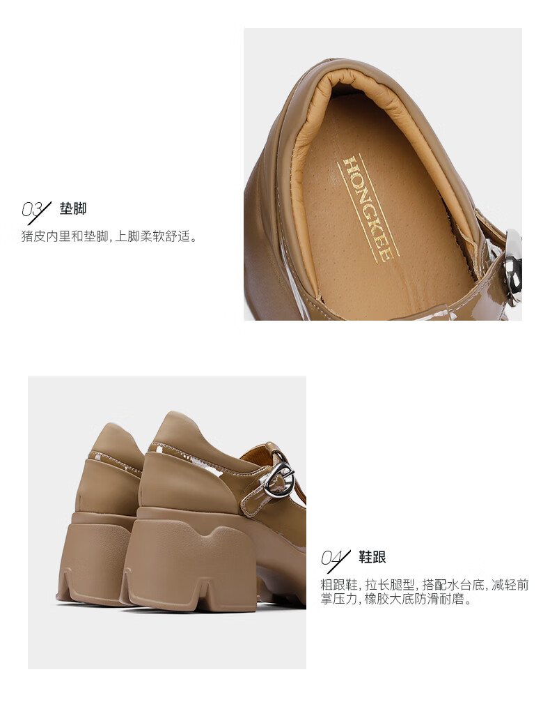 红科(HONGKEE)春季英伦风圆头粗跟金属饰扣时尚优雅玛丽珍单鞋女HD94D101 甜蜜棕 39