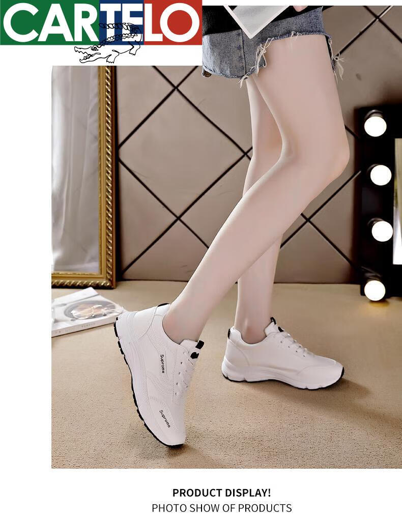 卡帝乐鳄鱼(CARTELO)真皮休闲运动鞋女百搭新款透气轻便平底跑步鞋女小白鞋防滑鞋 白黑皮面-四季款 8902 37