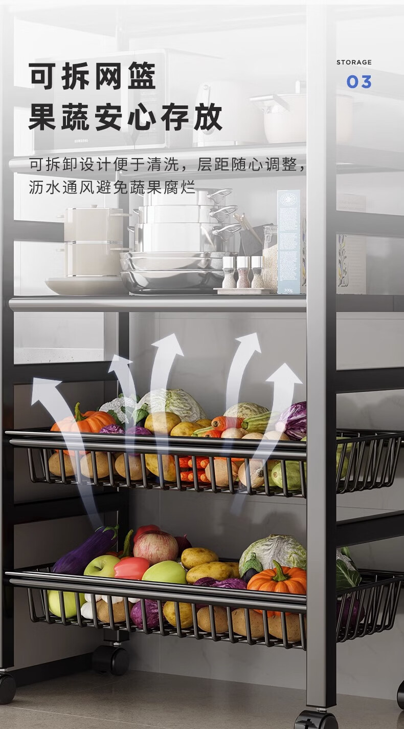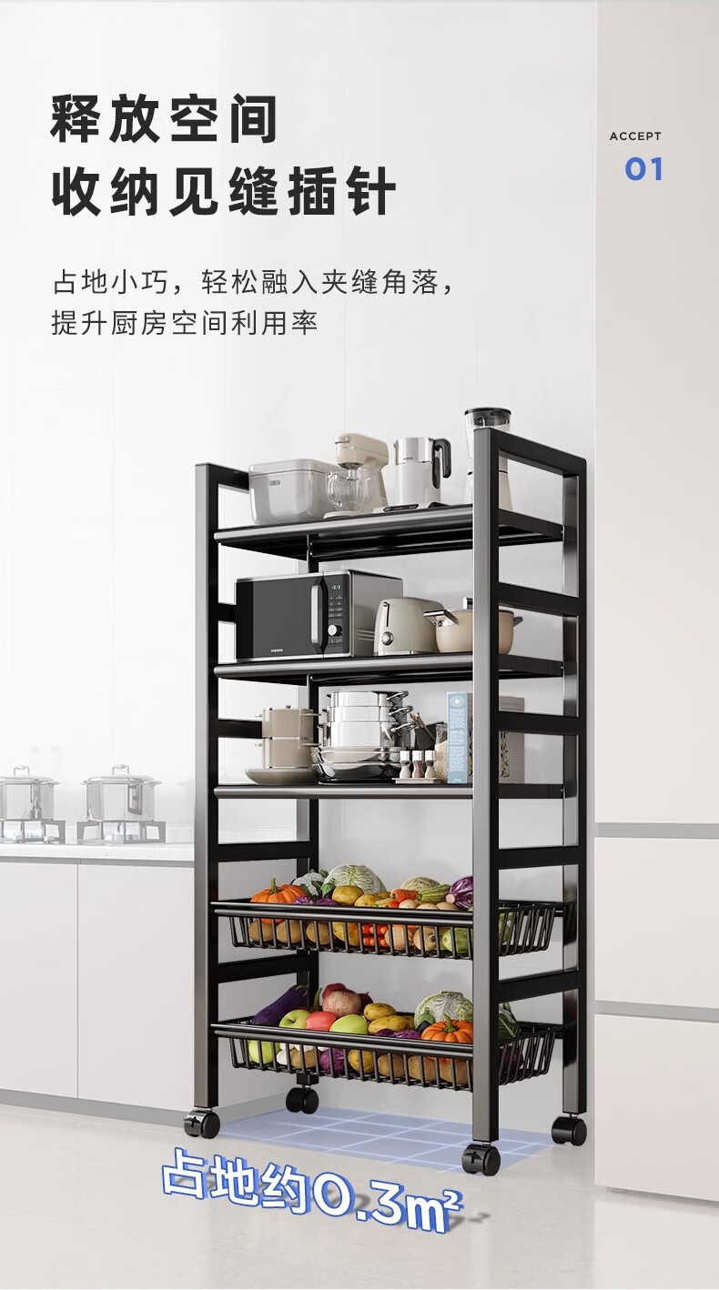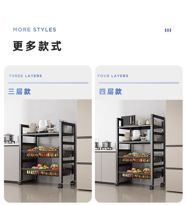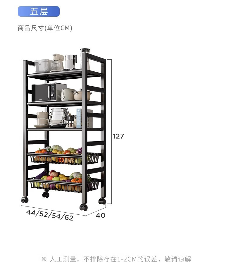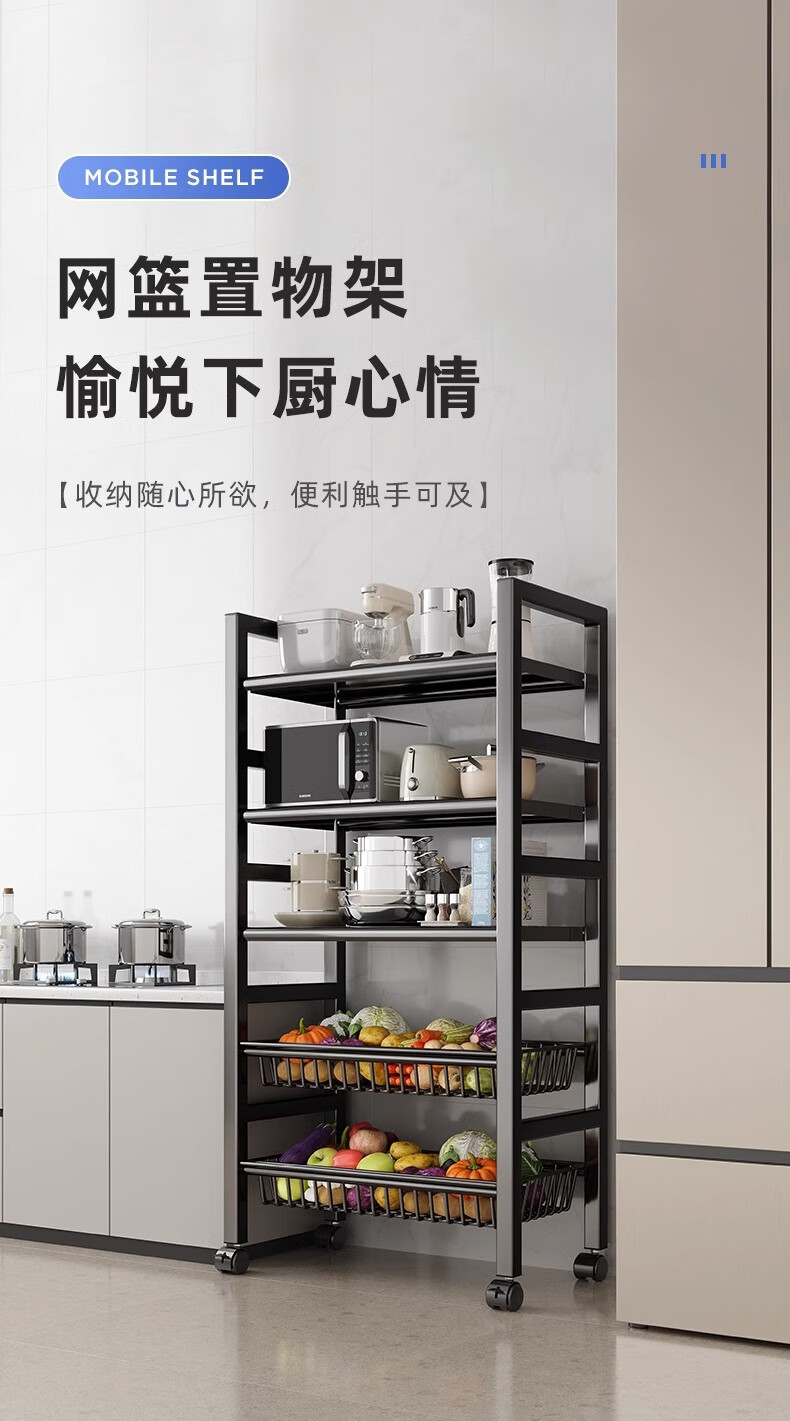 桦氏厨房置物架落地可移动多层 微波炉收纳储物架带篮子多功能 加粗 三层44CM两网一板+2挂盒