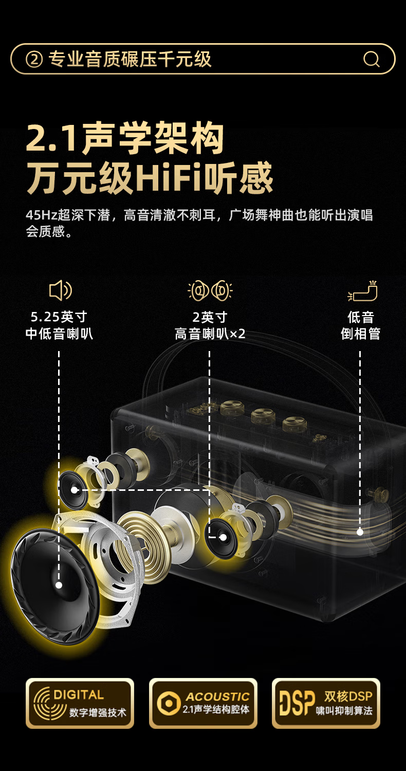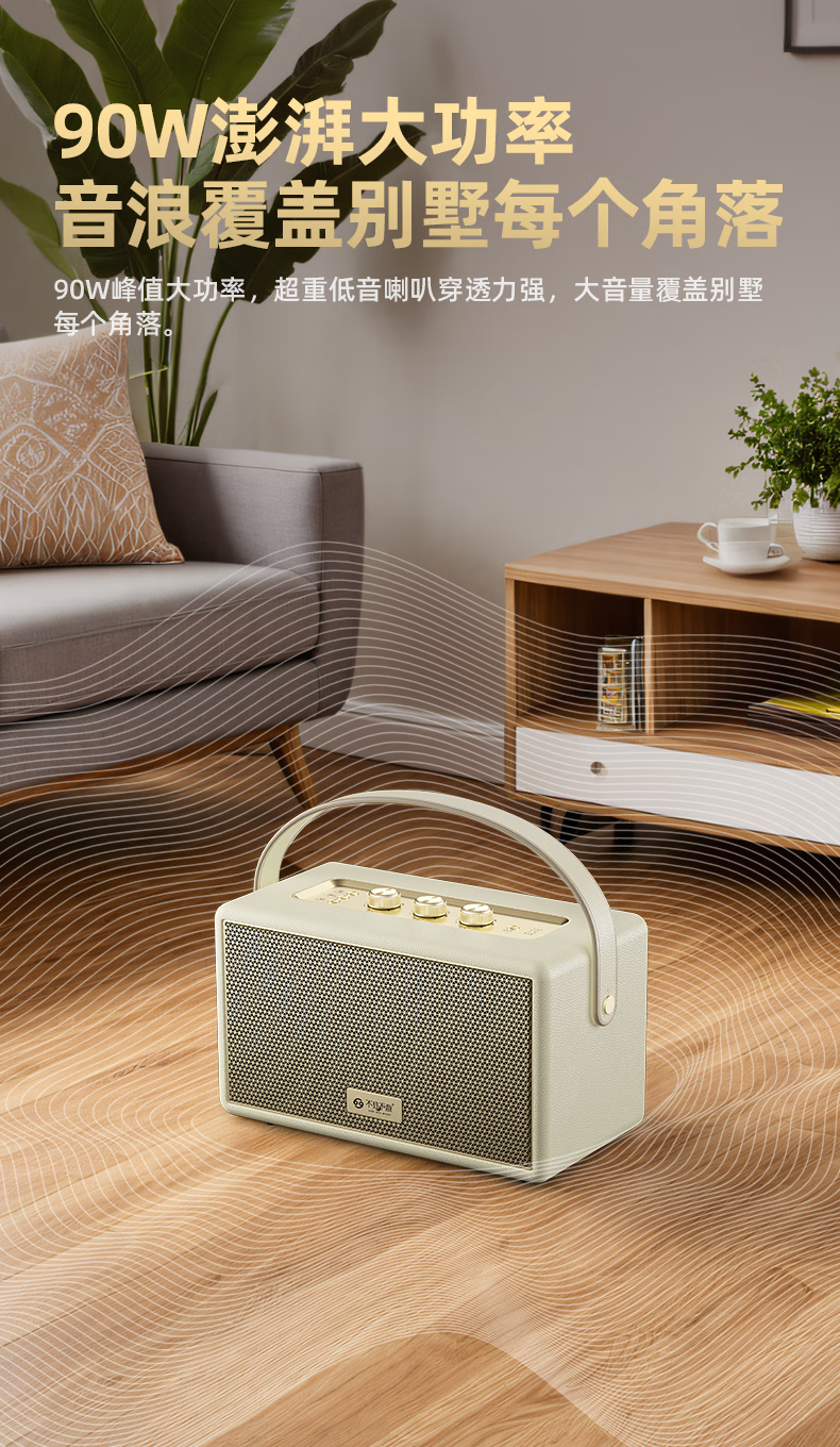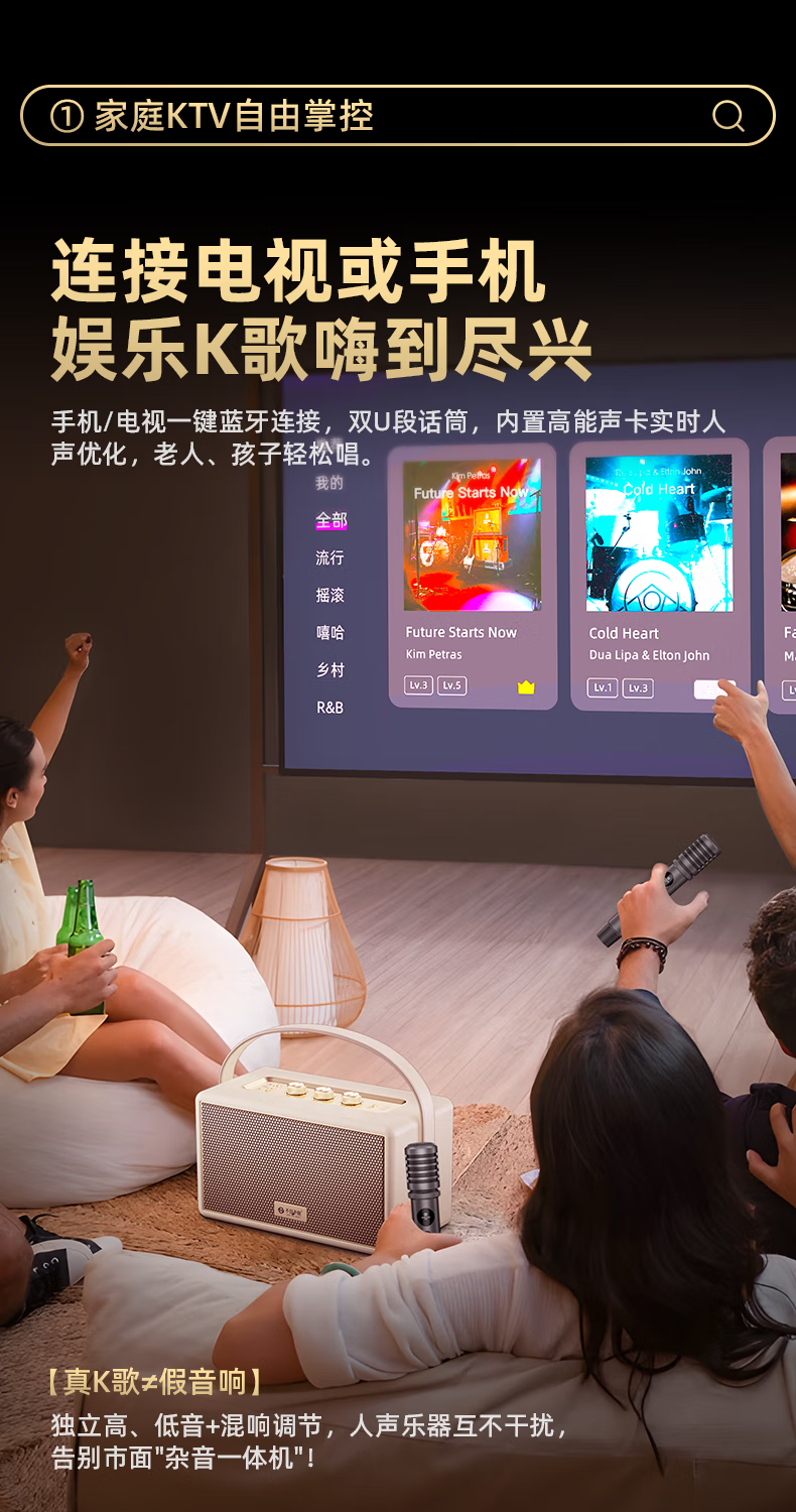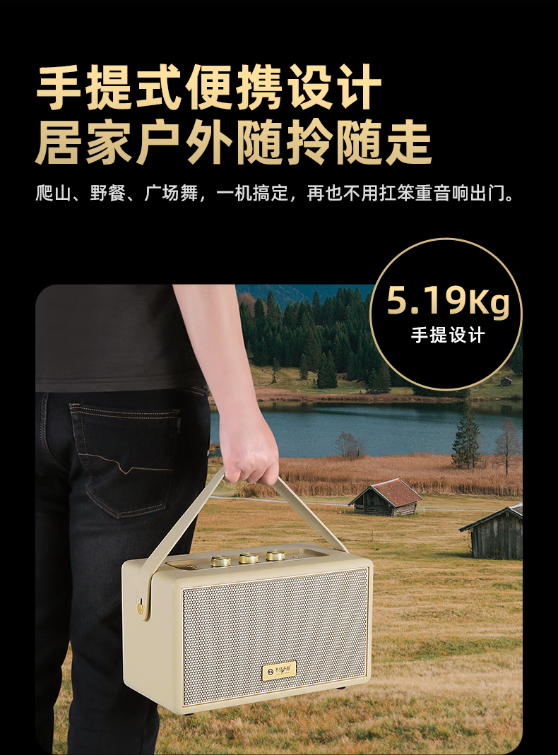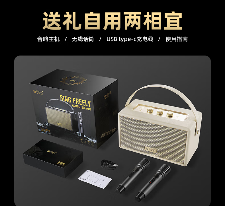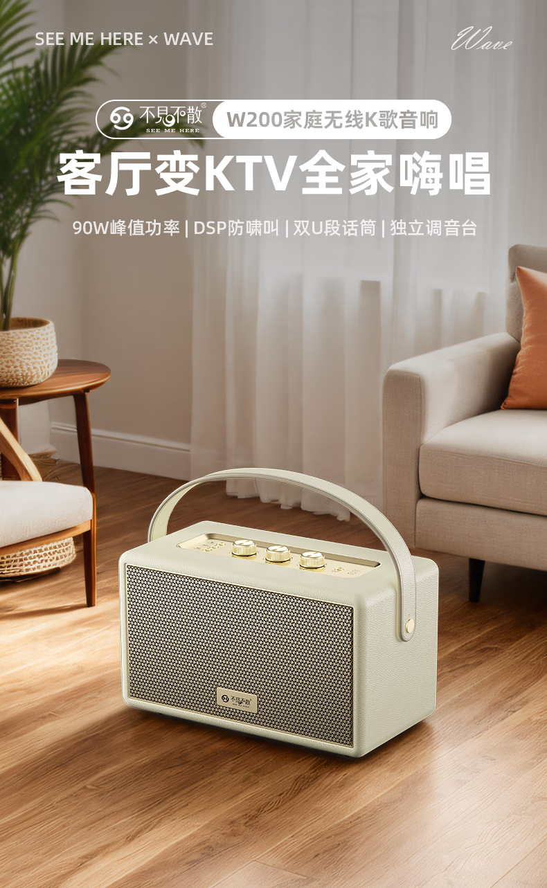 不见不散W200无线蓝牙音箱【帮下歌】手提便携式广场舞立体环绕音响家用K歌麦克风一体机大音量唱歌高音质 乳酪白【双麦】