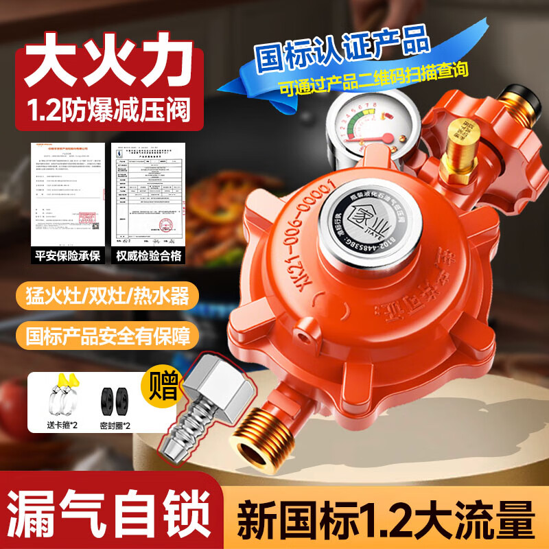 家业 液化气罐煤气减压阀新国标1.2安全阀自动关闭燃气灶阀门大火防爆 【插口】大流量1.2带表+1.5米管 以换代修-值得信赖