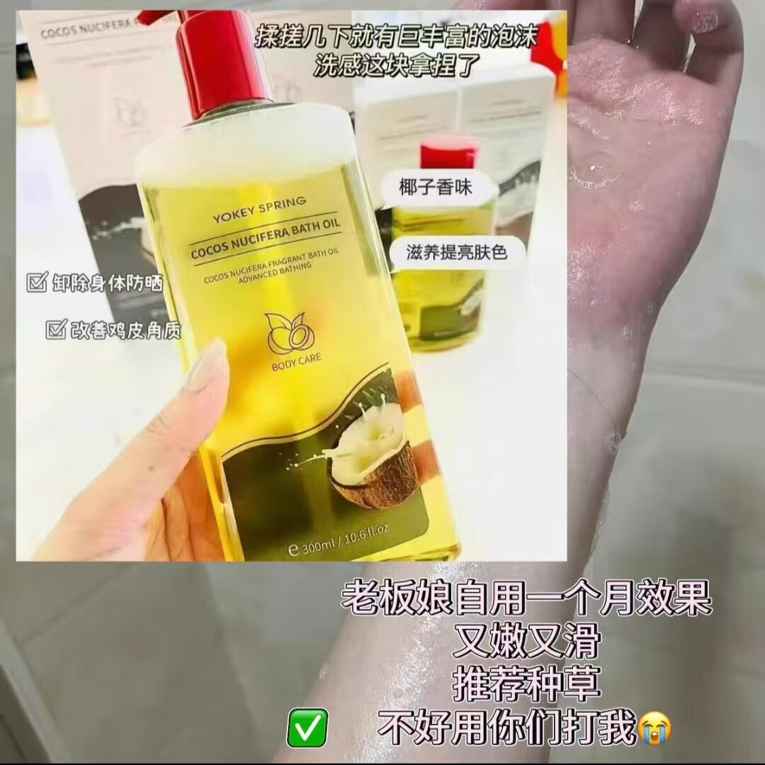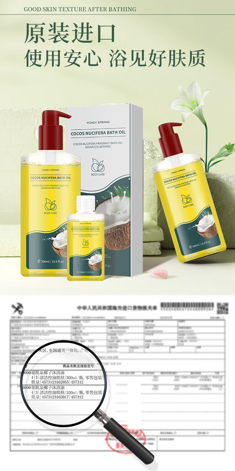 YOKEY SPRING 郁肌泉英国进口椰子沐浴油全身清洁去角质除螨改善粗糙润肤保湿滋润美肌 300ml*1瓶+100ml*1瓶+沐浴球【三件套】