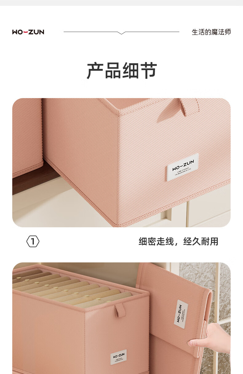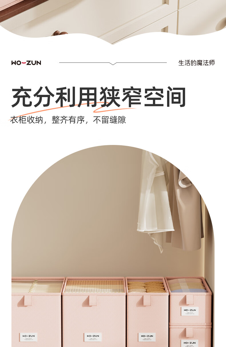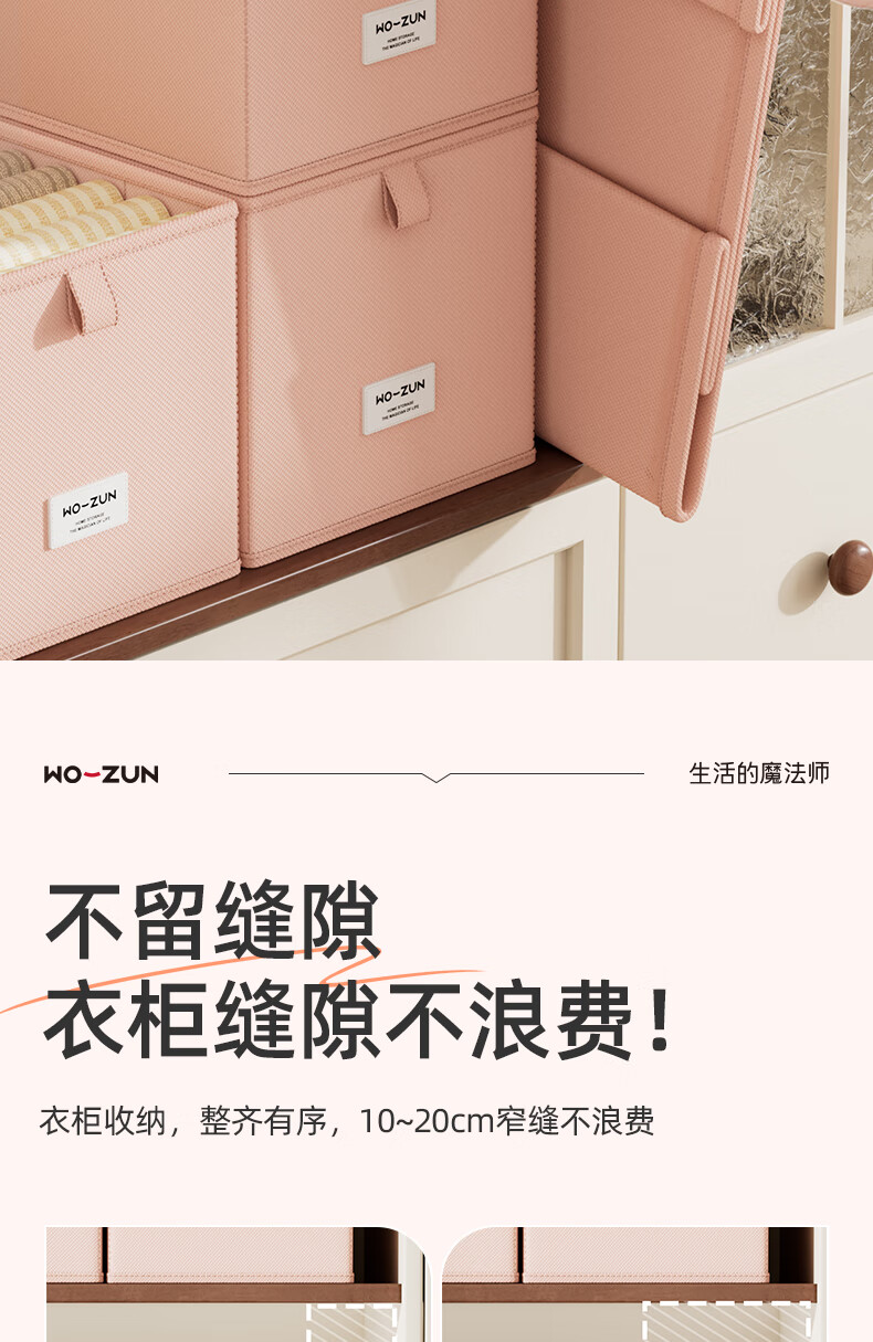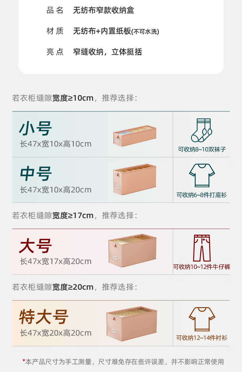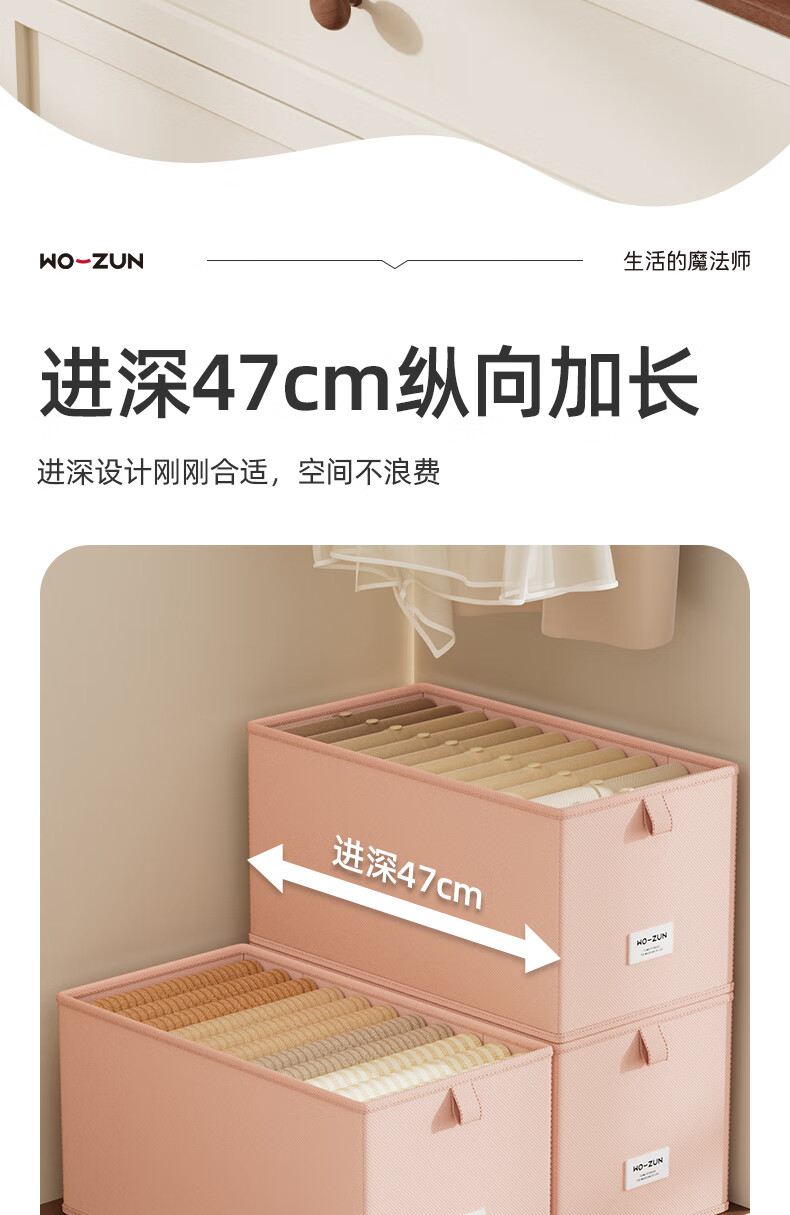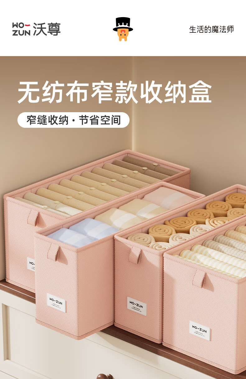 沃尊窄长型收纳盒缝隙放在衣柜整理盒裤子收纳神器深柜窄款衣物收纳盒 粉色小号【深47*宽10*高10】