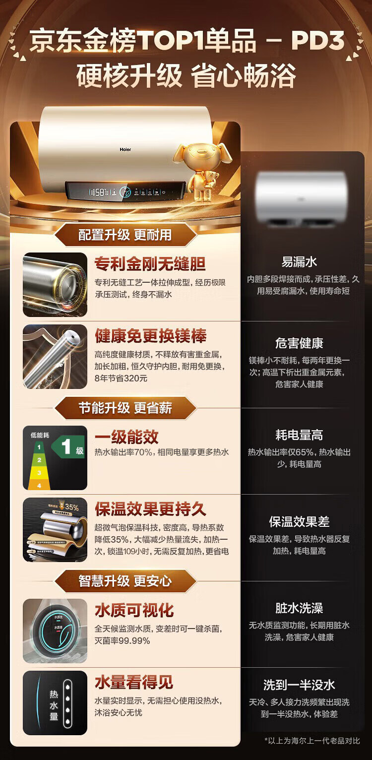 海尔(Haier)国家补贴20%电热水器50升PD3 金刚无缝胆终身免换镁棒一级能效节能省电储水式大水量家用京东自营