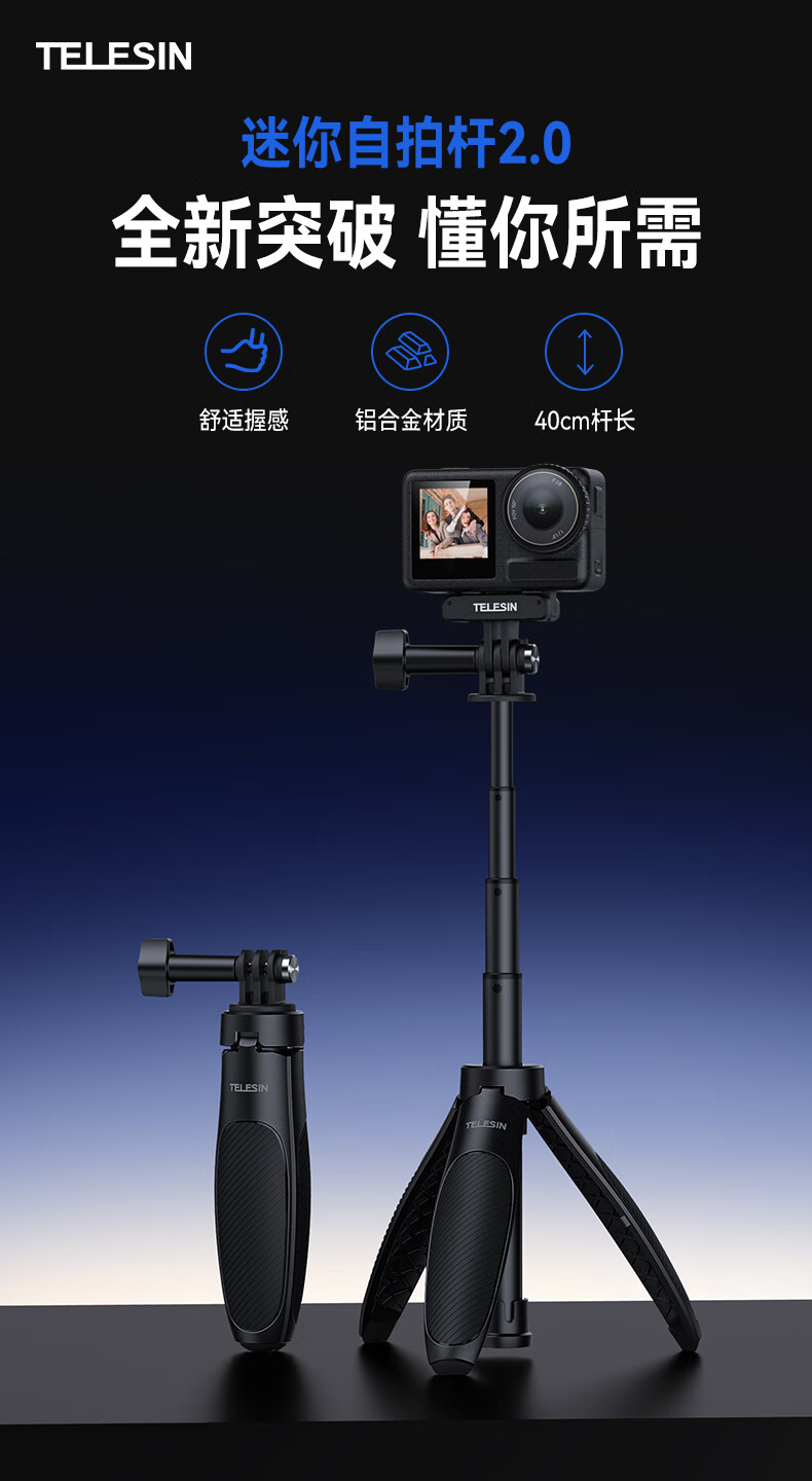 TELESIN(泰迅)迷你自拍杆2.0大疆action5pro 4三脚架osmo nano自拍杆insta360运动相机自拍杆gopro三脚架
