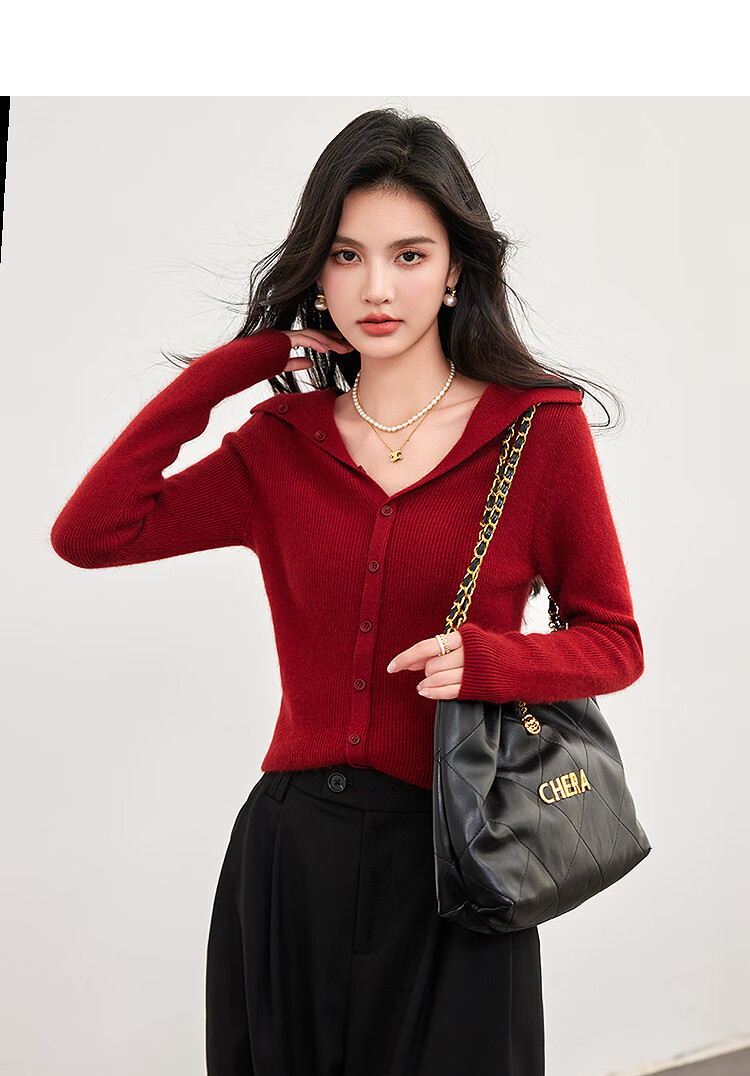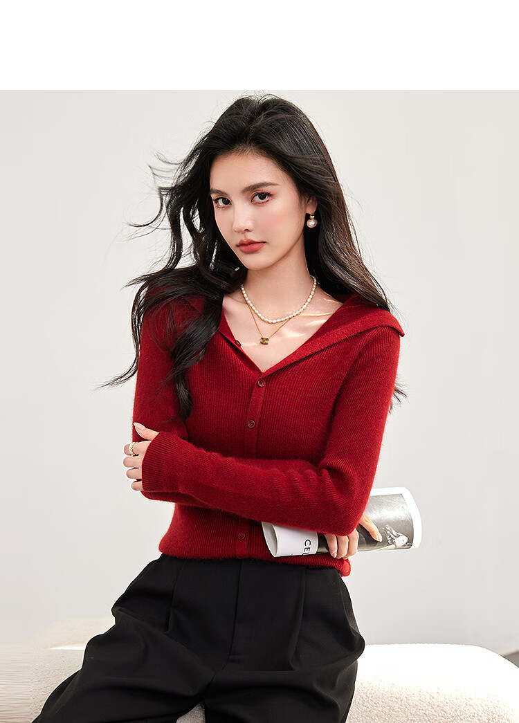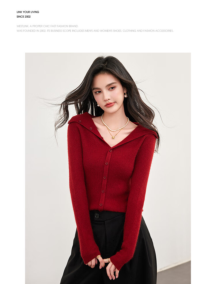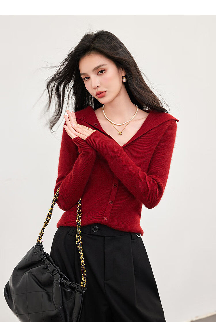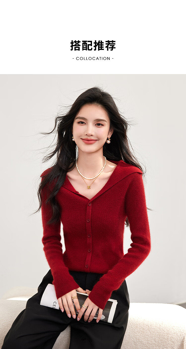 西遇红色针织开衫女2025年秋季新款设计感V领修身显瘦打底毛衣 红色 (预售15天) M (160)