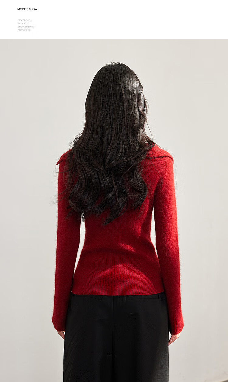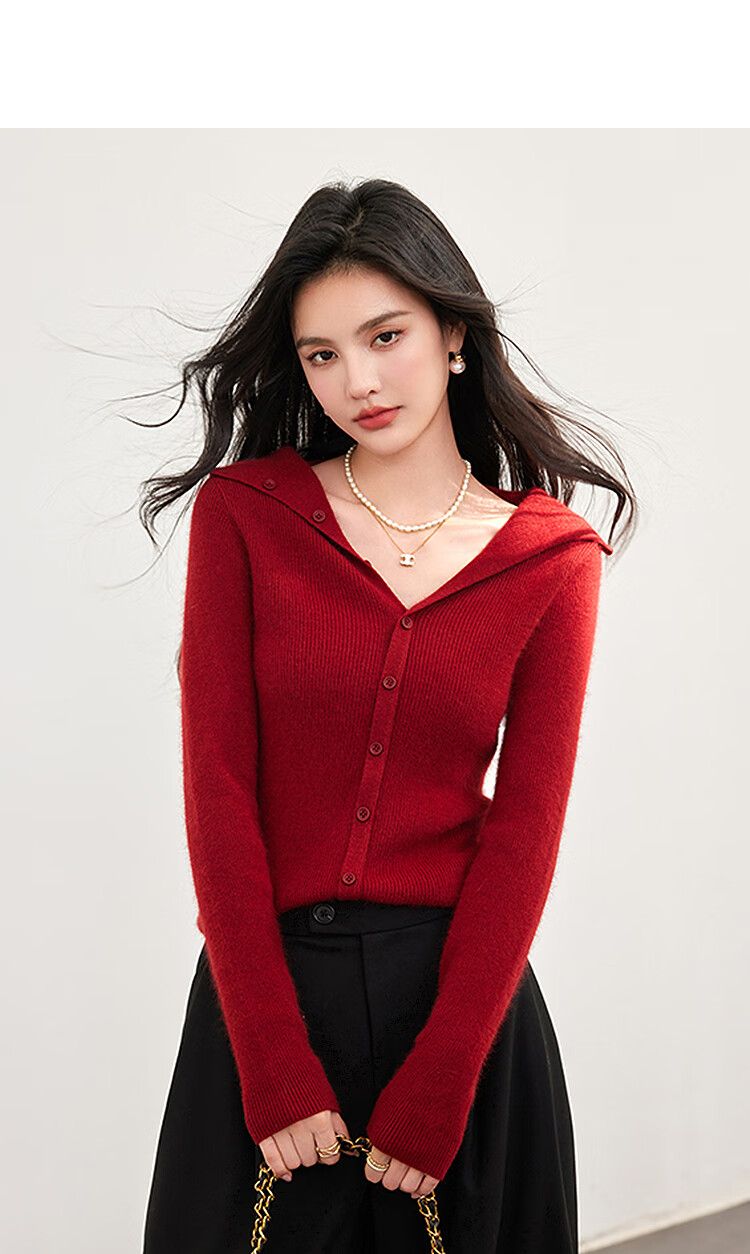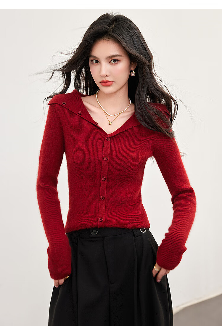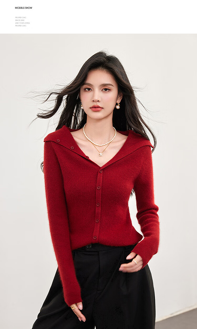 西遇红色针织开衫女2025年秋季新款设计感V领修身显瘦打底毛衣 红色 (预售15天) M (160)