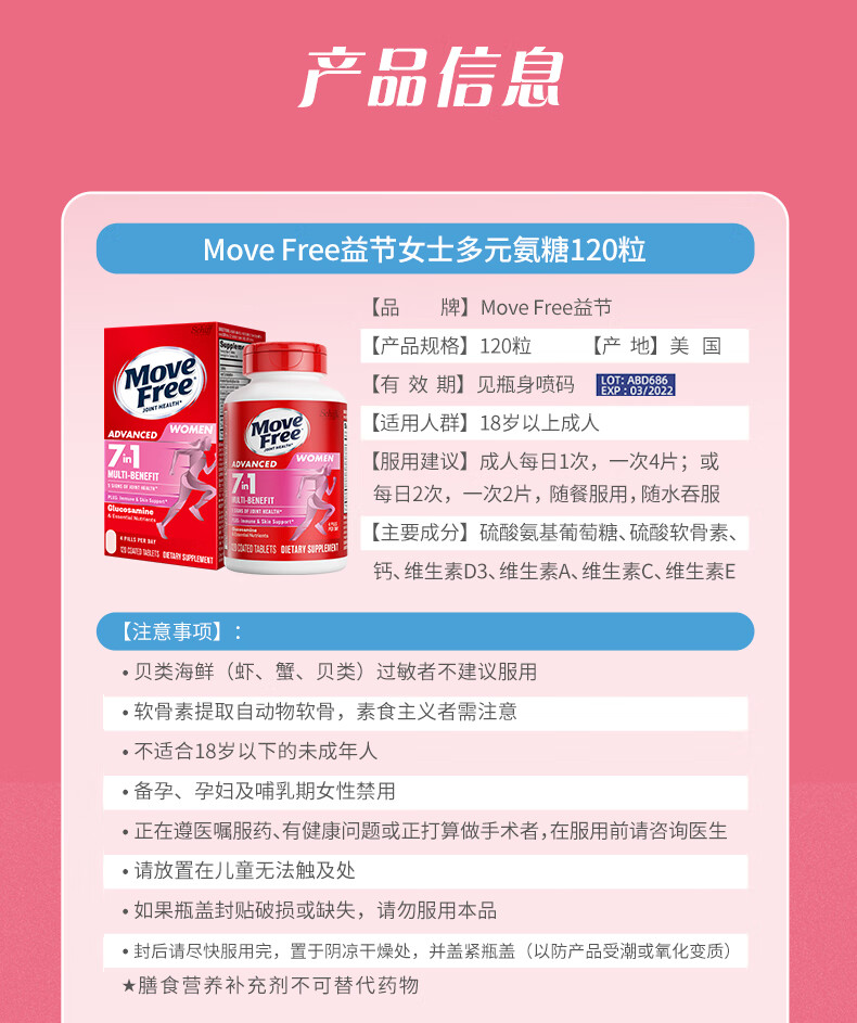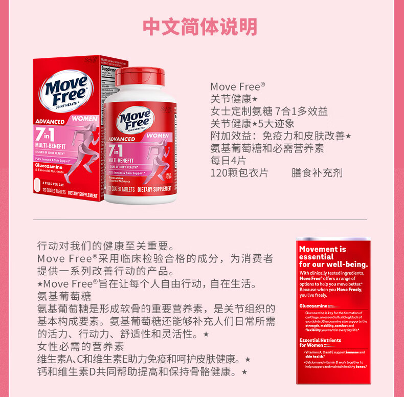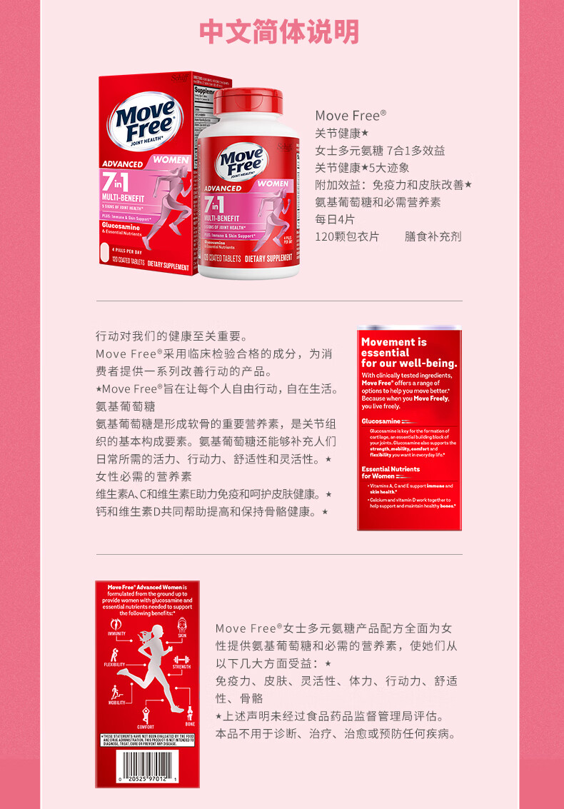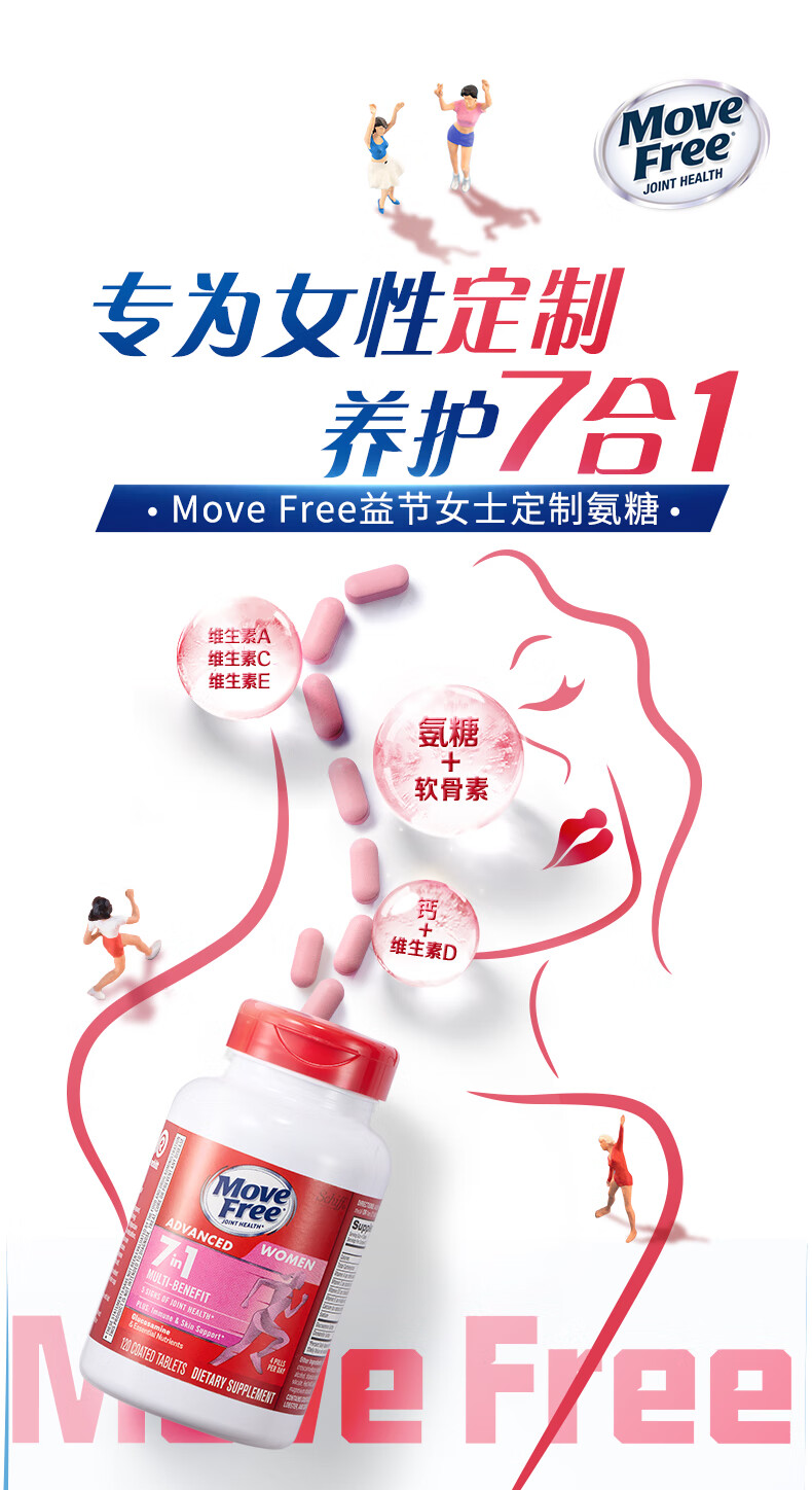 益节Move Free 7合1 女士 氨糖软骨素钙片120粒 维骨力 成人 美国进口 【女士氨糖】软硬骨同补 提气色