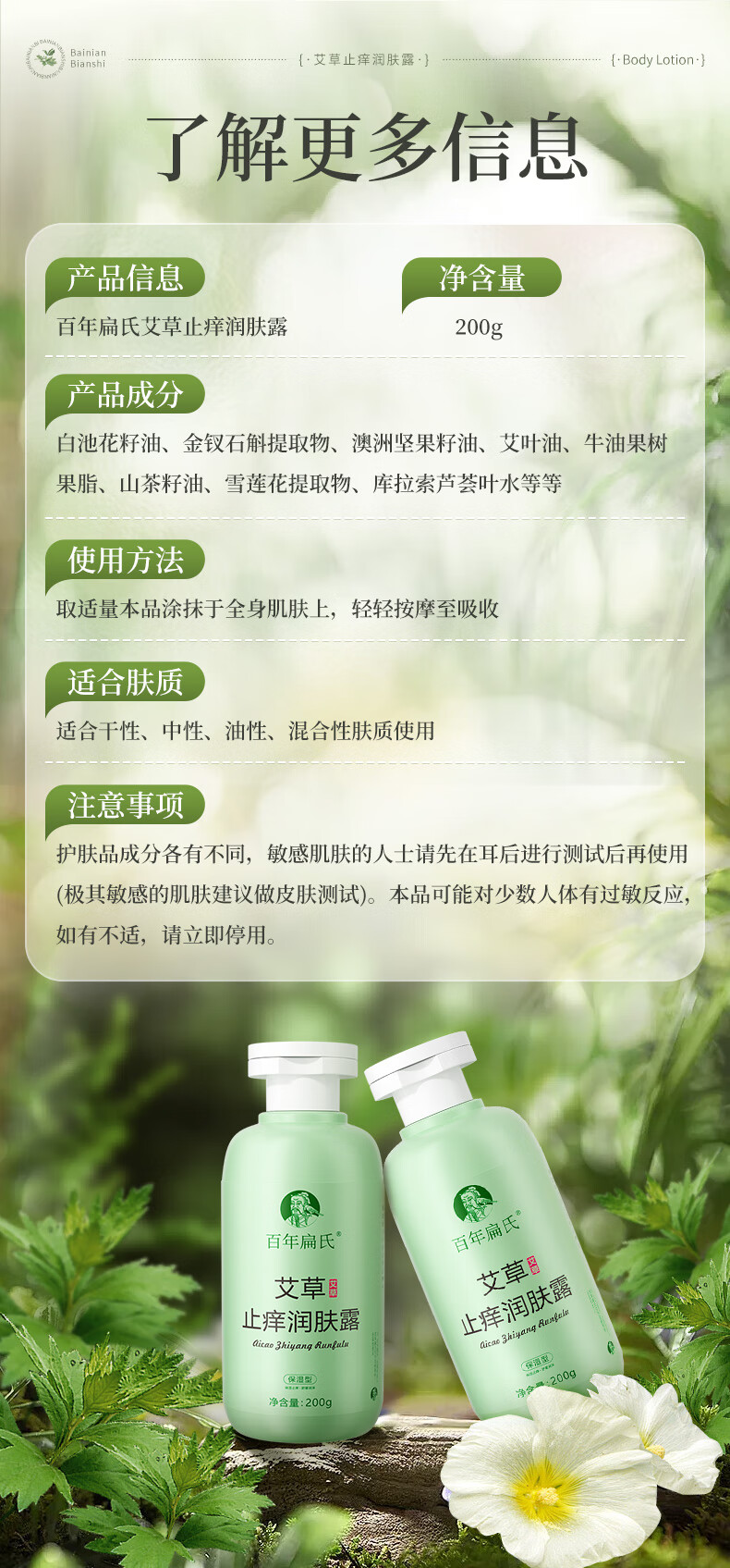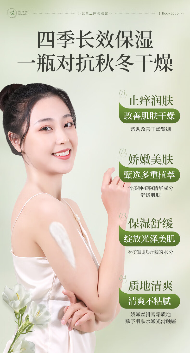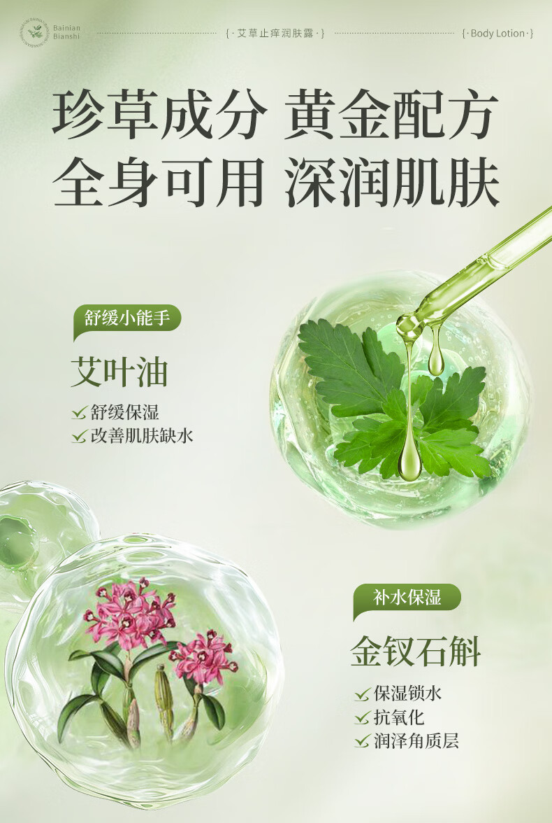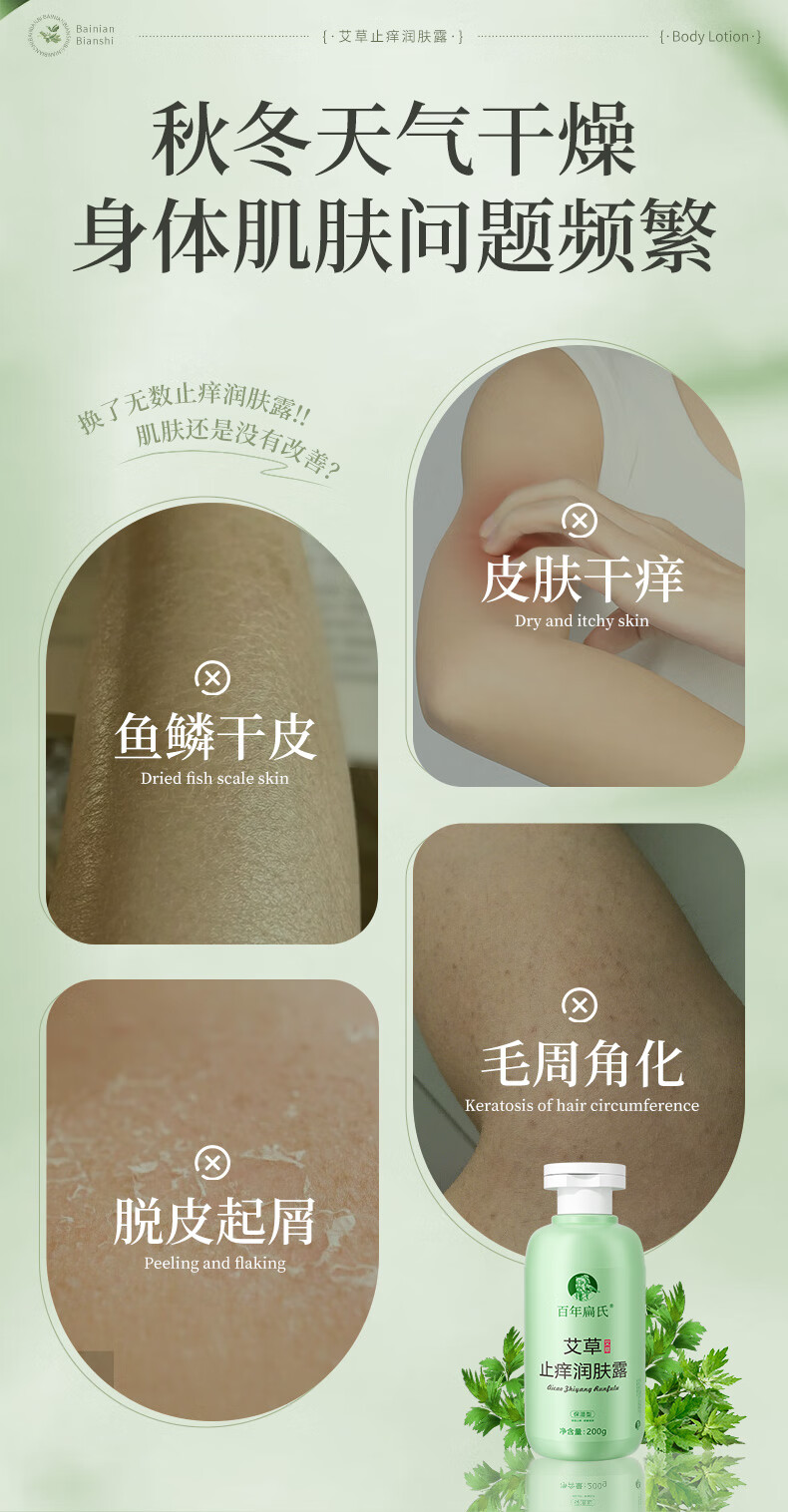 百年扁氏艾草止痒润肤露轻盈水润保湿干痒滋润全身皮肤干燥起皮补水 止痒润肤露2瓶装