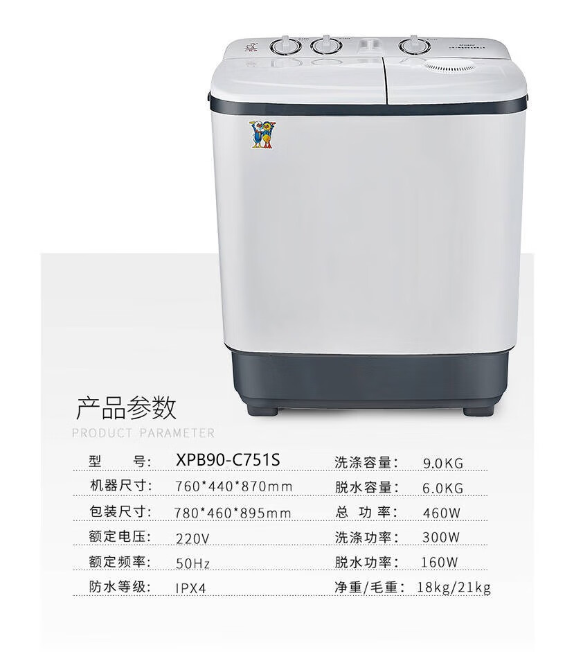 小鸭牌 洗+脱15公斤半自动洗衣机双桶 双缸大容量家用小型迷你波轮脱水半全自动迷你带甩干 洗涤9公斤+脱水6公斤【蓝光洁净强劲电机】