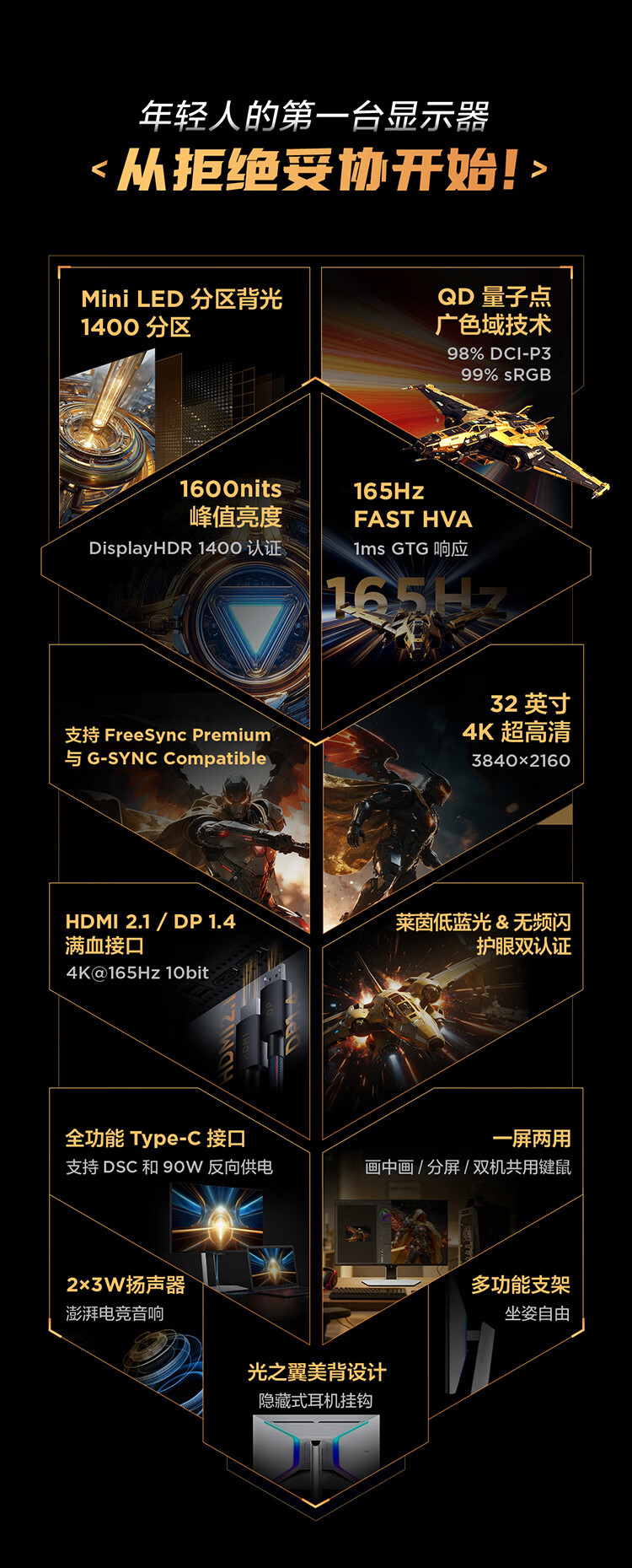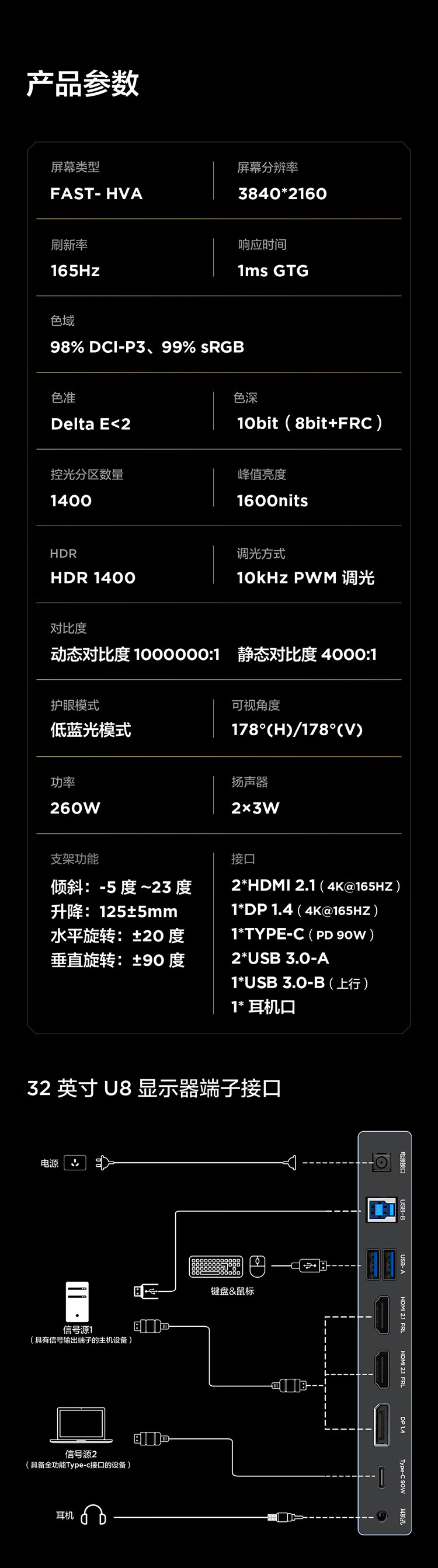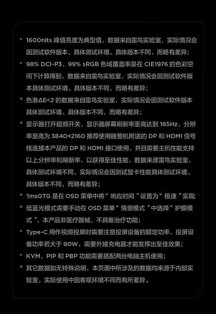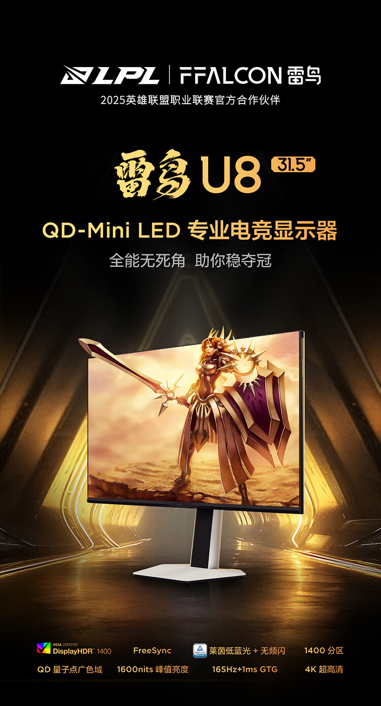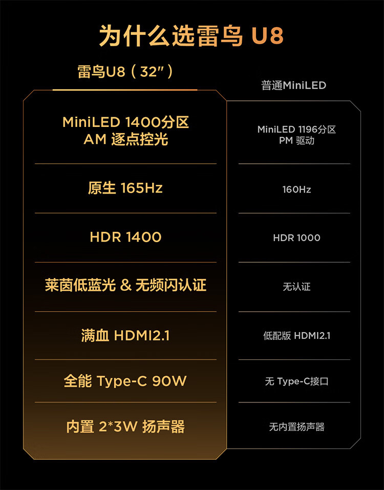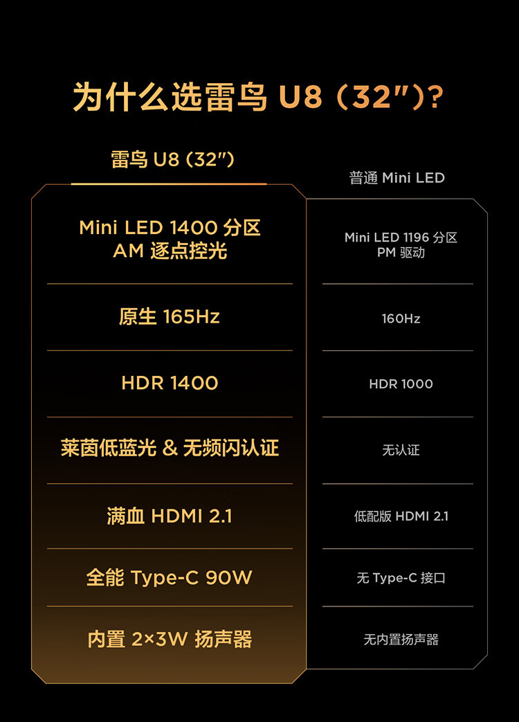 雷鸟32U8 31.5英寸4K165Hz高刷电竞显示器 1400分区QD-MiniLED HDR1400 Type-C 90W Switch2游戏显示屏 31.5英寸/4K165Hz/直面屏/内置音响