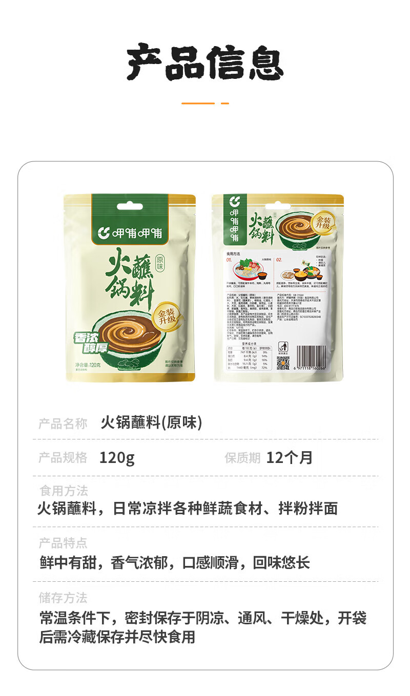 呷哺呷哺 火锅蘸料120g 麻酱调料拌面拌菜 原味120g*5袋