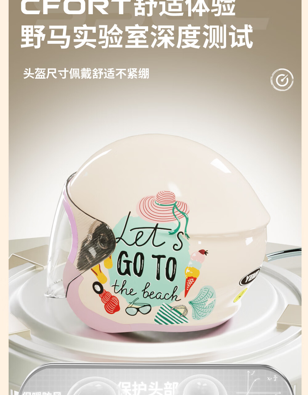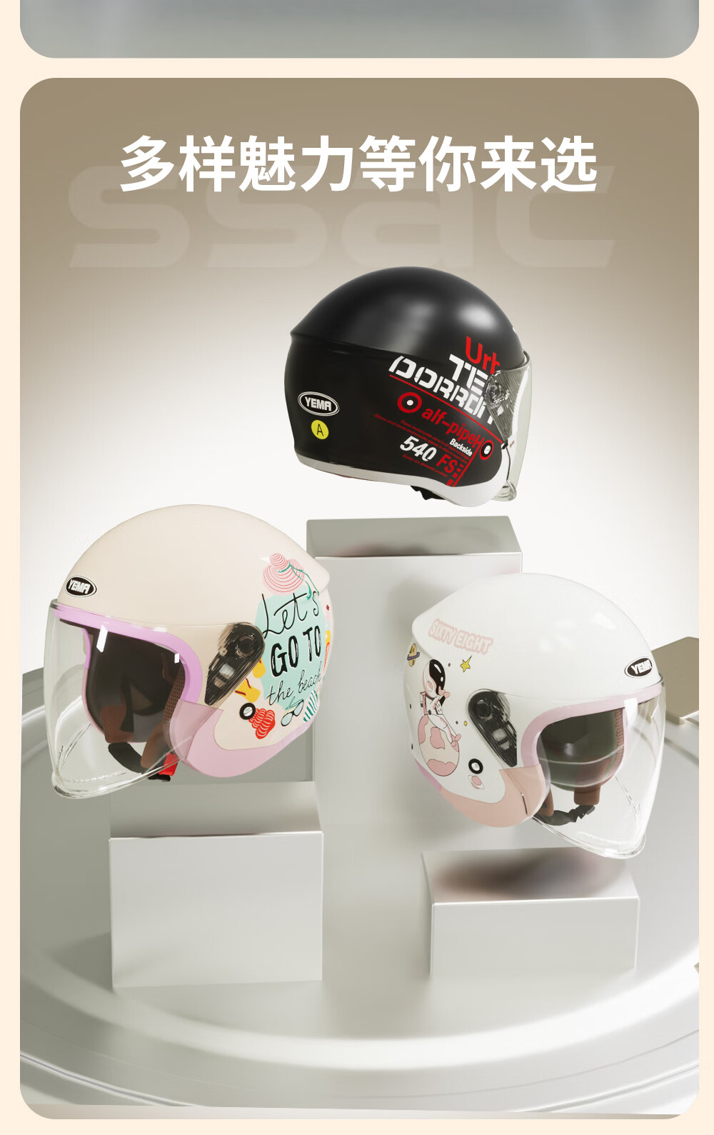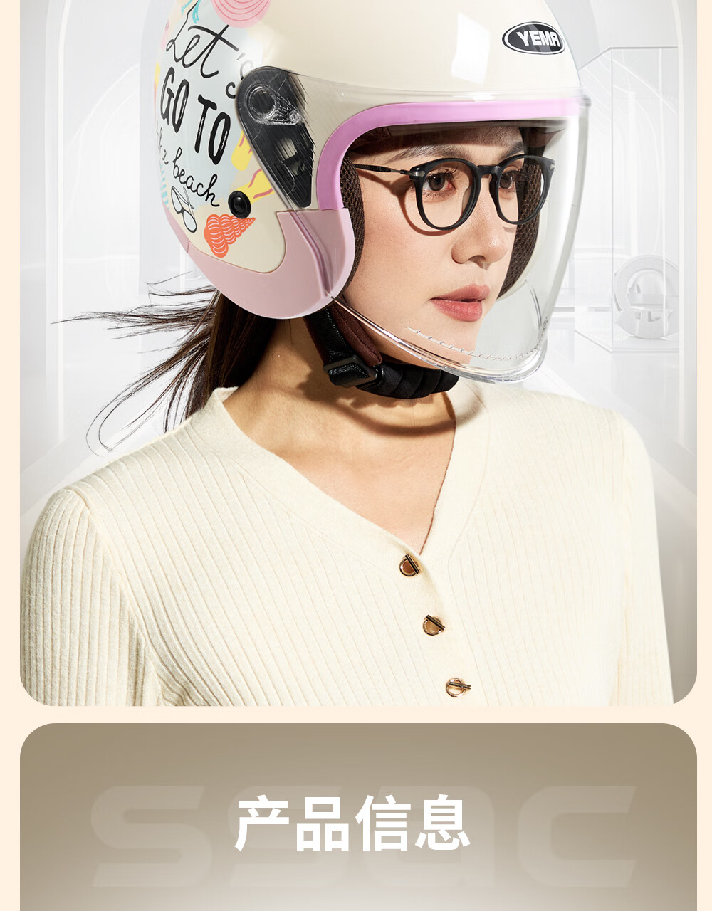 野马(YEMA)电动车头盔女士四季通用电瓶车半盔电瓶车成人可爱国标安全帽 卡其白花衣-透明镜+防雾贴片 均码
