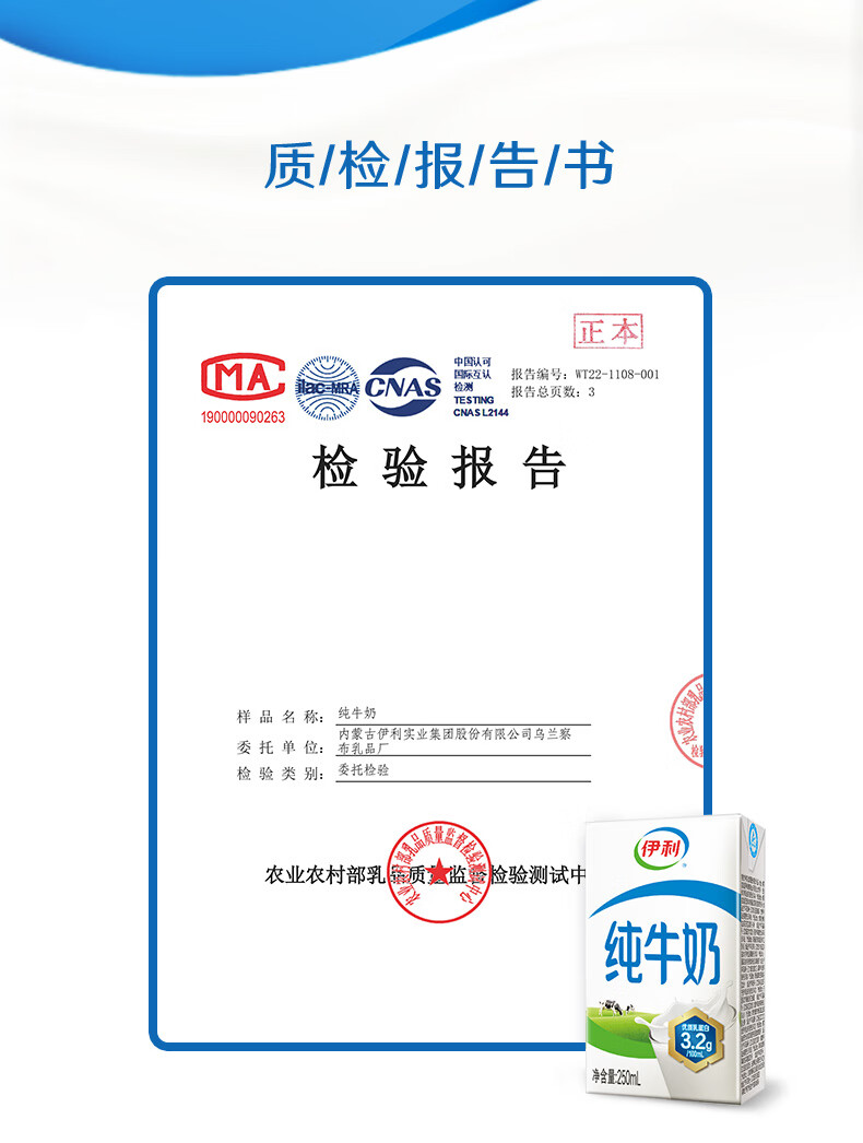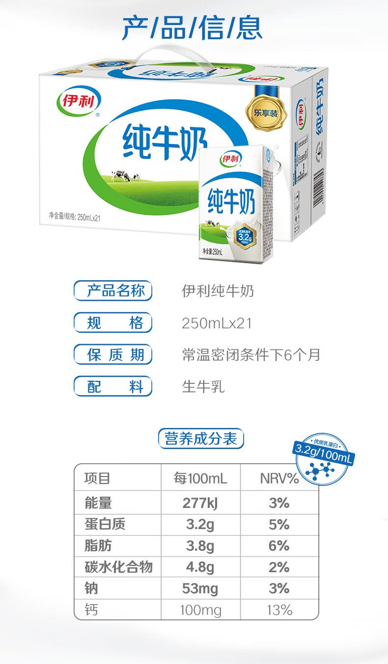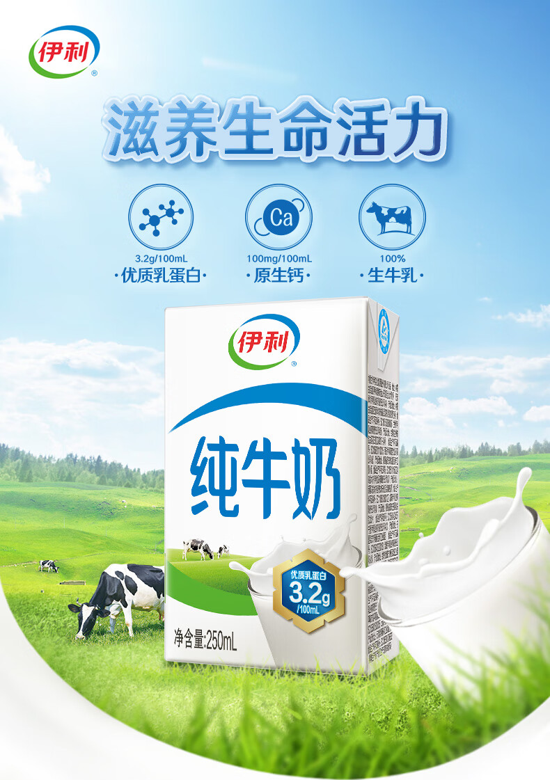 伊利纯牛奶250ml*21盒 全脂牛奶乳蛋白 早餐伴侣纯牛牛奶整箱 250ml*21盒/箱