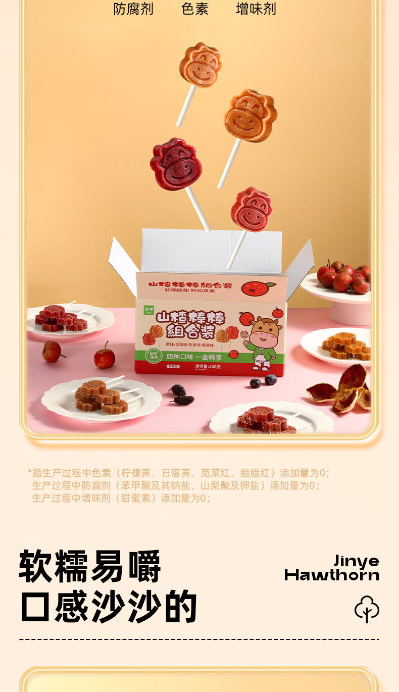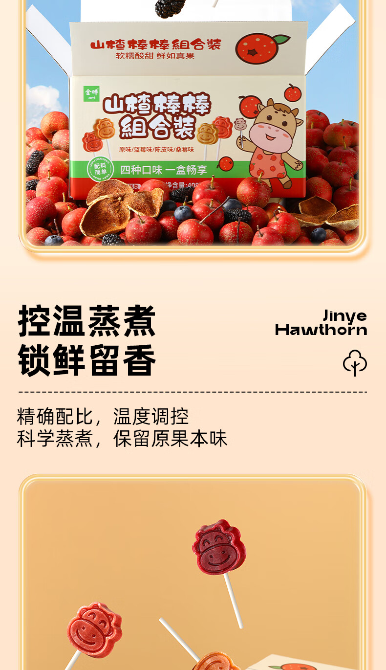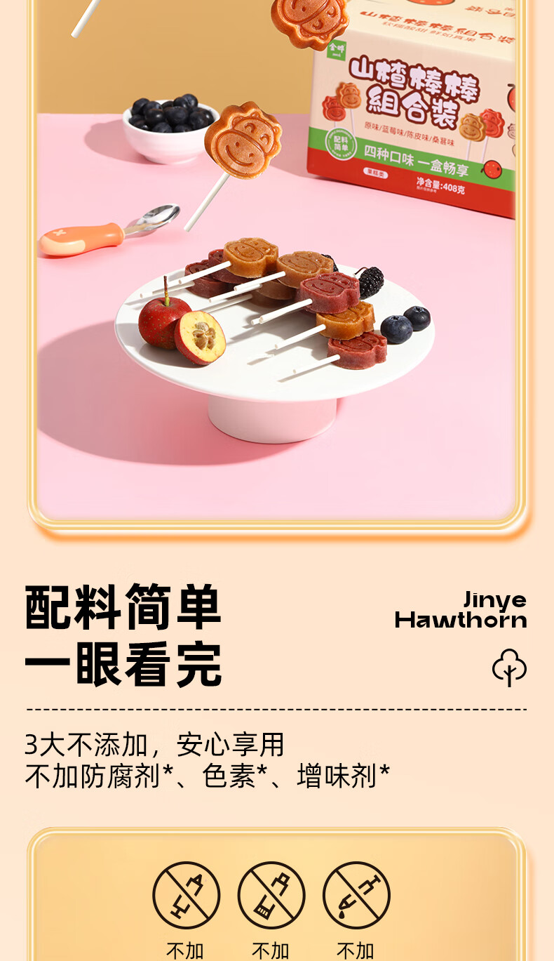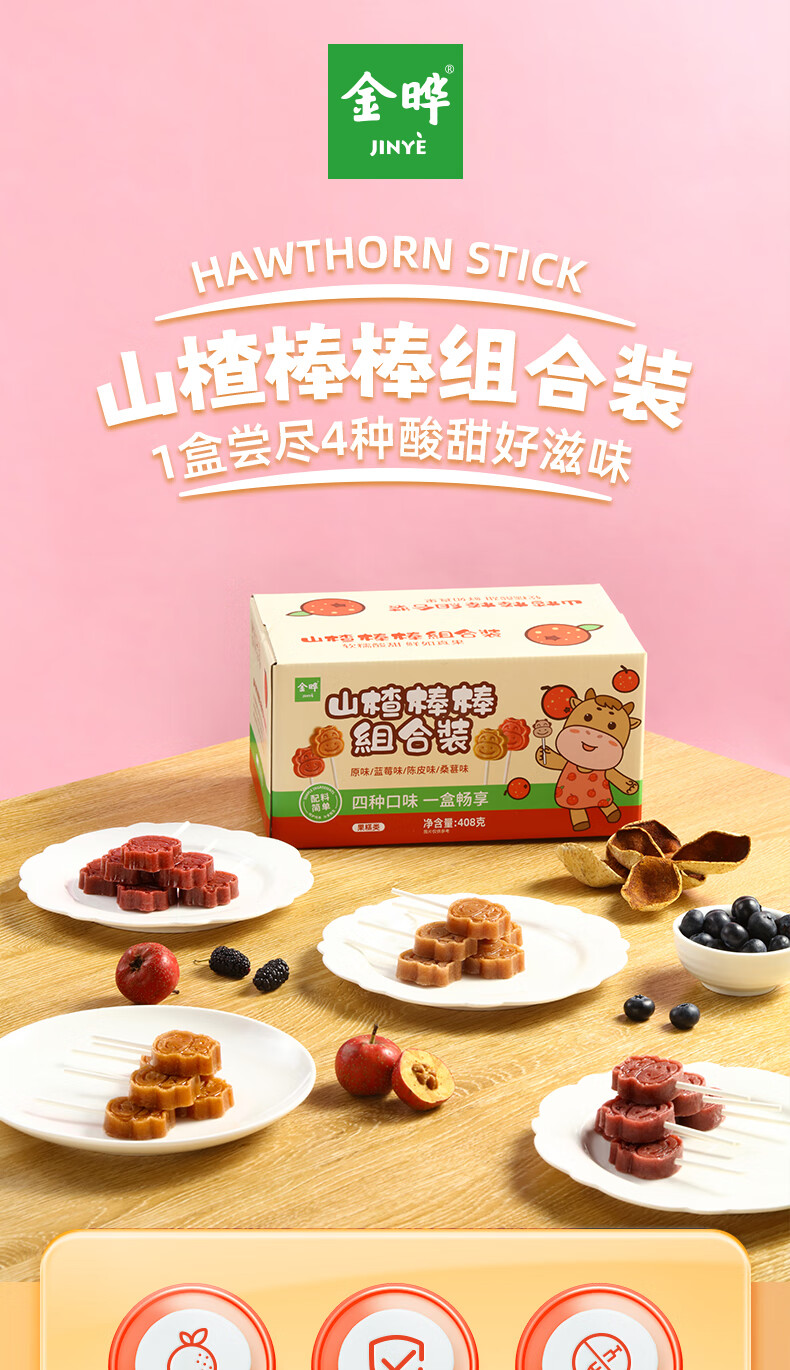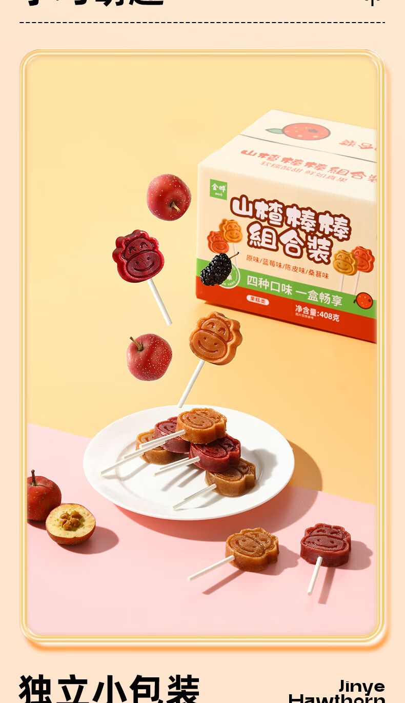 金晔山楂棒棒糖4种口味40支盒装无添加剂水果棒果干果脯蜜饯儿童零食 混合4口味山楂棒 408g*1盒