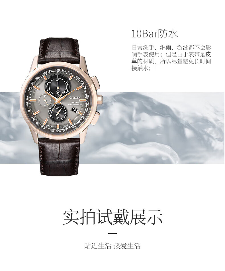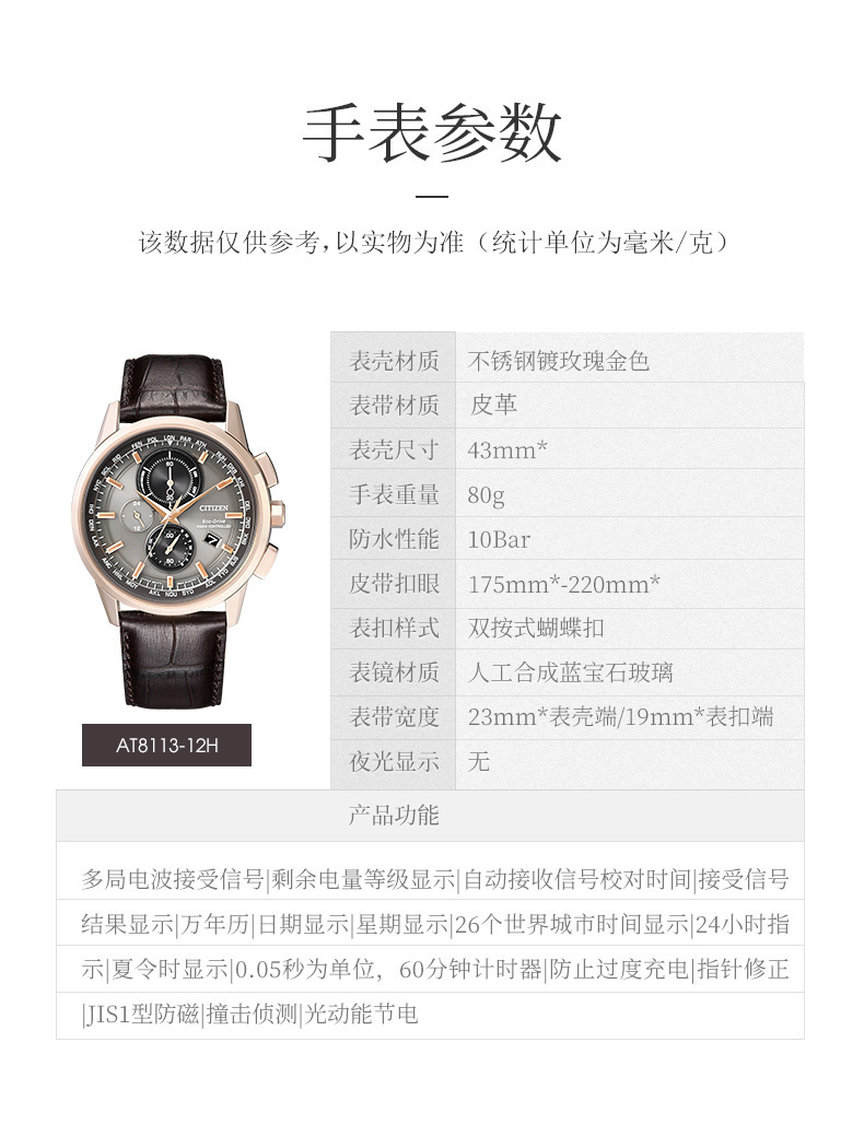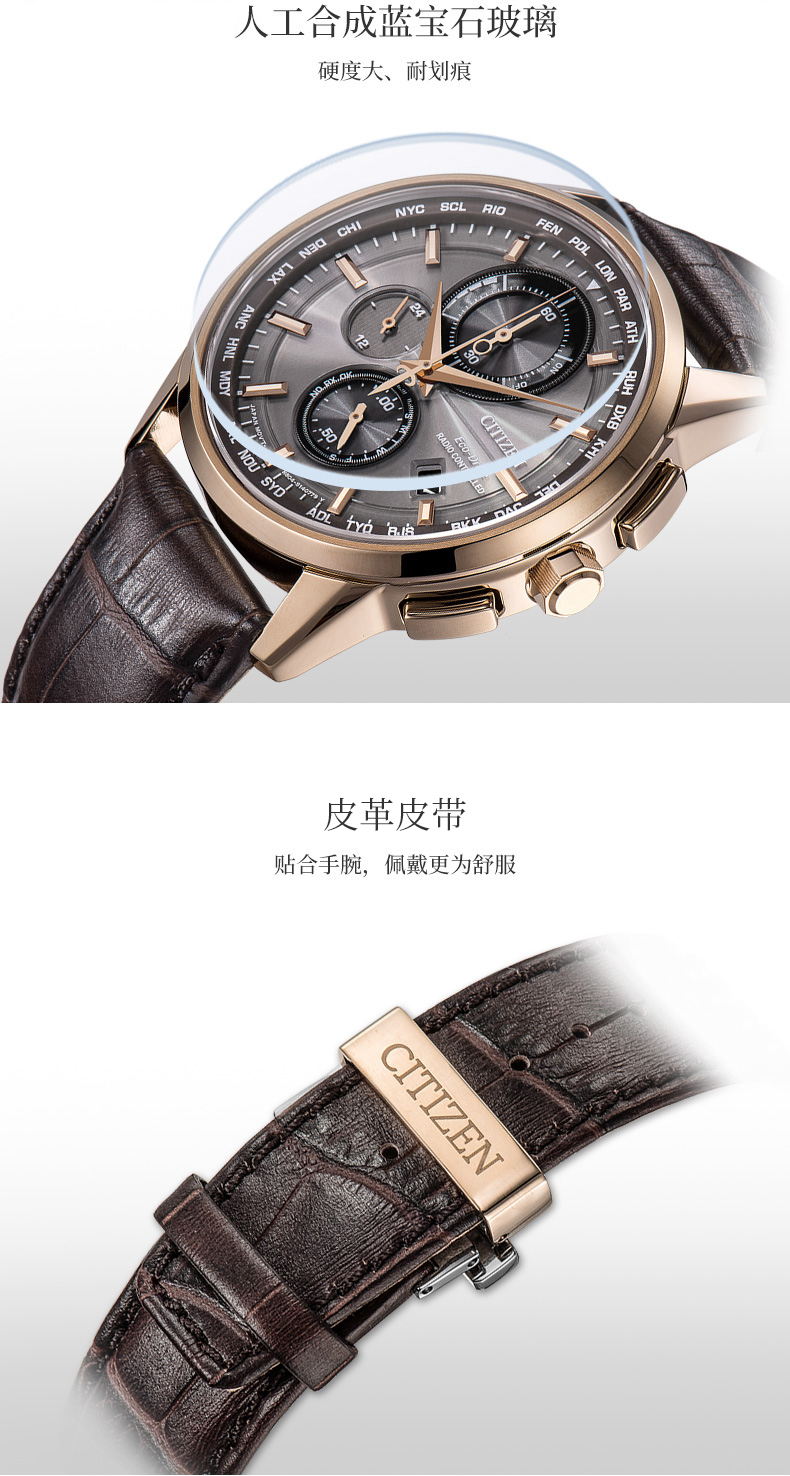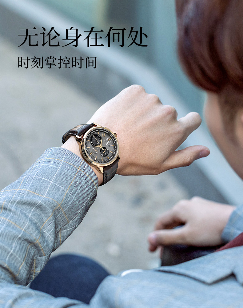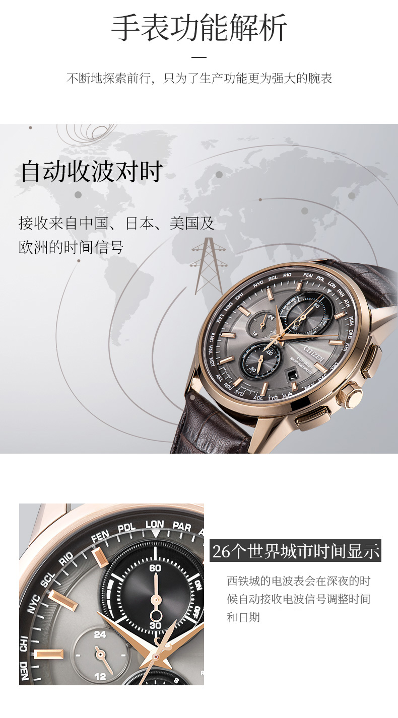 西铁城(CITIZEN)手表男日韩表光动能电波三眼日显皮带商务送礼物男友AT8113-12H