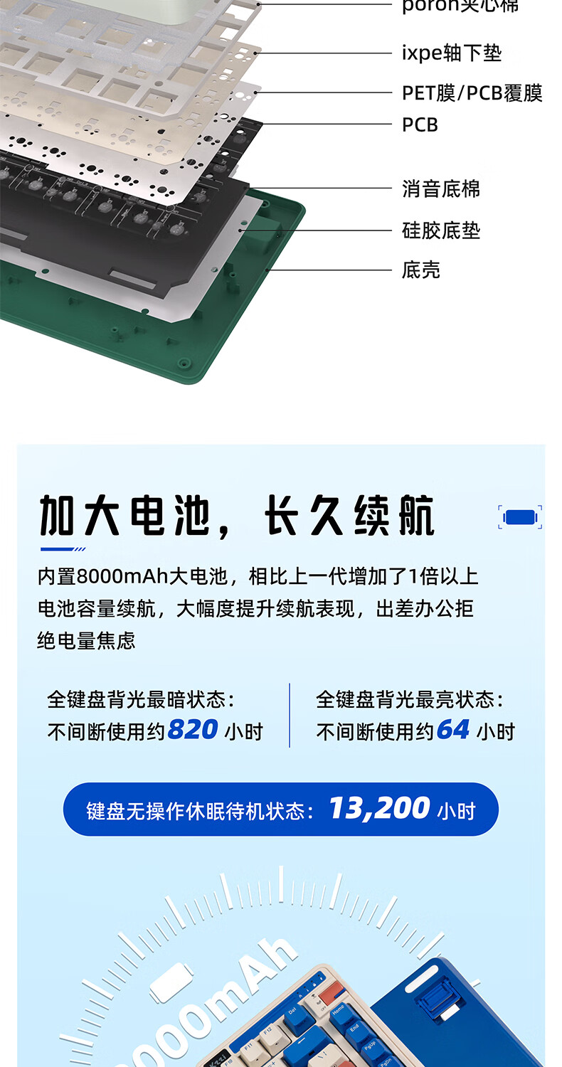 KZZI K75V2 客制化三模机械键盘无线蓝牙有线gasket结构全键热插拔电竞游戏办公笔记本通用RGB灯效 冰川蓝【风雨轴V2】-8000毫安-三模 三模(有线/蓝牙/2.4G) 75%配列(82键)