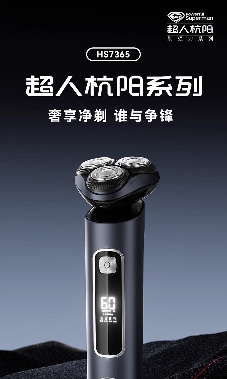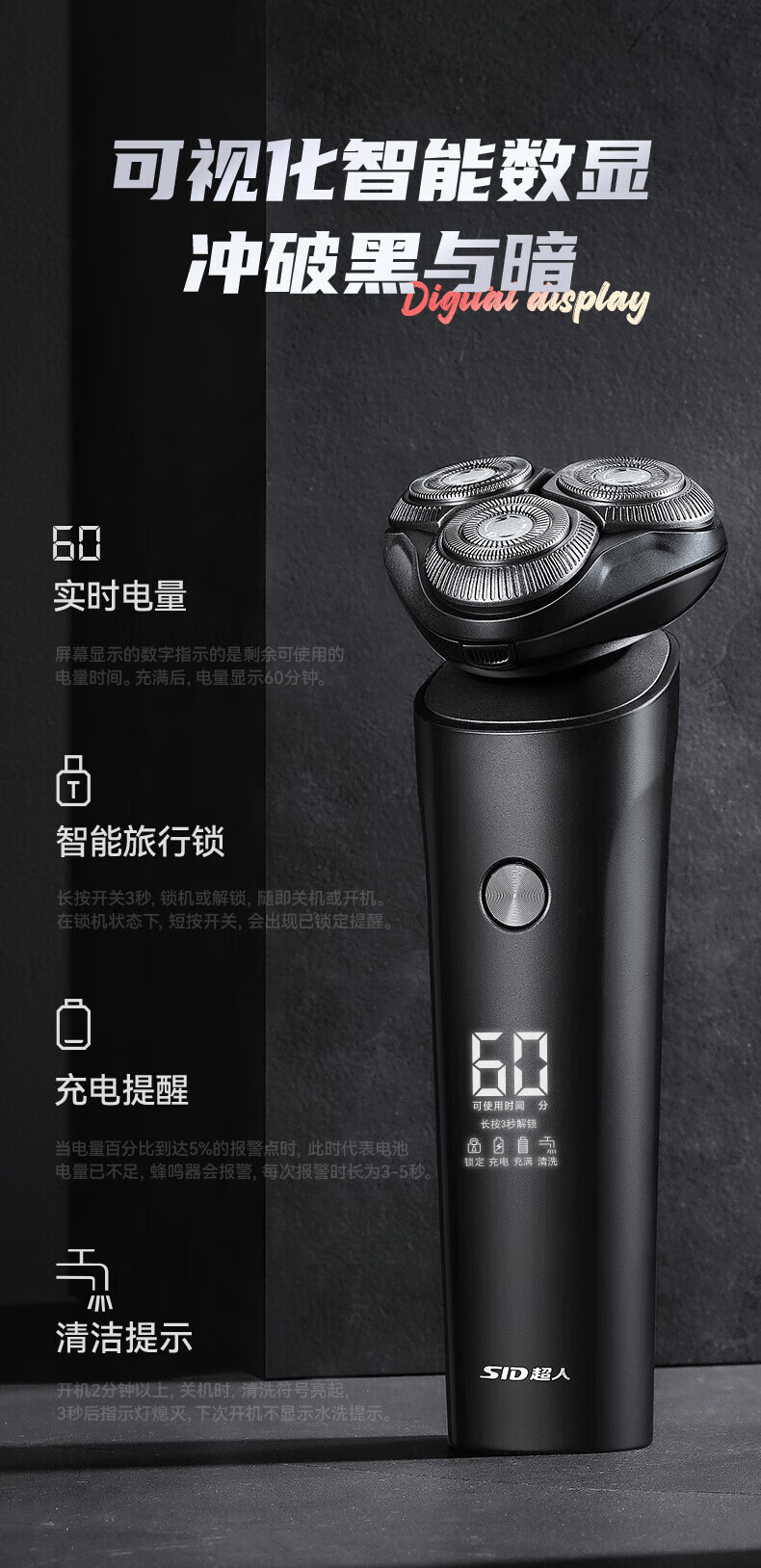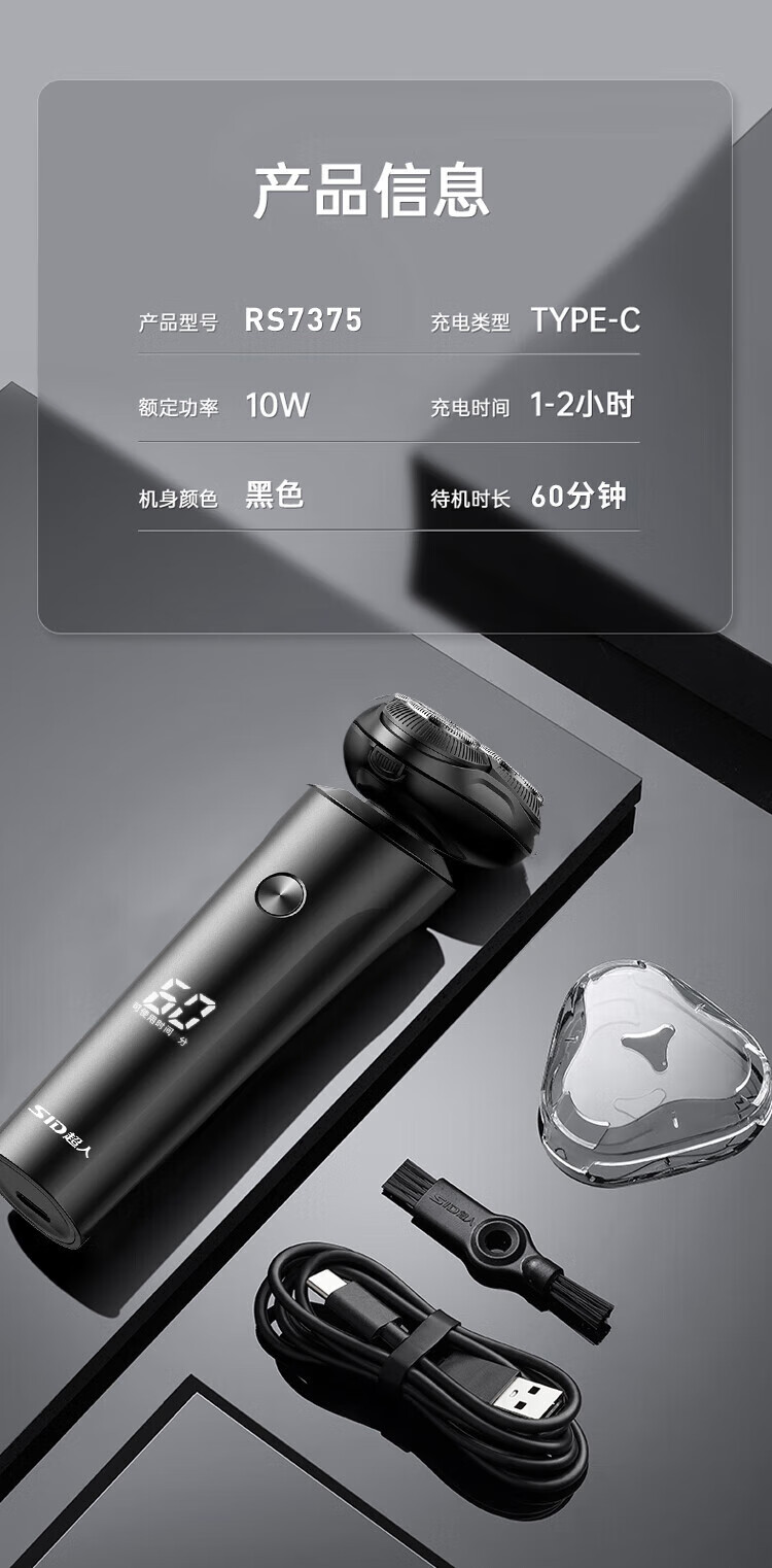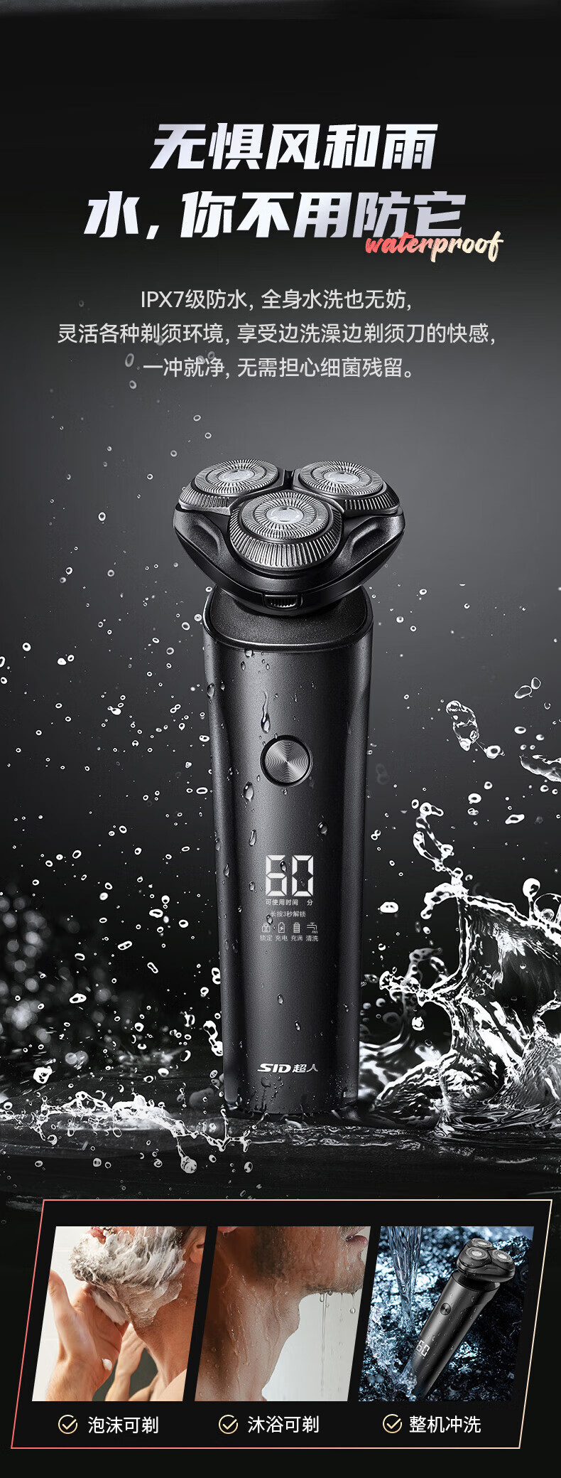 超人(SID)剃须刀男士独立浮动10W大功全机身水洗车载电动三刀头IPX7级全身水洗高性能锂电池Type-C RS7375【赠备用刀头+电动鼻毛器】