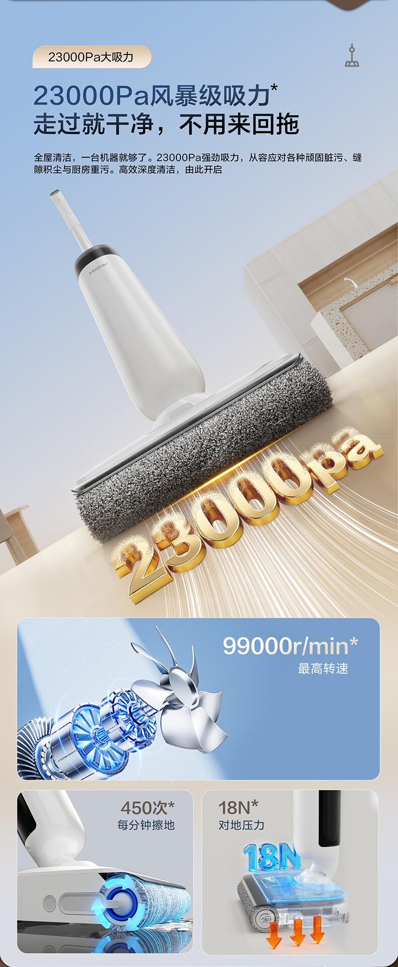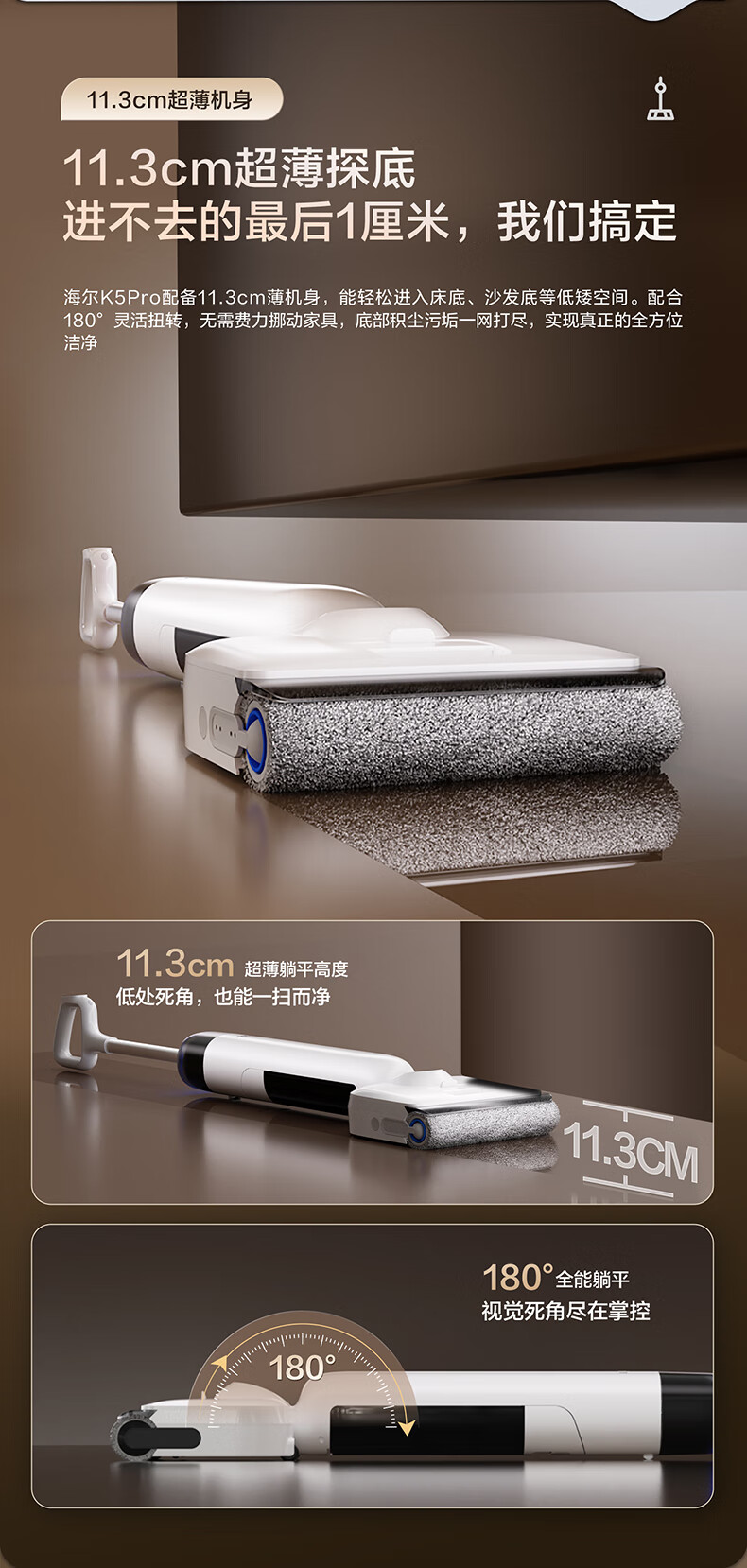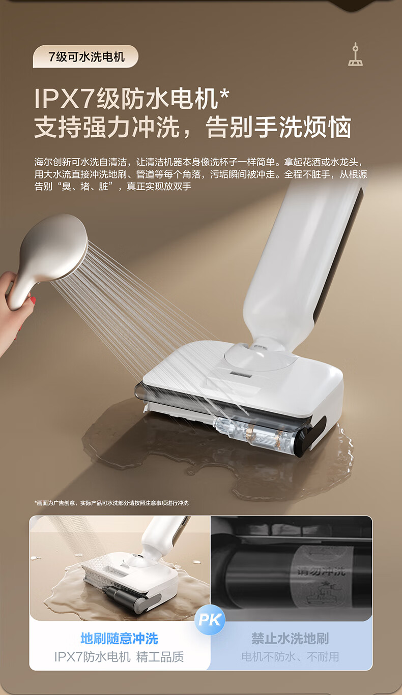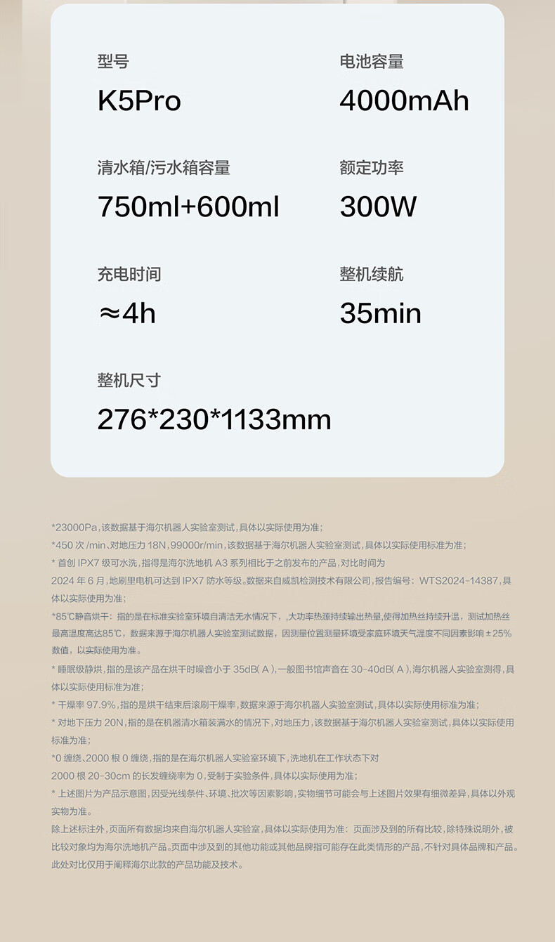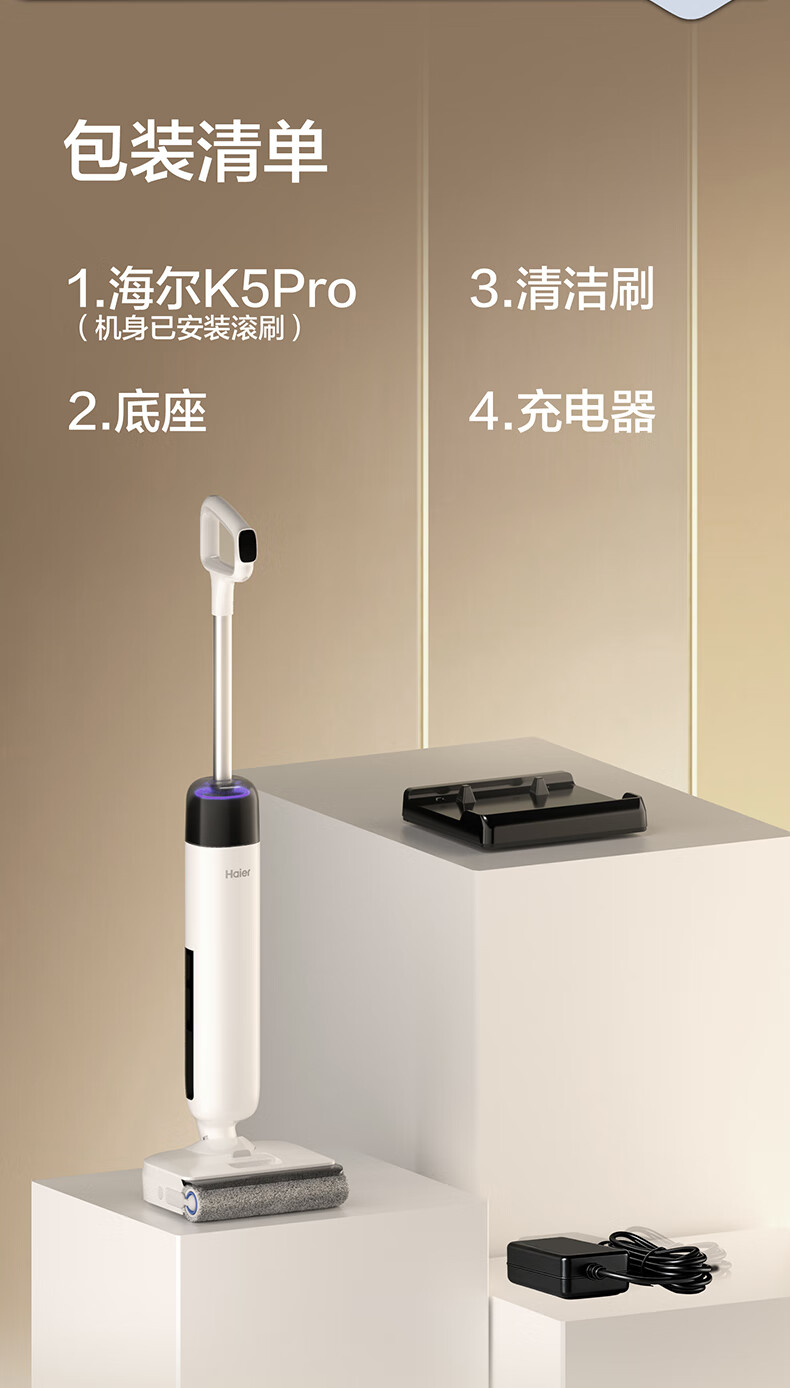 海尔洗地机K5Pro【23KPa吸力 85℃静音熨烘 0缠毛 IPX7防水】 三贴边智能家用吸拖洗一体拖地用机器人 【K5 Pro】23KPa吸力|65℃静音熨烘